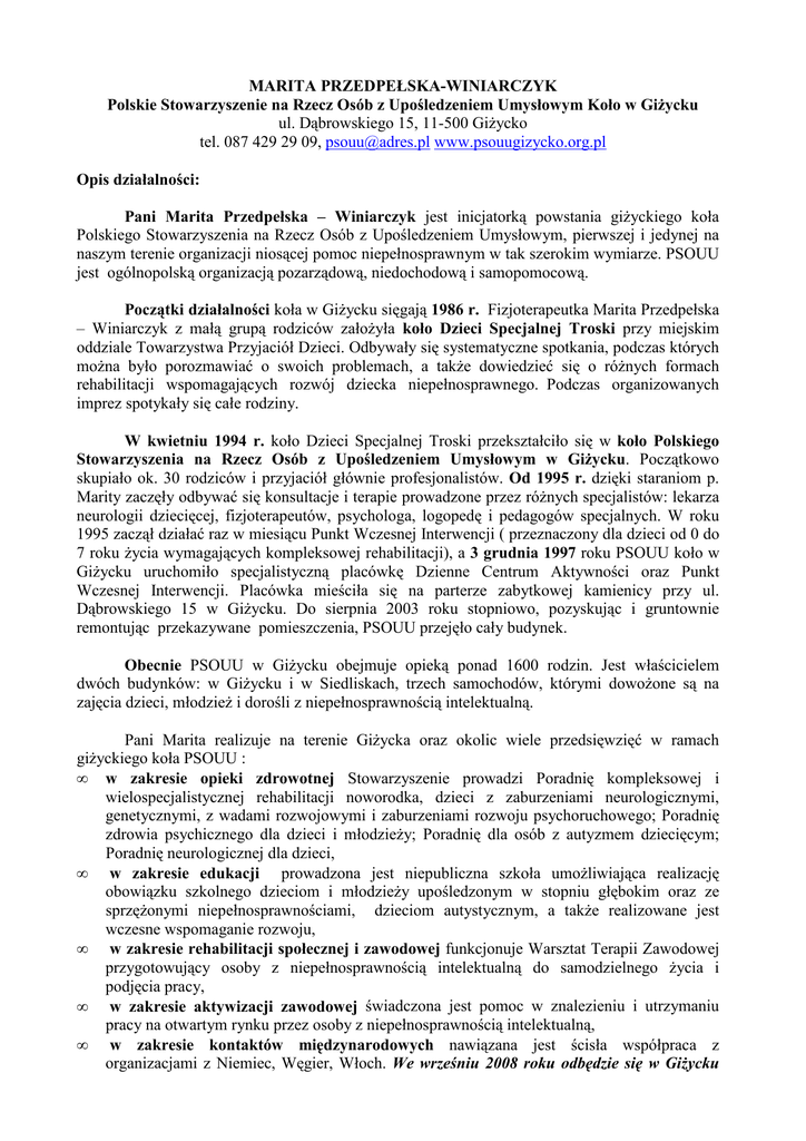 MARITA PRZEDPEŁSKA-WINIARCZYK Polskie Stowarzyszenie na Rzecz Osób z Upośledzeniem Umysłowym Koło w GiŜycku ul. Dąbrowskiego 15, 11-500 GiŜycko tel. 087 429 29 09, [email protected] www.psouugizycko.org.pl Opis działalności: Pani Marita Przedpełska – Winiarczyk jest inicjatorką powstania giŜyckiego koła Polskiego Stowarzyszenia na Rzecz Osób z Upośledzeniem Umysłowym, pierwszej i jedynej na naszym terenie organizacji niosącej pomoc niepełnosprawnym w tak szerokim wymiarze. PSOUU jest ogólnopolską organizacją pozarządową, niedochodową i samopomocową. Początki działalności koła w GiŜycku sięgają 1986 r. Fizjoterapeutka Marita Przedpełska – Winiarczyk z małą grupą rodziców załoŜyła koło Dzieci Specjalnej Troski przy miejskim oddziale Towarzystwa Przyjaciół Dzieci. Odbywały się systematyczne spotkania, podczas których moŜna było porozmawiać o swoich problemach, a takŜe dowiedzieć się o róŜnych formach rehabilitacji wspomagających rozwój dziecka niepełnosprawnego. Podczas organizowanych imprez spotykały się całe rodziny. W kwietniu 1994 r. koło Dzieci Specjalnej Troski przekształciło się w koło Polskiego Stowarzyszenia na Rzecz Osób z Upośledzeniem Umysłowym w GiŜycku. Początkowo skupiało ok. 30 rodziców i przyjaciół głównie profesjonalistów. Od 1995 r. dzięki staraniom p. Marity zaczęły odbywać się konsultacje i terapie prowadzone przez róŜnych specjalistów: lekarza neurologii dziecięcej, fizjoterapeutów, psychologa, logopedę i pedagogów specjalnych. W roku 1995 zaczął działać raz w miesiącu Punkt Wczesnej Interwencji ( przeznaczony dla dzieci od 0 do 7 roku Ŝycia wymagających kompleksowej rehabilitacji), a 3 grudnia 1997 roku PSOUU koło w GiŜycku uruchomiło specjalistyczną placówkę Dzienne Centrum Aktywności oraz Punkt Wczesnej Interwencji. Placówka mieściła się na parterze zabytkowej kamienicy przy ul. Dąbrowskiego 15 w GiŜycku. Do sierpnia 2003 roku stopniowo, pozyskując i gruntownie remontując przekazywane pomieszczenia, PSOUU przejęło cały budynek. Obecnie PSOUU w GiŜycku obejmuje opieką ponad 1600 rodzin. Jest właścicielem dwóch budynków: w GiŜycku i w Siedliskach, trzech samochodów, którymi dowoŜone są na zajęcia dzieci, młodzieŜ i dorośli z niepełnosprawnością intelektualną. Pani Marita realizuje na terenie GiŜycka oraz okolic wiele przedsięwzięć w ramach giŜyckiego koła PSOUU : • w zakresie opieki zdrowotnej Stowarzyszenie prowadzi Poradnię kompleksowej i wielospecjalistycznej rehabilitacji noworodka, dzieci z zaburzeniami neurologicznymi, genetycznymi, z wadami rozwojowymi i zaburzeniami rozwoju psychoruchowego; Poradnię zdrowia psychicznego dla dzieci i młodzieŜy; Poradnię dla osób z autyzmem dziecięcym; Poradnię neurologicznej dla dzieci, • w zakresie edukacji prowadzona jest niepubliczna szkoła umoŜliwiająca realizację obowiązku szkolnego dzieciom i młodzieŜy upośledzonym w stopniu głębokim oraz ze sprzęŜonymi niepełnosprawnościami, dzieciom autystycznym, a takŜe realizowane jest wczesne wspomaganie rozwoju, • w zakresie rehabilitacji społecznej i zawodowej funkcjonuje Warsztat Terapii Zawodowej przygotowujący osoby z niepełnosprawnością intelektualną do samodzielnego Ŝycia i podjęcia pracy, • w zakresie aktywizacji zawodowej świadczona jest pomoc w znalezieniu i utrzymaniu pracy na otwartym rynku przez osoby z niepełnosprawnością intelektualną, • w zakresie kontaktów międzynarodowych nawiązana jest ścisła współpraca z organizacjami z Niemiec, Węgier, Włoch. We wrześniu 2008 roku odbędzie się w GiŜycku • • • • • międzynarodowa konferencja organizowana przez Diakoni Stetten z Niemiec oraz PSOUU w GiŜycku Dom wielu mieszkań-Europa na drodze do włączania poświęcona aktywizacji osób z niepełnosprawnością intelektualną w róŜnych sferach Ŝycia: praca, mieszkanie, nauka i znajomość własnych praw, sport, działalność kulturalna (malarstwo, ceramika, gra w orkiestrze, teatr), ruch self-adwokatów - nauka występowania w swoim imieniu przez osoby z niepełnosprawnością intelektualną, działalność wydawnicza – publikowanie poradników dotyczących wczesnej pielęgnacji noworodka, problemów ze ssaniem, problemów dotyczących rozwoju wcześniaków, działalność kulturalna malarstwo, ceramika, teatr oraz Integracyjna Orkiestra Perkusyjna, którą tworzą podopieczni placówek prowadzonych przez Stowarzyszenie, zaprzyjaźnione dzieci ze szkół powszechnych oraz terapeuci. Większość muzyków nie zna nut, w związku z czym utwory wykonywane są w oparciu o pamięć. W chwili obecnej Orkiestra liczy 31 osób, w tym 16 osób niepełnosprawnych. W zespole dwie trzecie członków cierpi na róŜnego rodzaju upośledzenia ruchowo-umysłowe. Dla większości z nich próby orkiestry to najwaŜniejsza rzecz w Ŝyciu. „- Uparliśmy się, Ŝe utworzymy profesjonalną orkiestrę integracyjną i udało nam się - mówi Marita Przedpełska-Winiarczyk. - Gramy w oparciu o metodę Karla Orffa, niemieckiego pedagoga i kompozytora, która polega na umuzykalnianiu i usprawnianiu poprzez grę na prostych instrumentach perkusyjnych”. MoŜliwość koncertowania sprawia muzykom ogromną radość i satysfakcję oraz wynagradza wysiłek włoŜony w Ŝmudne ćwiczenia podczas prób, dlatego Orkiestra ma na swoim koncie liczne występy. Obecnie Orkiestra wykonuje głównie utwory oparte o folklor róŜnych narodów, choć równie chętnie sięga do dzieł muzyki klasycznej (V.A. Mozart, A. Vivaldi, J. Brahms). poradnictwo i pomoc rodzinom wychowującym niepełnosprawne dziecko, działania dotyczące integracji osób niepełnosprawnych ze społecznością lokalną m.in. organizacja kaŜdego roku przemarszu przez miasto i występów z okazji Dnia Godności Osób z Niepełnosprawnością Intelektualną, w którym bierze udział ok. 500 osób, w tym władze powiatu i miasta ora