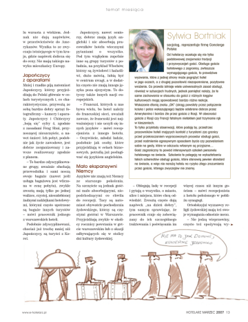 temat miesiàca lu wzrasta z wiekiem. Jednak nie dajà napiwków, w przeciwieƒstwie do Amerykanów. Wynika to ze zwyczaju istniejàcego w tym kraju, gdzie napiwek dolicza si´ do ceny. Nie majà takiego nawyku mieszkaƒcy Europy. Japoƒczycy z aparatami Mniej i rzadko pijà natomiast Japoƒczycy, którzy przyje˝d˝ajà do Polski g∏ównie w celach turystycznych i, co charakterystyczne, przywo˝à ze sobà bardzo dobry sprz´t fotograficzny – kamery i aparaty. Japoƒczycy i Chiƒczycy „bojà si´” cyfry 4, zgodnie z zasadami Feng Shui, przynoszàcej nieszcz´Êcie, a nawet Êmierç. Ich pobyt, podobnie jak ˝ycie zawodowe, jest dobrze zorganizowany i zawsze realizowany zgodnie z planem. – To bardzo zdyscyplinowane grupy, uwa˝nie s∏uchajà przewodnika i sami noszà swoje baga˝e (nawet jeÊli us∏uga baga˝owa jest wliczona w cen´ pobytu), zwykle zresztà majà tylko po jednej walizce, czystej, nieozdobionej ˝adnymi naklejkami hotelowymi, którymi cz´sto upstrzone sà baga˝e innych turystów – mówi pracownik jednego z warszawskich hoteli. Podobnie zdyscyplinowani, chocia˝ ju˝ troch´ mniej ni˝ Japoƒczycy, sà turyÊci z Korei. www.e-hotelarz.pl Japoƒczycy, nawet seniorzy, dobrze znajà j´zyk angielski i nie absorbujà pracowników hotelu wiecznymi pytaniami o wszystko. Pod tym wzgl´dem zupe∏nie inne sà grupy turystów z po∏udnia, na przyk∏ad W∏ochów, którzy sà ˝ywio∏owi i ha∏aÊliwi, du˝o mówià, lubià byç w centrum uwagi, a w dodatku cz´sto nie znajà innego j´zyka poza ojczystym. To dotyczy tak˝e innych nacji europejskich. – Francuzi, których u nas bywa wielu, bo hotel nale˝y do francuskiej sieci, uwa˝ali zawsze, ˝e francuski jest najwa˝niejszy i nie uczyli si´ innych j´zyków – mówi recepcjonista z innego hotelu. – OczywiÊcie, m∏odzi ludzie, podobnie jak osoby, które przyje˝d˝ajà w celach biznesowych, potrafià ju˝ pos∏ugiwaç si´ j´zykiem angielskim. Ma∏o ekspansywni Niemcy J´zyków nie znajà te˝ Niemcy ze starszego pokolenia. Na szcz´Êcie sà jednak goÊçmi ma∏o absorbujàcymi, niepodchodzàcymi co chwila do recepcji. Tacy sà natomiast obywatele pochodzenia ˝ydowskiego, którzy sà cz´stymi goÊçmi w Warszawie. Przyje˝d˝ajà zwykle w okolicy rocznicy powstania w getcie warszawskim lub z okazji odbywajàcych si´ w stolicy dni kultury ˝ydowskiej. Sylwia Bortniak socjolog, reprezentuje firm´ Concierge Polska Od hotelarzy oczekuje si´ nie tylko podstawowej znajomoÊci tradycji i przyzwyczajeƒ goÊci. Obs∏uga goÊcia hotelowego z zagranicy, zw∏aszcza wymagajàcego goÊcia, to prawdziwe wyzwanie, które z jednej strony mo˝e pogrà˝yç hotel w jego oczach, a z drugiej pozostawiç niezapomniane, pozytywne wra˝enie. Co prawda istnieje wiele uniwersalnych zasad obs∏ugi, równie˝ w sytuacjach trudnych, jednak pami´taç nale˝y, ˝e te same zachowania w stosunku do goÊci z ró˝nych kr´gów kulturowych mogà spowodowaç bardzo ró˝ne reakcje. Wskazanie d∏onià znaku „OK” (okràg powsta∏y przez po∏àczenie kciuka i palca wskazujàcego) b´dzie odebrane dobrze przez Amerykanina i bardzo êle przez goÊcia z Rosji. W obecnoÊci goÊcia z Rosji czy Francji fatalnym nietaktem jest trzymanie ràk w kieszeniach. To tylko przyk∏ady obserwacji, które podaj´ by, przestrzec pracowników hoteli majàcych kontakt z turystami zza granicy przed przekraczaniem wypracowanych procedur obs∏ugi goÊci, przed nadmiernie agresywnym sposobem bycia czy pozwalaniem sobie na gesty, które w odczuciu w∏asnym sà przyjazne… GoÊç zagraniczny to powód intensywnych szkoleƒ personelu hotelowego na Êwiecie. Szkolenia te polegajà na wykszta∏ceniu takich schematów obs∏ugi goÊcia, które stanowià pewien standard na Êwiecie, a wi´c nie nara˝à hotelu na ryzyko z∏ego zrozumienia przez goÊcia, którego zwyczajów nie znamy. – Oblegajà lad´ w recepcji i pytajà o wszystko, o miasto, ulice i miejsca, które chcà odwiedziç. Zresztà cz´sto dajà napiwek „na dzieƒ dobry”, tym samym sprawiajàc, ˝e pracownik czuje si´ zobowiàzany do ich szczególnego traktowania i poÊwi´cania im wi´cej czasu ni˝ innym goÊciom – mówi recepcjonista z hotelu po∏o˝onego w pobli˝u synagogi. Ortodoksyjni wyznawcy religii ˝ydowskiej majà te˝ swoje wymagania odnoÊnie menu. – Nie jedzà wieprzowiny, cz´sto te˝ spo˝ywajà wy-  HOTELARZ MARZEC 2007 13