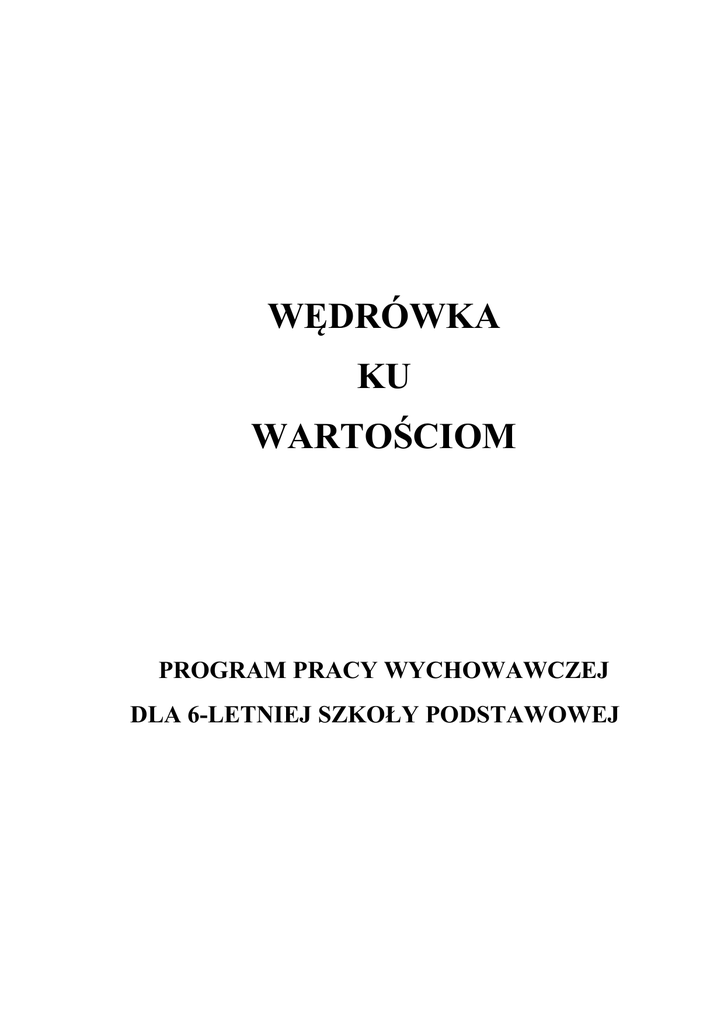 WĘDRÓWKA KU WARTOŚCIOM PROGRAM PRACY WYCHOWAWCZEJ DLA 6-LETNIEJ SZKOŁY PODSTAWOWEJ GDAŃSK 2012 1. Szczegółowe STRATEGIE DZIAŁANIA Motto: „Wychowanie jest spotkaniem osób: mistrza i ucznia, ich wspólną wędrówką ku dobru, prawdzie i pięknie” Wstęp: Nauczyciele w swej pracy wychowawczej, wspierając w tym zakresie obowiązki rodziców, będą realizowali główne zadania wychowania: intelektualnego, moralnego i zdrowotnego. Wychowanie intelektualne: Cele główne: 1. kształtowanie zdolności umysłowych człowieka; 2. zastosowanie nabytej wiedzy i umiejętności w sytuacjach typowych i problemowych; 3. stymulowanie i umożliwianie uczniom poznania i rozwijania swoich uzdolnień i zainteresowań; 4. rozwijanie myślenia analitycznego i syntetycznego; 5. traktowanie wiadomości przedmiotowych w sposób prowadzący do lepszego rozumienia świata, ludzi i siebie; integralny 6. poszukiwanie, porządkowanie i wykorzystywanie informacji z różnych źródeł. Cele pośrednie: 1. skuteczne porozumiewanie się w różnych sytuacjach, poprawne posługiwanie się językiem ojczystym, przygotowanie do publicznych wystąpień; 2. przygotowanie ucznia do samodzielnego zdobywania informacji i świadomego ich wyboru; 3. rozwijanie dociekliwości poznawczej ukierunkowanej na poszukiwanie prawdy, dobra i piękna w świecie; 4. rozwiązywanie problemów w twórczy sposób; 5. efektywne współdziałanie w zespole i praca w grupie, budowanie więzi międzyludzkich. Formy realizacji: 1. stosowanie nowoczesnych aktywizujących metod nauczania w procesie dydaktycznym; 2. zastosowanie „wędrówek kształcących” ( spotkanie z miejscem, człowiekiem i czasem) na zajęciach edukacyjnych; 3. organizowanie konkursów tematycznych; 4. rozwijanie zainteresowań, uzdolnień i talentów w kołach zainteresowań oraz innych formach zajęć pozalekcyjnych; 5. organizowanie apeli okolicznościowych; 6. przygotowanie do świadomego korzystania ze środków masowej komunikacji na zajęciach z zakresu edukacji medialnej i czytelniczej. Efekty pożądane: 1. Uczeń posiada potrzebną wiedzę do porozumiewania się w różnych sytuacjach typowych; 2. Potrafi samodzielnie zdobywać informacje i świadomie je wybierać; 3. Rozwiązuje problemy w sposób twórczy; 4. Rozwija swą dociekliwość poznawczą ukierunkowaną na poszukiwanie prawdy, dobra i piękna w świecie; 5. Poprawnie posługuje się językiem ojczystym; 6. Potrafi współdziałać w zespole. Wychowanie moralne: Cele główne: 1. Ukazywanie wartości w życiu osobistym człowieka oraz przygotowanie do zrozumienia siebie i innych (zachowanie interdependencyjne); 2. Zastosowanie feedbecku (zasady sprzężenia umiejętności oceny zachowania własnego i innych; 3. Pobudzenie uczniów do trenowania (autentyzm działań, otwartość, ufność); zdolności zwrotnego) jako psychosocjalnych 4. Przekazywanie wartości i tradycji narodowych oraz budzenie w uczniach szacunku dla państwa jako dobra wspólnego. Cele pośrednie: 1. Przestrzeganie zasad życia społecznego w duchu tolerancji i prawdy; 2. Poszanowanie godności osobistej, przeciwdziałanie chuligaństwu i aktom przemocy; 3. Przestrzeganie zasad kultury w kontaktach z rówieśnikami i w stosunku do osób starszych; 4. Kształtowanie umiejętności prawidłowego i rozwiązywania konfliktów, empatia; komunikowania się 5. Dostrzeganie potrzeb własnych i innych ludzi – wyrażanie uczuć, asertywność; 6. Umiejętne korzystanie z mass mediów – zasady i kryteria wyboru książek, czasopism, programów telewizyjnych i innych; 7. Wspieranie prawidłowego rozwoju emocjonalnego i społecznego, w tym koleżeństwa i przyjaźni. Formy realizacji: 1. Stosowanie gier i zabaw interakcyjnych na zajęciach dydaktycznych; 2. Organizowanie wyjść do teatru, kina, muzeum; 3. Uczestniczenie w pogadankach i zajęciach wspierających proces socjalizacji oraz rozwój osobowościowy dzieci (pedagog szkolny, wychowawcy); 4. Organizowanie wystaw interesujących książek i czasopism (biblioteka szkolna); 5. Wyświetlanie filmów dydaktycznych na zajęciach edukacyjnych; 6. Wspieranie prawidłowego rozwoju emocjonalnego i społecznego poprzez uczestniczenie w zajęciach wychowania do życia w rodzinie. Efekty pożądane: Uczeń: 1. Potrafi kulturalnie zachowywać się w stosunku do osób starszych i rówieśników; 2. Przestrzega zasad życia społecznego w duchu tolerancji i prawdy; 3. Dostrzega potrzeby własne i innych ludzi; 4. Reaguje na przejawy przemocy i chuligaństwa; 5. Potrafi wybierać odpowiednie dla swego wieku i zgodnie z zainteresowaniami lektury, czasopisma i programy telewizyjne; 6. Jest przyjaźnie nastawiony do świata. Wychowanie zdrowotne: Cele główne: 1. Stwarzanie warunków sprzyjających zdrowiu i bezpieczeństwu uczniów; 2. Rozwijanie poczucia odpowiedzialności za zdrowie własne i innych; 3. Wspomaganie harmonijnego rozwoju psychofizycznego uczniów; 4. Rozpoznawanie zagrożeń cywilizacyjnych i nabycie umiejętności właściwego zachowania się wobec nich; 5. Wskazywanie perspektyw zdrowego życia bez stosowania substancji uzależniających (alkohol, narkotyki itp.). Cele pośrednie: 1. Rozróżnianie czynników wpływających pozytywnie i negatywnie na zdrowie oraz rozwój psychofizyczny; 2. Poznanie zasad bezpieczeństwa na drodze, podczas gier i zabaw ruchowych, pierwsza pomoc w niektórych urazach; 3. Organizowanie i uczestniczenie w rekreacji, turystyce, zawodach sportowych; 4. Tworzenie warunków psychofizycznej; do doskonalenia sprawności i kondycji 5. Zapoznanie ze skutkami zażywania środków psychoaktywnych i innych nałogów (kl. VI i w razie potrzeb); 6. Poznanie środków toksycznych, łatwopalnych i skutków ich działania. Formy realizacji: 1. Organizowanie zajęć z profilaktyki zdrowotnej; 2. Zapraszanie specjalistów z poszczególnych dziedzin na spotkania z uczniami i rodzicami; 3. Uczestniczenie w zajęciach sportowych (gimnastyka korekcyjna, gry i zabawy
