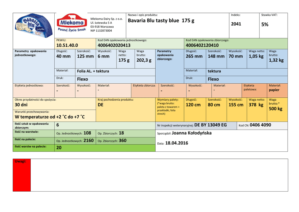 Nazwa i opis produktu: Mlekoma Dairy Sp. z o.o. Ul. Łotewska 5 A 03-918 Warszawa NIP 1132873004 Parametry opakowania jednostkowego: Etykieta jednostkowa: PKWiU: Kod EAN opakowania jednostkowego: Kod EAN opakowania zbiorczego: 10.51.40.0 4006402020413 4006402120410 Długość: Szerokość: Wysokość: 40 mm 125 mm 6 mm Materiał: Waga brutto: 175 g 202,3 g 148 mm 70 mm Folia AL. + tektura Materiał: tektura Druk: Flexo Druk: Flexo Szerokość: Wysokość: Materiał: - - - Uwagi: Materiał: - - - 1,05 kg Etykieta paletowa: Szerokość: Wysokość: Waga netto: DE 120 cm 80 cm 155 cm 378 kg Op. Jednostkowych: 108 Op. Zbiorczych: 18 Op. Jednostkowych: 2160 Op. Zbiorczych: 360 Sporządził: Joanna Data: BY 13049 EG Kołodyńska 18.04.2016 Kod CN: 0406 1,32 kg papier Długość: Nr inspekcji weterynaryjnej: DE Waga brutto: Materiał: (*waga brutto: paleta z towarem + przekładki, folia strech) 6 20 Wysokość: Waga netto: Wymiary palety: W temperaturze od +2 ˚C do +7 ˚C Ilość warstw na palecie: Szerokość: Wysokość: Kraj pochodzenia produktu: Warunki przechowywania: Ilość na palecie: 5% 265 mm Etykieta zbiorcza: Parametry opakowania zbiorczego: 2041 Szerokość: 30 dni Waga netto: Stawka VAT: Długość: Okres przydatności do spożycia: Ilość sztuk w opakowaniu zbiorczym: Ilość na warstwie: Bavaria Blu tasty blue 175 g Indeks: Waga brutto:* 500 kg 4090