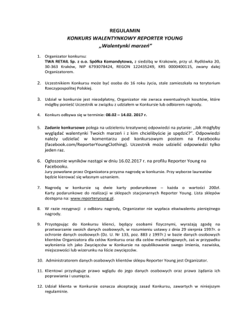 REGULAMIN KONKURS WALENTYNKOWY REPORTER YOUNG „Walentynki marzeń” 1. Organizator konkursu: TWA RETAIL Sp. z o.o. Spółka Komandytowa, z siedzibą w Krakowie, przy ul. Rydlówka 20, 30-363 Kraków, NIP 6793078424, REGON 122435249, KRS 0000400115, zwany dalej Organizatorem. 2. Uczestnikiem Konkursu może być osoba do 16 roku życia, stale zamieszkała na terytorium Rzeczypospolitej Polskiej. 3. Udział w konkursie jest nieodpłatny, Organizator nie zwraca ewentualnych kosztów, które mógłby ponieść Uczestnik w związku z udziałem w Konkursie lub odbiorem nagrody. 4. Konkurs odbywa się w terminie: 08.02 – 14.02. 2017 r. 5. Zadanie konkursowe polega na udzieleniu kreatywnej odpowiedzi na pytanie: „Jak mogłyby wyglądać walentynki Twoich marzeń i z kim chcielibyście je spędzić?”. Odpowiedzi należy udzielać w komentarzu pod konkursowym postem na Facebooku (facebook.com/ReporterYoungClothing). Uczestnik może udzielić odpowiedzi tylko jeden raz. 6. Ogłoszenie wyników nastąpi w dniu 16.02.2017 r. na profilu Reporter Young na Facebooku. Jury powołane przez Organizatora przyzna nagrodę w konkursie. Przy wyborze laureatów będzie kierować się własnym uznaniem. 7. Nagrodą w konkursie są dwie karty podarunkowe – każda o wartości 200zł. Karty podarunkowe do realizacji w sklepach stacjonarnych Reporter Young. Lista sklepów dostępna na: www.reporteryoung.pl. 8. W razie rezygnacji z odbioru nagrody, Organizator nie wypłaca ekwiwalentu pieniężnego nagrody. 9. Przystępując do Konkursu klienci, będący osobami fizycznymi, wyrażają zgodę na przetwarzanie swoich danych osobowych, w rozumieniu ustawy z dnia 29 sierpnia 1997r. o ochronie danych osobowych (Dz. U. Nr 133, poz. 883 z 1997r.) w bazie danych osobowych klientów Organizatora dla celów Konkursu oraz dla celów marketingowych, zaś w przypadku wyłonienia ich jako Zwycięzców w Konkursie na opublikowanie swego imienia, nazwiska, miejscowości lub wizerunku na liście zwycięzców. 10. Administratorem danych osobowych klientów sklepu Reporter Young jest Organizator. 11. Klientowi przysługuje prawo wglądu do jego danych osobowych oraz prawo żądania ich poprawiania i usunięcia. 12. Udział klienta w Konkursie oznacza akceptację zasad Konkursu, zawartych w niniejszym regulaminie. 13. Regulamin jest jedynym dokumentem określającym zasady Konkursu. Jest dostępny w siedzibie głównej Organizatora w Krakowie oraz na www.reporteryoung.pl 14. Wszelkie spory mogące wyniknąć w związku z realizacją Konkursu będą rozstrzygane przez sąd właściwy miejscowo dla Organizatora według przepisów kodeksu postępowania cywilnego. 15. W sprawach nieuregulowanych regulaminem stosuje się odpowiednio przepisy Kodeksu Cywilnego. 16. Organizator zastrzega sobie prawo do zmiany postanowień regulaminu, o ile nie wpłynie to na pogorszenie warunków uczestnictwa w Konkursie. Zmiana obowiązywać będzie klientów, biorących udział w Konkursie. 17. Ostateczna interpretacja zapisów treści regulaminu Konkursu należy do Organizatora Konkursu. 18. Organizator zastrzega sobie prawo zawieszenia lub zaprzestania organizacji Konkursu, bez konieczności poinformowania klientów. W przypadku zawieszenia lub zaprzestania organizacji Konkursu klientom nie przysługują względem Organizatora żadne roszczenia, w szczególności klientowi nie przysługuje prawo żądania nagrody lub zwrotu kosztu udziału w Konkursie. Powyższe zastrzeżenie nie dotyczy klientów, którzy spełnili warunki do otrzymania nagrody przed dniem zawieszenia lub zaprzestania organizacji Konkursu. Nagrody zostaną przyznane zgodnie z postanowieniami obowiązującymi na dzień przed zawieszeniem lub zaprzestaniem organizacji Konkursu. 19. Dodatkowe informacje o konkursie można uzyskać w sklepach stacjonarnych Reporter Young, na stronie www.reporteryoung.pl oraz profilu marki Reporter Young na Facebooku. Kraków, 07.02.2017