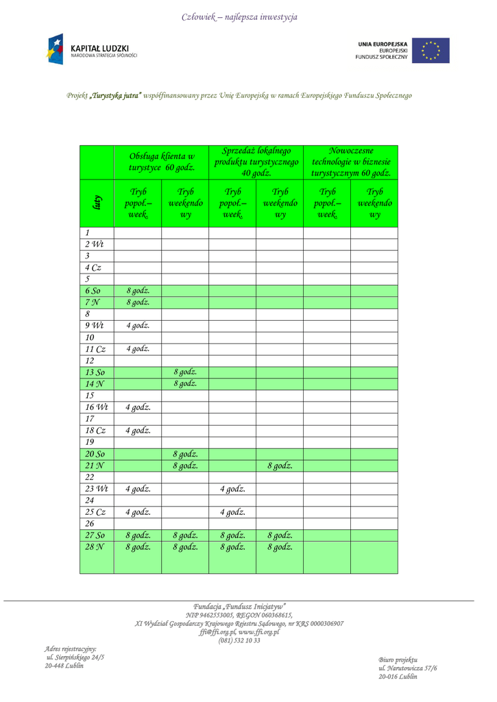 Człowiek – najlepsza inwestycja Projekt „Turystyka jutra” współfinansowany przez Unię Europejską w ramach Europejskiego Funduszu Społecznego luty Obsługa klienta w turystyce 60 godz. 1 2 Wt 3 4 Cz 5 6 So 7N 8 9 Wt 10 11 Cz 12 13 So 14 N 15 16 Wt 17 18 Cz 19 20 So 21 N 22 23 Wt 24 25 Cz 26 27 So 28 N Tryb popoł.– week. Tryb weekendo wy Sprzedaż lokalnego produktu turystycznego 40 godz. Tryb popoł.– week. Tryb weekendo wy Nowoczesne technologie w biznesie turystycznym 60 godz. Tryb popoł.– week. Tryb weekendo wy 8 godz. 8 godz. 4 godz. 4 godz. 8 godz. 8 godz. 4 godz. 4 godz. 8 godz. 8 godz. 8 godz. 4 godz. 4 godz. 4 godz. 4 godz. 8 godz. 8 godz. 8 godz. 8 godz. 8 godz. 8 godz. 8 godz. 8 godz. Fundacja „Fundusz Inicjatyw” NIP 9462553005, REGON 060368615, XI Wydział Gospodarczy Krajowego Rejestru Sądowego, nr KRS 0000306907 [email protected], www.ffi.org.pl (081) 532 10 33 Adres rejestracyjny: ul. Sierpińskiego 24/5 20-448 Lublin Biuro projektu ul. Narutowicza 57/6 20-016 Lublin Człowiek – najlepsza inwestycja Projekt „Turystyka jutra” współfinansowany przez Unię Europejską w ramach Europejskiego Funduszu Społecznego marzec Obsługa klienta w turystyce 60 godz. 1 2 Wt 3 4 Cz 5 6 So 7N 8 9 Wt 10 11 Cz 12 13 So 14 N 15 16 Wt 17 18 Cz 19 20 So 21 N 22 23 Wt 24 25 Cz 26 27 So Tryb popoł.– week. Tryb weekendo wy 4 godz. (w tym egzamin) Sprzedaż lokalnego produktu turystycznego 40 godz. Tryb popoł.– week. Nowoczesne technologie w biznesie turystycznym 60 godz. Tryb weekendo wy Tryb popoł.– week. 8 godz. 8 godz. 8 godz. (w tym egzamin) 8 godz. Tryb weekendo wy 4 godz. 4 godz. 8 godz. 8 godz. (w tym egzamin) 4 godz.(w tym egzamin) . 4 godz. 4 godz. 8 godz. 8 godz. 4 godz. 4 godz. 8 godz. 6 godz. 8 godz. 8 godz. 4 godz. 4 godz. 8 godz. Fundacja „Fundusz Inicjatyw” NIP 9462553005, REGON 060368615, XI Wydział Gospodarczy Krajowego Rejestru Sądowego, nr KRS 0000306907 [email protected], www.ffi.org.pl (081) 532 10 33 Adres rejestracyjny: ul. Sierpińskiego 24/5 20-448 Lublin Biuro projektu ul. Narutowicza 57/6 20-016 Lublin Człowiek – najlepsza inwestycja Projekt „Turystyka jutra” współfinansowany przez Unię Europejską w ramach Europejskiego Funduszu Społecznego 28 N 29 30 Wt 31 8 godz. 4 godz. kwiecień Obsługa klienta w turystyce 60 godz. Tryb popoł.– week. Tryb weekendo wy Sprzedaż lokalnego produktu turystycznego 40 godz. Tryb popoł.– week. Tryb weekendo wy 1 Cz Nowoczesne technologie w biznesie turystycznym 60 godz. Tryb popoł.– week. Tryb weekendo wy 2 godz. (w tym egzamin) 2 3 So 4N 5 6 Wt 7 8 Cz 9 10 So 11 N 8 godz. 4 godz.(w tym egzamin) Fundacja „Fundusz Inicjatyw” NIP 9462553005, REGON 060368615, XI Wydział Gospodarczy Krajowego Rejestru Sądowego, nr KRS 0000306907 [email protected], www.ffi.org.pl (081) 532 10 33 Adres rejestracyjny: ul. Sierpińskiego 24/5 20-448 Lublin Biuro projektu ul. Narutowicza 57/6 20-016 Lublin