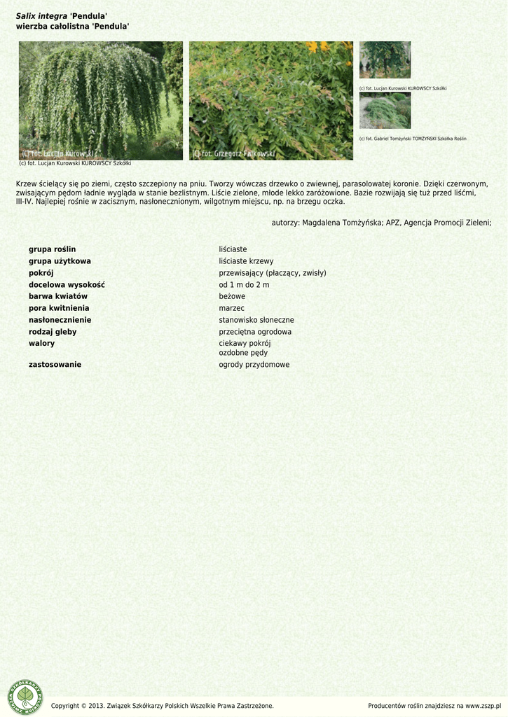 Salix integra 'Pendula' wierzba całolistna 'Pendula' (c) fot. Lucjan Kurowski KUROWSCY Szkółki (c) fot. Gabriel Tomżyński TOMŻYŃSKI Szkółka Roślin (c) fot. Lucjan Kurowski KUROWSCY Szkółki Krzew ścielący się po ziemi, często szczepiony na pniu. Tworzy wówczas drzewko o zwiewnej, parasolowatej koronie. Dzięki czerwonym, zwisającym pędom ładnie wygląda w stanie bezlistnym. Liście zielone, młode lekko zaróżowione. Bazie rozwijają się tuż przed liśćmi, III-IV. Najlepiej rośnie w zacisznym, nasłonecznionym, wilgotnym miejscu, np. na brzegu oczka. autorzy: Magdalena Tomżyńska; APZ, Agencja Promocji Zieleni; grupa roślin liściaste grupa użytkowa liściaste krzewy pokrój przewisający (płaczący, zwisły) docelowa wysokość od 1 m do 2 m barwa kwiatów beżowe pora kwitnienia marzec nasłonecznienie stanowisko słoneczne rodzaj gleby przeciętna ogrodowa walory ciekawy pokrój ozdobne pędy zastosowanie ogrody przydomowe Copyright © 2013. Związek Szkółkarzy Polskich Wszelkie Prawa Zastrzeżone. Producentów roślin znajdziesz na www.zszp.pl