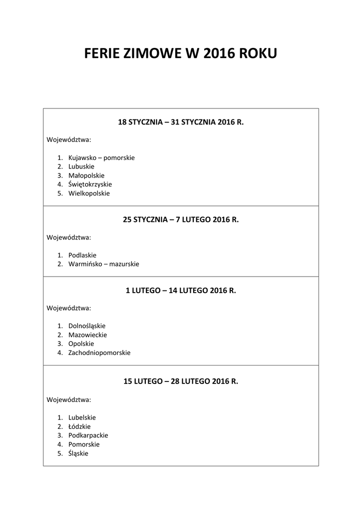 FERIE ZIMOWE W 2016 ROKU 18 STYCZNIA – 31 STYCZNIA 2016 R. Województwa: 1. 2. 3. 4. 5. Kujawsko – pomorskie Lubuskie Małopolskie Świętokrzyskie Wielkopolskie 25 STYCZNIA – 7 LUTEGO 2016 R. Województwa: 1. Podlaskie 2. Warmińsko – mazurskie 1 LUTEGO – 14 LUTEGO 2016 R. Województwa: 1. 2. 3. 4. Dolnośląskie Mazowieckie Opolskie Zachodniopomorskie 15 LUTEGO – 28 LUTEGO 2016 R. Województwa: 1. 2. 3. 4. 5. Lubelskie Łódzkie Podkarpackie Pomorskie Śląskie