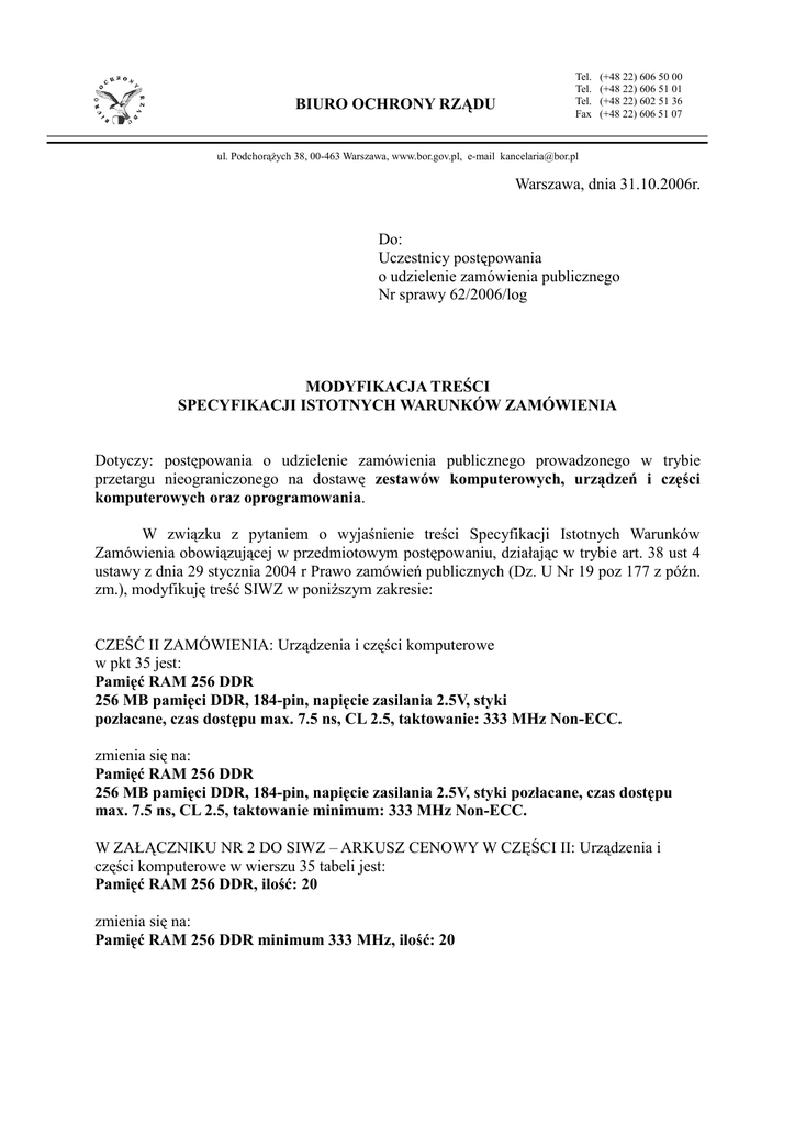 BIURO OCHRONY RZĄDU Tel. Tel. Tel. Fax (+48 22) 606 50 00 (+48 22) 606 51 01 (+48 22) 602 51 36 (+48 22) 606 51 07 ul. PodchorąŜych 38, 00-463 Warszawa, www.bor.gov.pl, e-mail [email protected] Warszawa, dnia 31.10.2006r. Do: Uczestnicy postępowania o udzielenie zamówienia publicznego Nr sprawy 62/2006/log MODYFIKACJA TREŚCI SPECYFIKACJI ISTOTNYCH WARUNKÓW ZAMÓWIENIA Dotyczy: postępowania o udzielenie zamówienia publicznego prowadzonego w trybie przetargu nieograniczonego na dostawę zestawów komputerowych, urządzeń i części komputerowych oraz oprogramowania. W związku z pytaniem o wyjaśnienie treści Specyfikacji Istotnych Warunków Zamówienia obowiązującej w przedmiotowym postępowaniu, działając w trybie art. 38 ust 4 ustawy z dnia 29 stycznia 2004 r Prawo zamówień publicznych (Dz. U Nr 19 poz 177 z późn. zm.), modyfikuję treść SIWZ w poniŜszym zakresie: CZEŚĆ II ZAMÓWIENIA: Urządzenia i części komputerowe w pkt 35 jest: Pamięć RAM 256 DDR 256 MB pamięci DDR, 184-pin, napięcie zasilania 2.5V, styki pozłacane, czas dostępu max. 7.5 ns, CL 2.5, taktowanie: 333 MHz Non-ECC. zmienia się na: Pamięć RAM 256 DDR 256 MB pamięci DDR, 184-pin, napięcie zasilania 2.5V, styki pozłacane, czas dostępu max. 7.5 ns, CL 2.5, taktowanie minimum: 333 MHz Non-ECC. W ZAŁĄCZNIKU NR 2 DO SIWZ – ARKUSZ CENOWY W CZĘŚCI II: Urządzenia i części komputerowe w wierszu 35 tabeli jest: Pamięć RAM 256 DDR, ilość: 20 zmienia się na: Pamięć RAM 256 DDR minimum 333 MHz, ilość: 20