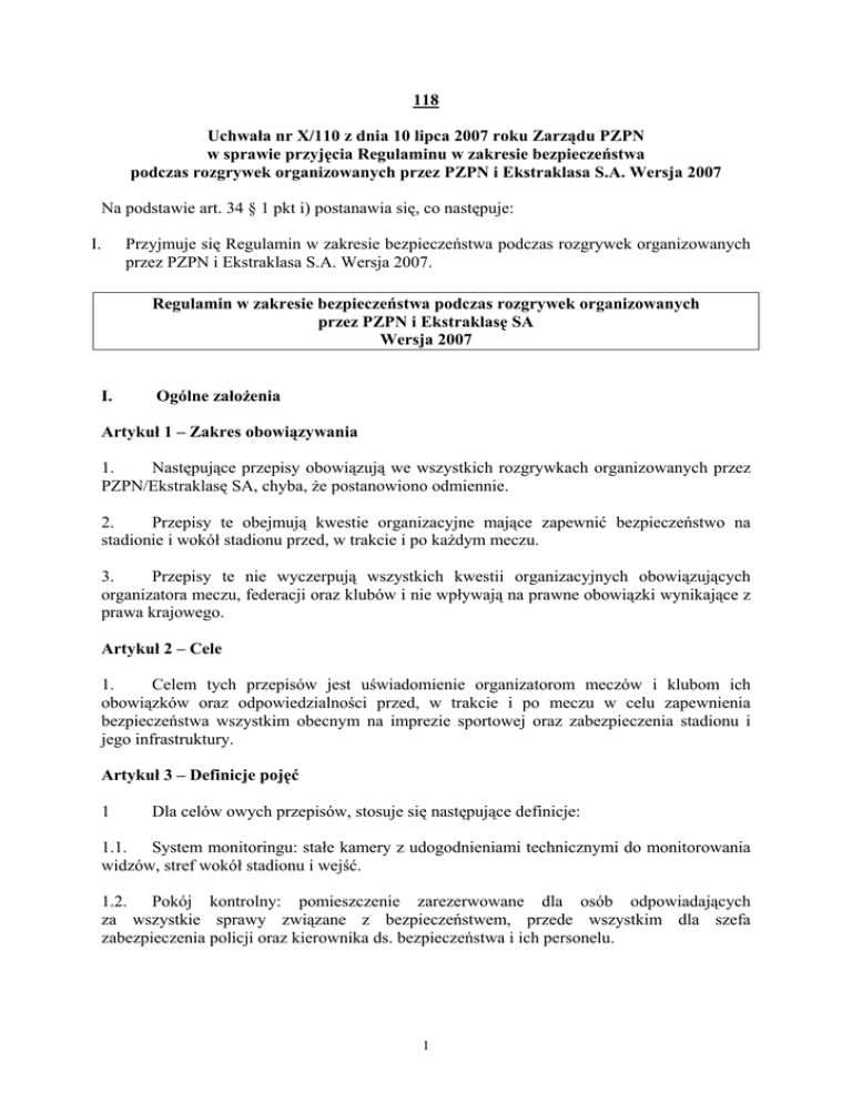 118 Uchwała nr X/110 z dnia 10 lipca 2007 roku Zarządu PZPN w sprawie przyjęcia Regulaminu w zakresie bezpieczeństwa podczas rozgrywek organizowanych przez PZPN i Ekstraklasa S.A. Wersja 2007 Na podstawie art. 34 § 1 pkt i) postanawia się, co następuje: I. Przyjmuje się Regulamin w zakresie bezpieczeństwa podczas rozgrywek organizowanych przez PZPN i Ekstraklasa S.A. Wersja 2007. Regulamin w zakresie bezpieczeństwa podczas rozgrywek organizowanych przez PZPN i Ekstraklasę SA Wersja 2007 I. Ogólne założenia Artykuł 1 – Zakres obowiązywania 1. Następujące przepisy obowiązują we wszystkich rozgrywkach organizowanych przez PZPN/Ekstraklasę SA, chyba, że postanowiono odmiennie. 2. Przepisy te obejmują kwestie organizacyjne mające zapewnić bezpieczeństwo na stadionie i wokół stadionu przed, w trakcie i po każdym meczu. 3. Przepisy te nie wyczerpują wszystkich kwestii organizacyjnych obowiązujących organizatora meczu, federacji oraz klubów i nie wpływają na prawne obowiązki wynikające z prawa krajowego. Artykuł 2 – Cele 1. Celem tych przepisów jest uświadomienie organizatorom meczów i klubom ich obowiązków oraz odpowiedzialności przed, w trakcie i po meczu w celu zapewnienia bezpieczeństwa wszystkim obecnym na imprezie sportowej oraz zabezpieczenia stadionu i jego infrastruktury. Artykuł 3 – Definicje pojęć 1 Dla celów owych przepisów, stosuje się następujące definicje: 1.1. System monitoringu: stałe kamery z udogodnieniami technicznymi do monitorowania widzów, stref wokół stadionu i wejść. 1.2. Pokój kontrolny: pomieszczenie zarezerwowane dla osób odpowiadających za wszystkie sprawy związane z bezpieczeństwem, przede wszystkim dla szefa zabezpieczenia policji oraz kierownika ds. bezpieczeństwa i ich personelu. 1 1.3. Awaryjny system oświetlenia: system który zapewnia podtrzymanie oświetlenia w wypadku awarii zasilania, w tym podświetlenie wyjść ewakuacyjnych w celu zapewnienia bezpieczeństwa i wskazania drogi widzom. 1.4. Organizator meczu: klub lub inny podmiot odpowiedzialny za organizację meczu rozegranego na neutralnym terenie, niezależnie od tego czy jej drużyna bierze w nim udział. 1.5. Policja: służby publiczne odpowiedzialne za zabezpieczenie porządku publicznego i bezpieczeństwa meczu. 1.6. System nagłośnienia: elektroniczny system głośników zdolny do przekazywania jasnych komunikatów do wszystkich widzów. 1.7. Służby publiczne: wszystkie krajowe lub lokalne służby odpowiedzialne za sprawy bezpieczeństwa (policja, pogotowie i służby medyczne, straż pożarna etc.). 1.8. Służby ochrony: funkcjonariusze służb ochrony wyznaczone przez organizatora meczu mające pomóc, aby na stadionie nie dochodziło do żadnych incydentów. 1.9. Stewardzi: wszystkie inne prywatne służby wyznaczone przez organizatora meczu mające pomóc, aby na stadionie nie dochodziło do żadnych incydentów Artykuł 4 – Wyznaczenie kierownika ds. bezpieczeństwa 1. Każdy klub musi wyznaczyć kierownika ds. bezpieczeństwa, aby: 1.1 był w bliskim kontakcie z kibicami i był zaznajomiony z ich zwyczajami. 1.2. był w stanie stworzyć – we współpracy z policją – akta znanych osób sprawiających kłopoty i używał ich we współpracy ze swoimi odpowiednikami w innych klubach, firmami przewozowymi, stowarzyszeniami kibiców, służbami policyjnymi itp. 2. Kierownik ds. bezpieczeństwa musi mieć doświadczenie w sprawach związanych z kontrolą tłumu, bezpieczeństwem na obiektach piłkarskich, publicznych zamówieniach, biletach i organizacją meczu. 3. Klub może wyznaczyć inną osobę niż kierownik ds. bezpieczeństwa, która będzie odpowiedzialna za kontakty z kibicami. Osoba ta musi działać w strukturach klubu i ściśle współpracować z kierownikiem ds. bezpieczeństwa i innymi przedstawicielami klubu. Artykuł 5 – Stosunki ze stowarzyszeniami kibiców 1. Kluby muszą wspierać i rozwijać dobre stosunki z ich oficjalnymi i zarejestrowanymi stowarzyszeniami kibiców poprzez: 1.1 zachęcanie ich do rozwijania i utrzymywania bliskiej współpracy z klubami 1.2. zachęcanie ich do wyznaczania stewardów spośród ich członków żeby pomagali przy informowaniu kibiców na meczach i towarzyszyli kibicom jeżdżącym na mecze wyjazdowe 1.3. informowanie o ich istnieniu jako oficjalnych przedstawicielstw kibiców 1.4. traktowanie ich preferencyjnie przy dystrybucji biletów 2 1.5. organizowanie wycieczek po stadionie, spotkań z piłkarzami i władzami klubowymi oraz innych podobnych wydarzeń 1.6. oferowanie pomocy przy wyjazdach zagranicznych, włączając w to wyznaczenie osoby do kontaktowania się w sytuacjach awaryjnych za granicą 1.7. pozostawanie w kontakcie ze stowarzyszeniami poprzez informacje e-mail/newslettery bądź inne wygodne środki komunikacyjne. 2. Kluby muszą wymagać od stowarzyszeń by kładły nacisk na standardy dobrego zachowania swoich członków oraz by wykluczały członkostwo osób zaangażowanych w jakiekolwiek formy chuligaństwa czy antyspołecznego zachowania. 3. Kluby muszą nalegać by stowarzyszenia kibiców podejmowały skuteczne próby w celu zapewnienia nie zabierania i spożywania alkoholu podczas wyjazdów zorganizowanych. II Przygotowania do meczów Rozdział 1: Współpraca Artykuł 6 – Obowiązek współpracy ze służbami publicznymi 1. Przed meczem organizator musi skontaktować się ze służbami zapewniającymi bezpieczeństwo żeby upewnić się, ze wszystkie środki bezpieczeństwa zawarte w tych przepisach zostaną wdrożone 2. Organizator meczu oraz kluby muszą zrobić wszystko co w ich mocy, aby: 2.1. umożliwić (przede wszystkim policji) przeprowadzenie skutecznej wymiany informacji 2.2 zapobiec wyjazdowi na mecz znanym i potencjalnym osobom sprawiającym kłopoty (we współpracy z policją i stowarzyszeniami kibiców). 3. Zainteresowane kluby/organizatorzy muszą w pełni współpracować. Artykuł 7 – Identyfikacja osób odpowied