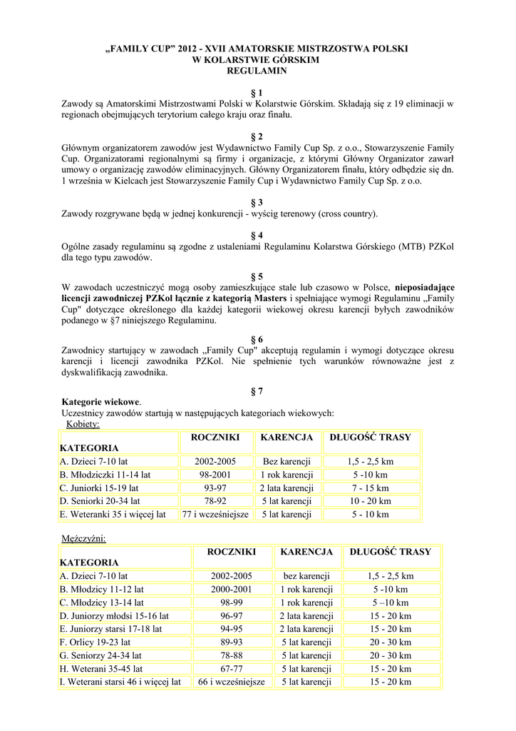„FAMILY CUP” 2012 - XVII AMATORSKIE MISTRZOSTWA POLSKI W KOLARSTWIE GÓRSKIM REGULAMIN §1 Zawody są Amatorskimi Mistrzostwami Polski w Kolarstwie Górskim. Składają się z 19 eliminacji w regionach obejmujących terytorium całego kraju oraz finału. §2 Głównym organizatorem zawodów jest Wydawnictwo Family Cup Sp. z o.o., Stowarzyszenie Family Cup. Organizatorami regionalnymi są firmy i organizacje, z którymi Główny Organizator zawarł umowy o organizację zawodów eliminacyjnych. Główny Organizatorem finału, który odbędzie się dn. 1 września w Kielcach jest Stowarzyszenie Family Cup i Wydawnictwo Family Cup Sp. z o.o. §3 Zawody rozgrywane będą w jednej konkurencji - wyścig terenowy (cross country). §4 Ogólne zasady regulaminu są zgodne z ustaleniami Regulaminu Kolarstwa Górskiego (MTB) PZKol dla tego typu zawodów. §5 W zawodach uczestniczyć mogą osoby zamieszkujące stale lub czasowo w Polsce, nieposiadające licencji zawodniczej PZKol łącznie z kategorią Masters i spełniające wymogi Regulaminu „Family Cup" dotyczące określonego dla każdej kategorii wiekowej okresu karencji byłych zawodników podanego w §7 niniejszego Regulaminu. §6 Zawodnicy startujący w zawodach „Family Cup" akceptują regulamin i wymogi dotyczące okresu karencji i licencji zawodnika PZKol. Nie spełnienie tych warunków równoważne jest z dyskwalifikacją zawodnika. §7 Kategorie wiekowe. Uczestnicy zawodów startują w następujących kategoriach wiekowych: Kobiety: ROCZNIKI KARENCJA DŁUGOŚĆ TRASY KATEGORIA A. Dzieci 7-10 lat 2002-2005 Bez karencji 1,5 - 2,5 km B. Młodziczki 11-14 lat 98-2001 1 rok karencji 5 -10 km C. Juniorki 15-19 lat 93-97 2 lata karencji 7 - 15 km D. Seniorki 20-34 lat 78-92 5 lat karencji 10 - 20 km E. Weteranki 35 i więcej lat 77 i wcześniejsze 5 lat karencji 5 - 10 km Mężczyźni: KATEGORIA A. Dzieci 7-10 lat B. Młodzicy 11-12 lat C. Młodzicy 13-14 lat D. Juniorzy młodsi 15-16 lat E. Juniorzy starsi 17-18 lat F. Orlicy 19-23 lat G. Seniorzy 24-34 lat H. Weterani 35-45 lat I. Weterani starsi 46 i więcej lat ROCZNIKI KARENCJA DŁUGOŚĆ TRASY 2002-2005 2000-2001 98-99 96-97 94-95 89-93 78-88 67-77 66 i wcześniejsze bez karencji 1 rok karencji 1 rok karencji 2 lata karencji 2 lata karencji 5 lat karencji 5 lat karencji 5 lat karencji 5 lat karencji 1,5 - 2,5 km 5 -10 km 5 –10 km 15 - 20 km 15 - 20 km 20 - 30 km 20 - 30 km 15 - 20 km 15 - 20 km Karencja oznacza przerwę w startach Począwszy od 2005 r. w czasie finału ogólnopolskiego wprowadza się nową kategorię wiekową mężczyzn: + 56 lat ( tj. roczniki 56 i wcześniejsze). Warunkiem jest udział, co najmniej 15 zawodników. Kategoria ta jedzie we wspólnym wyścigu z grupą + 46. §8 Klasyfikacja. Wyścigi odbywają się według klasyfikacji indywidualnej i rodzinnej. Z każdej eliminacji do finału przechodzi pierwsze 6 osób z każdej kategorii oraz 6 najlepszych rodzin, nawet, jeżeli nikt z członków danej rodziny nie zajmie indywidualnie miejsca uprawniającego go do udziału w finale. Tylko osoby uczestniczące w eliminacjach – mistrzostwach regionalnych mają prawo startu w finale ogólnopolskim. *Organizator główny zastrzega sobie możliwość przyznania „dzikich kart” uczestnictwa w finale. §9 Trasa wyścigu. Trasa wyścigu powinna przebiegać w miarę możliwości po drogach i ścieżkach leśnych, polnych, gruntowych lub piaszczystych. Maksymalnie 15% trasy wyścigu może przebiegać po nawierzchniach utwardzonych (asfaltowych, brukowych itp.). Zalecana długość pętli powinna wynosić dla zawodów eliminacyjnych max. 1,5 – 2,5 km, dla zawodów finałowych max. 3 - 4 km. § 10 Zasady rozgrywania zawodów. 1. Uczestnikom zawodów zabrania się: • skracania wyznaczonej trasy, • opuszczania okrążeń, • korzystania z pomocy technicznej, • dokonywania wymiany roweru, • utrudniania wyprzedzania przez szybszego zawodnika, poprzez jazdę niezgodną z przepisami (zajeżdżanie, gwałtowną zmianę kierunku jazdy). 2. Zawodnikom niebiorącym udziału w wyścigu zabrania się poruszania po trasie wyścigu podczas jego trwania, pod karą wykluczenia z zawodów. 3. Zawodnicy zobowiązani są do: • respektowania poleceń Sędziego Głównego wyścigu i komisji sędziowskiej, • stawienia się na miejscu startu najpóźniej godzinę przed wyznaczonym startem. 4. Zawodnicy, z wyjątkiem kategorii dzieci i młodzików, mają obowiązek startu na rowerach górskich. Wszyscy zawodnicy mają obowiązek startu w kaskach. 5. Sędzia Główny może zastosować w stosunku do zawodników nieprzestrzegających przepisów następujące kary: • ustne upomnienie, • wykluczenie z wyścigu. 6. Numery startowe w eliminacjach regionalnych i w finale zawodnicy otrzymują w drodze losowania. § 11 Zasady punktacji (dot. klasyfikacji rodzinnej): W związku ze zdarzającymi się przypadkami, że w niektórych indywidualnych kategoriach udział bierze bardzo mała liczba uczestników, zaś w innych bardzo wielu, niesprawiedliwym wydaje się system przyznawania stałej liczby punktów w zależności od zajętego miejsca. Od 1999 roku wprowadziliśmy zasadę, iż punkty są przyznawane w kategorii rosnąco. Dla przykładu: jeżeli w danej kategorii kończy zawody 10 osób, to za 1 miejsce przyznajemy - 1 pkt, za 10 miejsce - 10 pkt. Jeżeli w danej kategorii ukończy zawody 60 osób, to zdobywca 1 miejsca otrzymuje również - 1 pkt, a ostatniego - 60 pkt. § 12 Klasyfikacja rodzinna: 1. Przez rodzinę rozumiemy 2 lub więcej osób spokrewnionych ze sobą bezpośrednio i należących do różnych pokoleń - dziadek, babcia, córka, syn, ojciec, matka, wnuk, wnuczka. Jedynym wyjątkiem jest możliwość uczestnictwa w rodzinie zamiast ojca - ojczyma, zamiast matki macochy. 2. Klasyfikacja rodzinna ustalona będzie na podstawie sumy punktów zdobytych przez dwóch członków rodziny (wyznaczonych przez kapitana rodziny na karcie zgłoszenia do zawodów – czyli przed 
