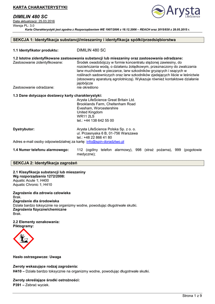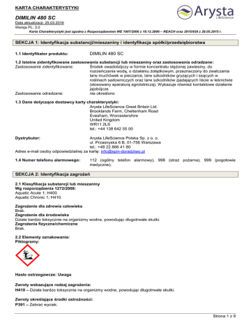KARTA CHARAKTERYSTYKI DIMILIN 480 SC Data aktualizacji: 25.03.2016 Wersja PL: 3.0 Karta Charakterystyki jest zgodna z Rozporządzeniem WE 1907/2006 z 18.12.2006 – REACH oraz 2015/830 z 28.05.2015 r. SEKCJA 1: Identyfikacja substancji/mieszaniny i identyfikacja spółki/przedsiębiorstwa 1.1 Identyfikator produktu: DIMILIN 480 SC 1.2 Istotne zidentyfikowane zastosowania substancji lub mieszaniny oraz zastosowania odradzane: Zastosowanie zidentyfikowane: Środek owadobójczy w formie koncentratu stężonej zawiesiny, do rozcieńczania wodą, o działaniu żołądkowym, przeznaczony do zwalczania larw muchówek w pieczarce, larw szkodników gryzących i ssących w roślinach sadowniczych oraz larw szkodników zjadających liście w leśnictwie (stosowany aparaturą agrolotniczą). Wykazuje również kontaktowe działanie jajobójcze Zastosowanie odradzane: nie określono 1.3 Dane dotyczące dostawcy karty charakterystyki: Arysta LifeScience Great Britain Ltd. Brooklands Farm, Cheltenham Road Evesham, Worcestershire United Kingdom WR11 2LS tel.: +44 138 642 55 00 Dystrybutor: Arysta LifeScience Polska Sp. z o. o. ul. Przasnyska 6 B, 01-756 Warszawa tel.: +48 22 866 41 80 Adres e-mail osoby odpowiedzialnej za kartę: [email protected] 1.4 Numer telefonu alarmowego: 112 (ogólny telefon alarmowy), 998 (straż pożarna), 999 (pogotowie medyczne); SEKCJA 2: Identyfikacja zagrożeń 2.1 Klasyfikacja substancji lub mieszaniny Wg rozporządzenia 1272/2008: Aquatic Acute 1; H400 Aquatic Chronic 1; H410 Zagrożenie dla zdrowia człowieka Brak. Zagrożenie dla środowiska Działa bardzo toksycznie na organizmy wodne, powodując długotrwałe skutki. Zagrożenia fizyczne/chemiczne Brak. 2.2 Elementy oznakowania: Piktogramy: Hasło ostrzegawcze: Uwaga Zwroty wskazujące rodzaj zagrożenia: H410 – Działa bardzo toksycznie na organizmy wodne, powodując długotrwałe skutki. Zwroty określające środki ostrożności: P391 – Zebrać wyciek. Strona 1 z 9 KARTA CHARAKTERYSTYKI DIMILIN 480 SC Data aktualizacji: 25.03.2016 Wersja PL: 3.0 Karta Charakterystyki jest zgodna z Rozporządzeniem WE 1907/2006 z 18.12.2006 – REACH oraz 2015/830 z 28.05.2015 r. EUH401: W celu uniknięcia zagrożeń dla zdrowia ludzi i środowiska, należy postępować zgodnie z instrukcją użycia. EUH208: Zawiera 1,2-benzoizotiazol-3(2H)-on. Może powodować wystąpienie reakcji alergicznej. Zawartość substancji czynnej: Diflubenzuron (związek z grupy benzoilomoczników) 480g/l (40,03%) 2.3 Inne zagrożenia: Brak innych zagrożeń. Brak informacji na temat spełnienia kryteriów PBT lub vPvB zgodnie z załącznikiem XIII rozporządzenia REACH. Odpowiednie badania nie były przeprowadzone. SEKCJA 3: Skład/informacja o składnikach 3.1 Substancje: Nie dotyczy. 3.2 Mieszaniny: Niebezpieczne składniki: Identyfikator produktu Diflubenzuron CAS: 35367-38-5 WE: 252-529-3 Nr indeksowy: Nr REACH: Glikol etylenowy CAS: 107-21-1 WE: 203-473-3 Nr indeksowy: 603-027-00-1 Nr REACH: Sulfonian diizopropylonaftalenosodowy CAS: 1322-93-6 WE: 215-343-3 Nr indeksowy: Nr REACH: Pełna treść zwrotów H w sekcji 16 Zawartość % Klasyfikacja CLP Kody zwrotów Klasa zagrożenia i wskazujących kody kategorii rodzaj zagrożenia 48 Aquatic Acute 1 H400 <10 Acute Tox.4 H302 <5 Acute Tox.4 Eye Irrit. 2 STOT SE3 H302 H319 H335 SEKCJA 4: Środki pierwszej pomocy 4.1 Opis środków pierwszej pomocy W przypadku kontaktu ze skórą: Zdjąć zanieczyszczoną odzież. Umyć zabrudzoną skórę wodą z mydłem, spłukać dokładnie wodą, w przypadku pojawienia się podrażnienia, rumieni skontaktować się z lekarzem. W przypadku kontaktu z oczami: Przepłukać oczy przez kilkanaście minut (ok. 15) dużą ilością wody, trzymając powieki szeroko rozwarte. Unikać silnego strumienia, ze względu na niebezpieczeństwo uszkodzenia rogówki, skontaktować się z lekarzem. Narażenie inhalacyjne: W razie zawrotów głowy lub nudności wyprowadzić poszkodowanego na świeże powietrze, w razie braku szybkiej poprawy zasięgnąć porady lekarza. W przypadku połknięcia: Nie wywoływać wymiotów, wypłukać usta wodą. Skontaktować się z lekarzem. Osobie nieprzytomnej nie podawać żadnych środków doustnie. 4.2 Najważniejsze ostre i opóźnione objawy oraz skutki narażenia: Może powodować nieznaczne podrażnienie oczu. 4.3 Wskazania dotyczące wszelkiej natychmiastowej pomocy lekarskiej i szczególnego postępowania z poszkodowanym: Strona 2 z 9 KARTA CHARAKTERYSTYKI DIMILIN 480 SC Data aktualizacji: 25.03.2016 Wersja PL: 3.0 Karta Charakterystyki jest zgodna z Rozporządzeniem WE 1907/2006 z 18.12.2006 – REACH oraz 2015/830 z 28.05.2015 r. Decyzję o sposobie postępowania podejmuje lekarz po ocenie stanu poszkodowanego. SEKCJA 5: Postępowanie w przypadku pożaru 5.1 Środki gaśnicze: Odpowiednie środki gaśnicze: piana alkoholoodporna lub suche proszki gaśnicze (A, B, C), dwutlenek węgla (gaśnica śniegowa), piasek lub ziemia, mgła wodna. Stosować metody gaśnicze odpowiednie do warunków otoczenia. Niewłaściwe środki gaśnicze: Silny strumień wody. 5.2 Szczególne zagrożenia związane z substancją lub mieszaniną: Podczas pożaru mogą wytwarzać się toksyczne i drażniące gazy tj. tlenki węgla. 5.3 Informacje dla straży pożarnej: Pojemniki znajdujące się w strefie pożaru chłodzić rozproszonym strumieniem wody, o ile jest to możliwe usunąć ze strefy zagrożenia. W przypadku pożaru w zamkniętym pomieszczeniu należy stosować odzież ochronną i aparat oddechowy na sprężone powietrze. Nie dopuszczać do przedostania się wody gaśniczej do wód powierzchniowych, gruntowych i kanalizacji. SEKCJA 6: Postępowanie w przypadku niezamierzonego uwolnienia do środowiska 6.1 Indywidualne środki ostrożności, sprzęt ochronny i procedury w sytuacjach awaryjnych Dla osób nienależących do personelu udzielającego pomocy: zawiadomić o awarii odpowiednie służby. Usunąć z obszaru zagrożenia osoby niebiorące udzia