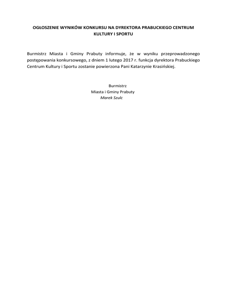 OGŁOSZENIE WYNIKÓW KONKURSU NA DYREKTORA PRABUCKIEGO CENTRUM KULTURY I SPORTU Burmistrz Miasta i Gminy Prabuty informuje, że w wyniku przeprowadzonego postępowania konkursowego, z dniem 1 lutego 2017 r. funkcja dyrektora Prabuckiego Centrum Kultury i Sportu zostanie powierzona Pani Katarzynie Krasińskiej. Burmistrz Miasta i Gminy Prabuty Marek Szulc