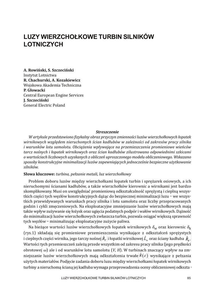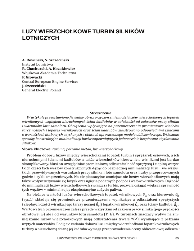 LUZY WIERZCHOŁKOWE TURBIN SILNIKÓW LOTNICZYCH A. Rowiński, S. Szczeciński Instytut Lotnictwa R. Chachurski, A. Kozakiewicz Wojskowa Akademia Techniczna P. Głowacki Central European Engine Services J. Szczeciński General Electric Poland Streszczenie W artykule przedstawiono fizykalny obraz przyczyn zmienności luzów wierzchołkowych łopatek wirnikowych względem nieruchomych ścian kadłubów w zależności od zakresów pracy silnika i warunków lotu samolotu. Obciążenia wpływające na przemieszczenia promieniowe wieńców tarcz nośnych i łopatek wirnikowych oraz ścian kadłubów zilustrowano odpowiednimi szkicami o wartościach liczbowych uzyskanych z obliczeń uproszczonego modelu obliczeniowego. Wskazano sposoby konstrukcyjne minimalizacji luzów zapewniających jednocześnie bezpieczne użytkowanie silników. Słowa kluczowe: turbina, pełzanie metali, luz wierzchołkowy Problem doboru luzów między wierzchołkami łopatek turbin i sprężarek osiowych, a ich nieruchomymi ścianami kadłubów, a także wierzchołków kierownic a wirnikami jest bardzo skomplikowany. Musi on uwzględniać promieniową odkształcalność sprężystą i cieplną wszystkich części tych węzłów konstrukcyjnych dążąc do bezpiecznej minimalizacji luzu – we wszystkich przewidywanych warunkach pracy silnika i lotu samolotu oraz liczby przepracowanych godzin i cykli zmęczeniowych. Na eksploatacyjne zmniejszanie luzów wierzchołkowych mają także wpływ zużywanie się łożysk oraz ugięcia podatnych podpór i wałów wirnikowych. Dążność do minimalizacji luzów wierzchołkowych zwłaszcza turbin, pozwala osiągać większą sprawność tych węzłów – minimalizując eksploatacyjne zużycie paliwa. Na bieżące wartości luzów wierzchołkowych łopatek wirnikowych δw oraz kierownic δk (rys.1) składają się promieniowe przemieszczenia wynikające z odkształceń sprężystych i cieplnych części wirnika, jego tarczy nośnej i łopatki wirnikowej oraz ściany kadłuba Wartości tych przemieszczeń zależą przede wszystkim od zakresu pracy silnika (jego prędkości obrotowej ω) ale i od warunków lotu samolotu (V, H). W turbinach znaczący wpływ na zmniejszanie luzów wierzchołkowych mają odkształcenia trwałe wynikające z pełzania użytych materiałów. Podjęcie zadania doboru luzu między wierzchołkami łopatek wirnikowych turbiny a nieruchomą ścianą jej kadłuba wymaga przeprowadzenia oceny obliczeniowej odkszta LUZY WIERZCHOŁKOWE TURBIN SILNIKÓW LOTNICZYCH 85 łceń promieniowych części składowych wirnika uwzględniających oddzielnie wpływy specyfiki konstrukcji i sposobów chłodzenia. Rys. 1. Schemat stopnia zespołu wirnikowego i kadłuba z zaznaczeniem składowych przemieszczeń promieniowych części wirnikowych i ściany kadłuba oraz luzów wierzchołkowych Rys. 2. Zależność przemieszczeń promieniowych tarczy nośnej wirnika turbiny od: (a) - sił masowych samej tarczy, (b) - obciążenia wieńcowego, (c) - nagrzania tarczy, 1 - z łopatkami niechłodzonymi, 2 – łopatkami chłodzonymi. Z przytoczonych na rys. 2 wykresów (dla uproszczonego modelu obliczeniowego) wynika sensowność zastosowania chłodzenia łopatek - gdyż największe odkształcenia tarcz nośnych wirników turbin spowodowane jest ich nagrzaniem, a chłodzone łopatki ograniczają dopływ ciepła do tarcz. Ponadto powłokowe pióra łopatek są lżejsze i w mniejszym stopniu obciążają tarcze. Na rys. 3 porównano odkształcenia wzdłużne łopatek chłodzonych i niechłodzonych, a na rys. 4 – przemieszczenia promieniowe tarcz i łopatek pod działaniem sumarycznych obciążeń. Przemieszczenia promieniowe ścian kadłubów są uzależnione nie tylko od ich temperatury ale i od różnicy ciśnień działających na ich powierzchnie (różnica ciśnienia spalin na stopniu turbiny jest 2...5 razy większa niż różnica ciśnienia na stopniu sprężarki silnika). Ciśnienia działające od wnętrza kanału przepływowego zależą od zakresu pracy silnika ale i od warunków lotu (V, H), natomiast od zewnątrz może zależeć od tych samych przyczyn lub tylko od warunków lotu - co wyjaśniają przykłady na rys. 5. 86 PRACE INSTYTUTU LOTNICTWA Nr. 199 Rys. 3. Zależność przemieszczeń promieniowych piór łopatki wirnikowej 1- niechłodzonej, 2- chłodzonej Rys. 4. Sumaryczne przemieszczenia promieniowe stopnia wirnikowego turbiny 1- łopatki niechłodzone, 2 – łopatki chłodzone Rys. 5. Schemat przemieszczeń promieniowych ściany kadłuba stopnia turbiny (a) - o ciśnieniu zewnętrznym jak w kanale płatowca, (b) - o ciśnieniu jak za sprężarką silnika LUZY WIERZCHOŁKOWE TURBIN SILNIKÓW LOTNICZYCH 87 Powyższe uwarunkowania narzucają konieczność przeprowadzenia analizy wpływu zakresu pracy silników ω oraz prędkości V i wysokości H lotu na przebieg zmian przemieszczeń promieniowych ścian kadłubów i wierzchołków łopatek oraz luzów wierzchołkowych. Na rys.6 zilustrowano te zależności wynikami obliczeniowymi uproszczonego modelu turbiny silnika odrzutowego samolotu bojowego. Rys. 6. Charakterystyczne zależności przemieszczeń promieniowych ścian kadłuba i wierzchołków łopatek wirnikowych turbiny silnika odrzutowego od jego prędkości obrotowej (a), wysokości lotu (b) oraz prędkości lotu (c) Możliwości minimalizacji luzów wierzchołkowych turbin – zwłaszcza w odniesieniu do silników odrzutowych stanowiących napęd samolotów bojowych są dość ograniczone. Wynika to z konieczności zapewnienia niezbędnych luzów w każdych zakresach pracy silników i warunkach lotu samolotu – także dynamicznie zmiennych. Silniki samolotów bojowych muszą się charakteryzować zdolnością do szybkiej akceleracji, czyli przejścia z zakresu biegu jałowego do zakresu ciągu maksymalnego w czasie 4…6 sekund w każdych warunkach lotu. Na rys. 7 przedstawiono charakterystyczne przebiegi temperatury spalin Ts przed turbiną oraz odpowiadaj