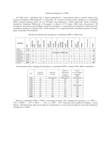 Ochrona nietoperzy w OPN W 2004 roku – podobnie jak w latach poprzednich – prowadzona była na terenie parku akcja liczenia nietoperzy hibernuj cych w jaskiniach. W wyniku inwentaryzacji nietoperzy w jaskiniach OPN, przeprowadzonej przez dr in . Witolda Grzywi skiego i Pawła Kmiecika (Koło Le ników Studentów Akademii Rolniczej w Poznaniu) w dniach 11-14 lutego 2004 roku stwierdzono 140 nietoperze. Inwentaryzacji poddano nietoperze nocuj ce w 6 najwi kszych jaskiniach. Najwi cej było osobników podkowca małego (99) i nocka du ego (17), najliczniej była zasiedlona jaskinia Ciemna, gdzie zimowały 84 nietoperze. Biała Ciemna Jama Ani Krakowska Łokietka S spowska Zbójecka Złodziejska Razem 12.02 14.02 2 76 1 5 12.02 13.02 12.02 13.02 12.02 2004 1 15 1 3 1 99 1 7 1 2 1 1 17 1 nie badana w 2004 roku 1 1 1 1 1 1 7 2 3 1 8 1 1 1 3 razem nieoznaczony 6 84 2 3 5 1 mopek gacek brunatny nocek rudy nocek łydkowłosy nocek w satek/ Brandta nocek orz siony nocek Natterera nocek du y podkowiec du y data Jaskinia podkowiec mały Wyniki inwentaryzacji nietoperzy w jaskiniach OPN w 2004 roku 1 2 27 5 14 2 140 Porównanie liczby zimuj cych nietoperzy w jaskiniach OPN w latach 1994–2004 (osobników) Lata Jaskinia Łokietka Jaskinia Ciemna 1994 1995 1996 1997 1998 1999 2000 2001 2002 2003 2004 5 20 35 33 18 31 31 35 29 30 27 brak danych 39 53 54 53 43 50 71 57 96 84 razem w Jaskiniach Ciemnej i Łokietka brak danych 59 88 87 71 74 81 106 86 126 111 razem we wszystkich jaskiniach OPN brak danych 79 104 95 brak danych 116 130 145 106 153 140 Razem w jaskiniach OPN w 2004 r. zinwentaryzowano 140 zimuj cych nietoperzy, (w 1999 r. – 116, w 2000 r. – 130, w 2001 r. – 145, a w 2003 – 153). Najwi cej jest podkowca małego i nocka du ego. Przedstawione dane pozwalaj na stwierdzenie, e corocznie powi ksza si liczba nietoperzy zimuj cych w Parku.