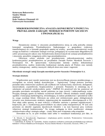 Katarzyna Balcerowicz Sandra Misiak studenci Koło Naukowe Ekonomii AS Uniwersytet Szczeciński MIKROEKONOMICZNA ANALIZA KONKURENCYJNOŚCI NA PRZYKŁADZIE ZARZĄDU MORSKICH PORTÓW SZCZECIN I ŚWINOUJŚCIE SA Wstęp Dynamiczne zmiany w otoczeniu przedsiębiorstwa niosą za sobą potrzebę zmiany koncepcji zarządzania. Przedsiębiorstwo funkcjonujące w gospodarce rynkowej, transformujacej sie w kierunki gospodarki opartej na wiedzy, powinno koncentrować swoją uwagę na budowie i wdrażaniu strategii rozwoju, polegającej na wyznaczaniu długofalowych celów przynoszących sukces oraz formułowaniu dostosowanych do sytuacji przedsiębiorstwa i otoczenia, sposobów osiągnięcia celów tego przedsiębiorstwa. Głównym celem artykułu jest przedstawienie mikroekonomicznej analizy konkurencyjności przedsiębiorstwa na przykładzie Zarządu Portów Morskich Szczecin i Świnoujście SA. W opracowaniu wykorzystano metody: analizy dokumentacji przedsiębiorstwa, analizy środowiska konkurencji metodą pięciu sił Portera oraz metody analizy strategicznej - analizy mocnych i słabych stron oraz szans i zagrożeń. Określenie strategii i misji Zarządu morskich portów Szczecin i Świnoujście S.A. Strategia działania Współcześnie port morski nastawiony jest na dywersyfikację procesu produkcyjnego, a szczególnie na rozwój funkcji dystrybucyjno – logistycznej. Usługi portowe powinny posiadać takie właściwości użytkowe jak szybkość ich wykonywania, masowość, dostępność, niezawodność, częstotliwość, bezpieczeństwo i pewność. Parametry te zmieniają się w zależności od potrzeb użytkowników portu.1 ZMPSiŚ SA przetrwał tyle lat, ponieważ od początku powstania szczególny nacisk położono na jego rozwój i maksymalizację zysku. Przyjętą strategię oparto na badaniu oczekiwań klientów. Obecne działania zastały podjęte zgodnie z koncepcją marketingową, stwierdzającą, że należy produkować i sprzedawać tylko to, czego oczekuje klient. Głównym jej celem jest zróżnicowanie gamy obsługiwanych towarów oraz dostosowanie struktury organizacyjnej do standardów obowiązujących w UE. Port zdaje sobie sprawę, że musi walczyć o klientów zarówno z portami zagranicznymi i krajowymi, jak i z konkurencją przewoźników na całym rynku transportowym. W tym celu powinien on określić segmenty docelowych klientów i na tym bazować przy wyborze właściwej strategii konkurowania.2 Na uwagę zasługują tu dwie możliwości: strategia zróżnicowania usług i strategia usługa – rynek, które port wzajemnie sobą uzupełnia. Dowodem na to, że port świetnie radzi sobie w warunkach konkurencji jest fakt, że 1 K. Misztal, S. Szwankowski, Organizacja i eksploatacja portów morskich, Wydawnictwo Uniwersytetu Gdańskiego, Gdańsk, 1999, s. 53 2 J. Żaboklicka, R. Rybak, M. Tarchalski, Analiza zasadności rozbudowy potencjału przeładunkowego nabrzeża hutników w Porcie Handlowym Świnoujście, Wyższa Szkoła Morska w Szczecinie, Szczecin, 1999, s. 14 192 Katarzyna Balcerowicz, Sandra Misiak posiada on znaczną przewagę w przeładunkach masowych. Rozwój ZPMSiŚ SA wymaga wzmożonych działań akwizycyjnych i marketingowych, odpowiedniej polityki inwestycyjnej i remontowej oraz skutecznych działań organizacyjnych. Spółka powinna pamiętać, ze szczególny nacisk należy położyć na dalszą poprawę parametrów eksploatacyjnych na poszczególnych nabrzeżach. Powinna poprawić również wydajność pracy oraz podejmować nowe działania dywersyfikacyjne w posiadanym potencjale przeładunkowym.3 Misja Dążenie, aby porty Szczecina i Świnoujścia były liderem w świadczeniu najwyższej jakości usług i udostępnianiu infrastruktury umożliwiającej sprawną, bezpieczna i kompleksową obsługę pasażerów, ładunków i środków transportu i pełniły rolę regionalnego bieguna wzrostu gospodarczego.4 Analiza środowiska konkurencji metodą pięciu sił Portera Konkurencja aktualna Głównymi konkurentami ZMPSiŚ SA są porty w Gdańsku i Gdyni. Istnieje również kilka mniejszych portów np. Kołobrzeg, Władysławowo, Hel. Liderem na rynku jest prężnie rozwijający się Port Gdański. Głównie z tego powodu konkurencja w sektorze jest znaczna. Mniejsze porty nie mają większego znaczenia i raczej nie zagrażają na rynku. W świetle istniejących uwarunkowań rozwoju gospodarki morskiej, priorytetowym czynnikiem jest wzrost konkurencyjności portu. Aby spełnić ten warunek, port w Świnoujściu, musi świadczyć usługi na najwyższym poziomie, odpowiadającym standardom europejskim i światowym, a zakres tych usług musi ulec zmianie, zmierzającej w kierunku rozszerzenia obrotu portowo - morskiego. W tym celu, niezależnie od rozwoju przestrzennego portu i przygotowaniu nowych terenów pod inwestycje, niezbędna jest jego restrukturyzacja oraz modernizacja istniejącego układu funkcjonalno - przestrzennego. Za granicą występuje znacznie większa konkurencja i tu ZMPSiŚ nie zajmuje już tak wysokiego miejsca. Sąsiadujące państwa mają świetnie rozbudowaną gospodarkę morską, większy kapitał i z pewnością wyższe dofinansowanie. Zagraniczne porty stanowią znaczne zagrożenie dla ZMPSiŚ S.A. Wśród sąsiadujących państw dużą rolę odgrywają: • Niemcy (np. Bremen, Hamburg, Lubeck) • Dania (np. Copenhagen, Hanstholm, Kolding) • Szwecja (np. Stockholm, Malmoe, Treueborgs) • Litwa (np. Liepaja, Riga)5 Konkurencja potencjalna Poziom tego rodzaju konkurencji jest dość niski. Założenie nowego portu jest poważnym przedsięwzięciem. Potrzeba na to bardzo dużo czasu, pracy i naturalnie mnóstwo pieniędzy. Kapitało– i materiałochłonność ogranicza ryzyko pojawienia się nowych portów na rynku polskim, a nawet europejskim. Większe zagrożenie stanowią już istniejące, rozwijające się porty, niż te, które miałyby dopiero powstać. To jednak nie powinno uśpić uwagi Spółki, lecz raczej zmobiliz