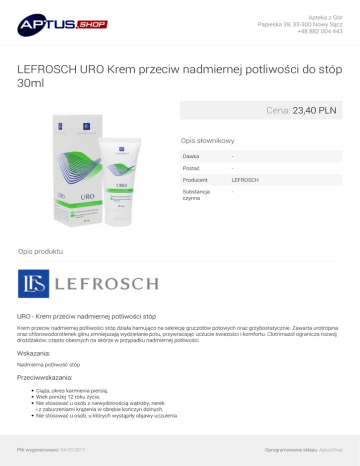 Apteka z Gór Papieska 39, 33-300 Nowy Sącz +48 882 004 443 LEFROSCH URO Krem przeciw nadmiernej potliwości do stóp 30ml Cena: 23,40 PLN Opis słownikowy Dawka - Postać - Producent LEFROSCH Substancja czynna - Opis produktu URO - Krem przeciw nadmiernej potliwości stóp Krem przeciw nadmiernej potliwości stóp działa hamująco na sekrecję gruczołów potowych oraz grzybostatycznie. Zawarta urotropina oraz chlorowodorotlenek glinu zmniejszają wydzielanie potu, przywracając uczucie świeżości i komfortu. Clotrimazol ogranicza rozwój drożdżaków, często obecnych na skórze w przypadku nadmiernej potliwości. Wskazania: Nadmierna potliwość stóp Przeciwwskazania: Ciąża, okres karmienia piersią, Wiek poniżej 12 roku życia, Nie stosować u osób z niewydolnością wątroby, nerek i z zaburzeniami krążenia w obrębie kończyn dolnych, Nie stosować u osób, u których wystąpiły objawy uczulenia Plik wygenerowano: 04-03-2017 Oprogramowanie sklepu: AptusShop Apteka z Gór Papieska 39, 33-300 Nowy Sącz +48 882 004 443 lub nadwrażliwości na którykolwiek ze składników preparatu. Zastosowanie: Krem nakładać 1 razy dziennie na całą powierzchnię stóp, Po kilku minutach założyć bawełniane skarpetki, Krem powinien pozostać na skórze przez 3-7 godzin, następnie należy go zmyć wodą z dodatkiem mydła, Kurację należy powtarzać do momentu ustąpienia nadmiernej potliwości, zwykle przez 2-4 dni, W przypadku wystąpienia nadmiernego przesuszenia skóry należy zastosować krem nawilżający przez kilka następnych dni. Uwagi: W trakcie stosowania kremu należy obserwować proces ustępowania objawów nadmiernej potliwości i w odpowiednim momencie zakończyć stosowanie preparatu. Zbyt długie stosowanie kremu może spowodować nadmierną suchość, rogowacenie i łuszczenie skóry. Plik wygenerowano: 04-03-2017 Powered by TCPDF (www.tcpdf.org) Oprogramowanie sklepu: AptusShop