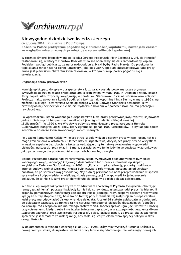 Niewygodne dziedzictwo księdza Jerzego 06 grudnia 2014 | Plus Minus | Piotr Ciompa Kościół w Polsce praktycznie pogodził się z brutalnością kapitalizmu, nawet jeśli czasem ze względów wizerunkowych przebąkuje o sprawiedliwości społecznej. W rocznicę śmierci błogosławionego księdza Jerzego Popiełuszki Piotr Zaremba w „Plusie Minusie" zastanawiał się, w którym z nurtów Kościoła w Polsce odnalazłby się dziś zamordowany kapłan. Podzielam pogląd publicysty, że najprawdopodobniej bliski byłby Radiu Maryja. Do przekonania tego skłania mnie historia cichej katastrofy, jaka po 1989 r. spotkała duszpasterstwa ludzi pracy. Praca jest pierwszym obszarem życia człowieka, w którym biskupi polscy pogodzili się z sekularyzacją. Degradacja spraw pracowniczych Komisja episkopatu do spraw duszpasterstwa ludzi pracy została powołana przez prymasa Wyszyńskiego trzy miesiące przed strajkami sierpniowymi w maju 1980 r. Dokładnie wtedy ksiądz Jerzy Popiełuszko rozpoczął swoją misję w parafii św. Stanisława Kostki na warszawskim Żoliborzu. Profetyzm aktu powołania komisji podkreśla fakt, że jak wspomina Kinga Dunin, w maju 1980 r. na zjeździe Polskiego Towarzystwa Socjologicznego w Łodzi Jadwiga Staniszkis dowodziła, iż w przewidywalnej perspektywie nic się nie wydarzy, albowiem w społeczeństwie nie ma potencjału rewolucyjnego. Po wprowadzeniu stanu wojennego duszpasterstwa ludzi pracy przeżywają swój rozkwit, są bowiem jedną z nielicznych i bezpiecznych możliwości jawnego działania zdelegalizowanej „Solidarności". W 1990 r. we Wrocławiu odbył się organizowany przez kardynała Henryka Gulbinowicza Kongres Ludzi Pracy, który zgromadził ponad 1000 uczestników. To był łabędzi śpiew Kościoła w obszarze życia zawodowego swoich wiernych. Po upadku komunizmu Kościół w Polsce stracił z pola widzenia sprawy pracownicze i oceny tej nie mogą zmienić dwa w ostatnich 25 latach listy duszpasterskie, dotykające pracy przede wszystkim w wąskim aspekcie bezrobocia, a także zawadzające o tę tematykę okazjonalne wypowiedzi biskupów, najczęściej przy okazji 1 maja, sprawiając wrażenie jedynie wypowiedzi wizerunkowych jako przeciwwaga dla postkomunistycznych obchodów tego święta. Biskupi rozpostarli parasol nad transformacją, czego wymownym podsumowaniem były słowa kończącego swoją „kadencję" krajowego duszpasterza ludzi pracy z ramienia episkopatu, arcybiskupa Tadeusza Gocłowskiego w 2008 r.: „Poprzez mądrą refleksję, popartą modlitwą w intencji budowy wolnej Ojczyzny, trzeba było wszystko reformować, poczynając od struktur państwa, aż po sprawiedliwą gospodarkę. Najtrudniej przychodziło nam przeprowadzanie w sposób sprawiedliwy i odpowiedzialny wielkiego dzieła prywatyzacji". Wypowiedź ta jednoznacznie pokazuje, że to nie z ludźmi pracy identyfikuje się posłany do nich delegat episkopatu. W 1996 r. episkopat faktycznie zrywa z dziedzictwem społecznym Prymasa Tysiąclecia, obniżając rangę „zagadnienia" poprzez likwidację komisji do spraw duszpasterstwa ludzi pracy. W hierarchii organów pomocniczych Konferencji Episkopatu Polski (komisje, rady, zespoły) sprawy pracownicze lądują aż o trzy stopnie niżej, bowiem od tamtej pory z ramienia tej instytucji za duszpasterstwa ludzi pracy ma odpowiadać biskup w randze delegata. Artykuł 54 statutu episkopatu w odniesieniu do delegatów zaznacza, że funkcja ta nie narusza kompetencji biskupów diecezjalnych (odnośnie do komisji, rad i zespołów nie ma takiego zastrzeżenia). Inaczej sprawę ujmując, wbrew z lubością przywoływanemu kiedy trzeba i nie trzeba świętemu papieżowi, a w szczególności jego encyklikom „Laborem exercens" oraz „Sollicitudo rei socialis", polscy biskupi uznali, że praca jako zagadnienie społeczne jest tematem za niskiej rangi, aby stała się stałym elementem spójnej polityki w skali całego Kościoła. W dokumentach II synodu plenarnego z lat 1991–1998, który miał wytyczyć kierunki Kościoła w nowej rzeczywistości, duszpasterstwa ludzi pracy ledwie się odnotowuje, nie wskazując nowej ich formuły, ale sprawa niskich podatków – na co Kościół bezpośredniego wpływu nie ma – została w dokumentach synodalnych przywołana co najmniej pięciokrotnie. Czy może więc dziwić, że na coroczny zjazd duszpasterzy ludzi pracy w 30. rocznicę pierwszej pielgrzymki robotników, poprowadzonej we wrześniu 1983 r. na Jasną Górę przez księdza Popiełuszkę, przybyło ich rok temu mniej, niż mamy diecezji? Szyderstwo episkopatu W latach 80. przyjeżdżało ich pięć razy więcej. Ale nawet wtedy, gdy biskupi zabierali głos w konkretnych sprawach pracowniczych, potrafili go osłabić działaniami przeciwnymi. Tak było w przypadku wykupu przez konkurenta, celem likwidacji, fabryki kabli w Ożarowie w 2001 r. Mimo dramatycznej walki pracowników o uratowanie zakładu, werbalnie wspieranej przez prymasa kardynała Józefa Glempa, krótko po tym zdarzeniu nowy inwestor został zaakceptowany jako sponsor pielgrzymki papieskiej. Oglądanie jego logo w trakcie relacji medialnych z pobytu Jana Pawła II wierzący pracownicy z tej fabryki musieli odbierać jako wyjątkowe szyderstwo. Nie było nikogo, kto uświadomiłby biskupom, że tych pieniędzy pochodzących z brutalnej likwidacji miejsc pracy nie godzi się przyjmować. Czy przy takiej wrażliwości hierarchii na aspekt społeczny misji Kościoła ksiądz Jerzy odnalazłby się w jego centrum? Bardziej prawdopodobne, że stanąłby do walki, jaką Radio Maryja, mobilizując swoich słuchaczy, prowadziło z wykupem zakładów Tormięs celem ich zamknięcia i komercyjnego wykorzystania ich nieruchomości. Bezsporny jest fakt, że Kościół w Polsce wbrew deklarowanemu stanowisku praktycznie pogodził się z przewagą kapitału nad pracą, nawet jeśli czasem ze względów wizerunkowych przebąkuje o sprawiedliwości społecznej. W okresie po