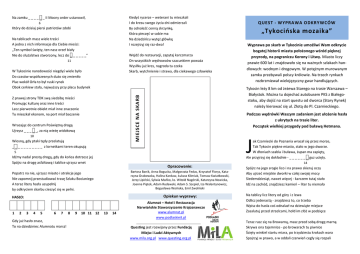 Kiedyś rycerze – weterani tu mieszkali I do kresu swego życia dni odmierzali By odnaleźć cenną skrzynkę, Która pieczęć w sobie ma Na dziedzińcu wytęż główkę I rozejrzyj się raz-dwa! Na zamku _ _ _ _ _ _ II Mocny order ustanowił, 6 Który do dzisiaj piersi patriotów zdobi Na tablicach masz wiele treści A jedna z nich informacje dla Ciebie mieści: „Ten symbol święty, ten nasz orzeł biały Nie do służalstwa stworzony, lecz do _ _ _ _ _ _” Wejdź do restauracji, zapytaj karczmarza On wszystkich wędrowców szacunkiem poważa Wysiłku już kres, nagroda tu czeka Skarb, wytchnienie i strawa, dla ciekawego człowieka 11 Z prawej strony TDK swą siedzibę mieści Promując kulturę oraz inne treści Lecz pierwotnie obiekt miał inne znaczenie Tu mieszkał ekonom, na port miał baczenie Wracając do centrum Poświętną drogą Ujrzysz _ _ _ _ _, za nią wieżę widokową 10 Wiosną, gdy ptaki tędy przelatują _ _ _ _ _ _ _ _ _ _ _ z lornetkami teren okupują J ak Czarniecki do Poznania wracał się przez morze, Tak Tykocin piękne miasto, stało w jego dworze. W dłoniach szabla i buława, żupan ma zapięty, Ale przyjrzyj się dokładnie - _ _ _ _ _ _ _ guz ucięty. Opracowanie: Bartosz Banik, Anna Bogucka, Małgorzata Fedas, Krzysztof Florys, Katarzyna Grabowska, Halina Kardasz, Łukasz Klimiuk, Tomasz Kwiatkowski, Jerzy Lipiński, Sylwia Mańko, ks. Witold Nagórski, Katarzyna Nowicka, Joanna Piątek, Adam Rudawski, Adam S. Szepiel, Iza Walentynowicz, Bogusława Woińska, Emil Zwoliński Popatrz na nie, ujrzysz miasto i atrakcje jego Nie zapomnij przestudiować trasę Szlaku Bocianiego A teraz litery hasła uzupełnij by odkryciem skarbu cieszyć się w pełni. Opiekun wyprawy: HASŁO: 1 2 3 4 5 6 7 Gdy już hasło znasz, To na dziedziniec Alumnatu marsz! 8 9 10 11 12 13 14 Wyprawa po skarb w Tykocinie umożliwi Wam odkrycie bogatej historii miasta położonego wśród pięknej przyrody, na pograniczu Korony i Litwy. Miasto liczy prawie 600 lat i znajdowało się na ważnych szlakach handlowych: wodnym i drogowym. W potężnym murowanym zamku przebywali polscy królowie. Na trzech rynkach rozbrzmiewał wielojęzyczny gwar handlujących. Podczas wędrówki Waszym zadaniem jest ułożenie hasła z ukrytych na trasie liter. Początek wielkiej przygody pod buławą Hetmana. 5 Idźmy nadal prostą drogą, gdy do końca dotrzesz jej Spójrz na drogę asfaltową i tablice ujrzysz wnet „Tykocińska mozaika” Tykocin leży 8 km od Jeżewa Starego na trasie Warszawa – Białystok. Można tu dojechać autobusem PKS z Białegostoku, aby dojść na start questu od dworca (Stary Rynek) należy kierować się ul. Złotą do Pl. Czarnieckiego. MIEJSCE NA SKARB W Tykocinie narodowości niegdyś wiele było Do czasów współczesnych dużo się zmieniło Plac wokół Orła to był ruski rynek Obok cerkiew stała, najwyższy przy placu budynek QUEST - WYPRA WA ODKRYWCÓW Alumnat – Hotel i Restauracja Narwiańskie Stowarzyszenie Krajoznawcze www.alumnat.pl www.podlaskieit.pl Questing jest rozwijany przez Fundację Miejsc i Ludzi Aktywnych www.mila.org.pl www.questing.org.pl 14 Spójrz na jego srogie lico i na prawo skieruj oczy Aby ujrzeć miejskie dworki w całej swojej mocy Siedemdziesiąt, nawet więcej - karczem tutaj stało Idź na zachód, znajdziesz kamień – liter tu niemało Na tablicy licz litery od góry i z lewa Odlicz jedenastą - znajdziesz to, co trzeba Wpisz do hasła coś odnalazł na dziewiąte miejsce Zasalutuj przed strzelcami, hołd im złóż w podzięce Teraz rusz się na Browarną, masz przed sobą drogę marną Skrywa ona tajemnice - po browarach tu piwnice Ścięty winkiel startu miara, po trzydziestu krokach wara Spojrzyj w prawo, a w oddali czerwień cegły się rozpali Przy końskim targu Kaczy Rów płynie Od jego nazwy dzielnica słynie Gdzie stary rynek, kupcy handlowali I między sobą plotki wymieniali. Idź rynkiem pieszo – nie ma tutaj szyn, Od ulicy Złotej kierunek na _ _ _ _ _ _ _ 12 Co drugi mieszkaniec w piątkowy wieczór W kierunku tego budynku kroczył Modlił się tutaj do swojego Boga Czy znasz tą budowlę? To jest _ _ _ _ _ _ _ _ 8 To nizinny zamek stoi wśród rozlewisk Narwi Zygmunt August tutaj niegdyś chował swoje skarby Potem Szwedzi i Polacy długo tu walczyli, Aż w ostatnim starciu zamek wysadzili Starą drogą, którą idziesz, od wieków królowie Zdążali na zamek, co jest znów w budowie Prace te zainspirował pewien pan z Białegostoku, Który dobro tego zamku zawsze miał na oku. Idź do mostku na Motławie, tam po stronie prawej Nic nie znajdzie Twoje oko, nawet bardzo sprawne Dawniej tutaj _ _ _ _ _ _ mykwą zwana stała 4 Gdzie żydowska gmina przed szabatem się kąpała Pójdźmy dalej, w lewo baczysz. Jeśliś bystry, to zobaczysz Między domy „ułka” mała, Ludzi na skrót prowadzała Idź nią, a wnet dojdziesz do drugiej ulicy, Z której się ucieszą wszyscy Piłsudczycy Idź na wprost tam, gdzie gmach biały Władze kahału tu urzędowały Jeśli nazwy nie znasz, to z czarnej tablicy Możesz ją odczytać, po wejścia prawicy Dziś jest tu muzeum i turystów wielu Co mieszkają w Polsce oraz w Izraelu. Synagoga w XVII wieku powstała I szczęśliwie do naszych czasów przetrwała Ludność żydowska z innymi nacjami współegzystowała Aż przez nazistów w 1941 zgładzoną została W górze na baszcie chorągiewkę znajdziesz, Na niej datę budowy świątyni odnajdziesz. Zsumuj dwie pierwsze cyferki w tej dacie, A literę trzecią w haśle już masz, bracie! Idąc ulicą z kruszcu najdroższego, Nie zapomnij dostrzec domu drewnianego. Wiele ich tu jeszcze, szyby w słońcu świecą, Zobacz też po prawej na mapie co nie co. Dochodząc do placu pamięci hetmana, Popatrz w głąb na kościół, pięknie tutaj z rana. Na rogu po prawej mieszka Urząd Miejski, Znajdź herb Tykocina - Insigne Civitatis _ _ _ _ _ _ _ _ _ _ _ Szukaną literkę wpisz szybciutko w haśle, Tam gdzie przedostatnią cyfr