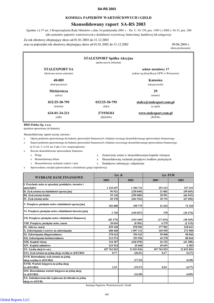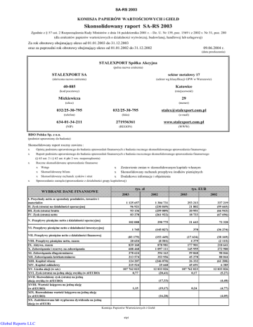 SA-RS 2003 KOMISJA PAPIERÓW WARTOŚCIOWYCH i GIEŁD Skonsolidowany raport SA-RS 2003 Zgodnie z § 57 ust. 2 Rozporządzenia Rady Ministrów z dnia 16 października 2001 r. - Dz. U. Nr 139, poz. 1569 i z 2002 r. Nr 31, poz. 280 (dla emitentów papierów wartościowych o działalności wytwórczej, budowlanej, handlowej lub usługowej) Za rok obrotowy obejmujący okres od 01.01.2003 do 31.12.2003 oraz za poprzedni rok obrotowy obejmujący okres od 01.01.2002 do 31.12.2002 09.06.2004 r. (data przekazania) STALEXPORT Spółka Akcyjna (pełna nazwa emitenta) STALEXPORT SA sektor metalowy 17 (skrócona nazwa emitenta) (sektor wg klasyfikacji GPW w Warszawie) 40-085 Katowice (kod pocztowy) (miejscowość) Mickiewicza 29 (ulica) (numer) 032/25-30-795 032/25-30-795 [email protected] (telefon) (faks) (e-mail) 634-01-34-211 271936361 www.stalexport.com.pl (NIP) (REGON) (WWW) BDO Polska Sp. z o.o. (podmiot uprawniony do badania) Skonsolidowany raport roczny zawiera : x Opinię podmiotu uprawnionego do badania sprawozdań finansowych z badania rocznego skonsolidowanego sprawozdania finansowego x Raport podmiotu uprawnionego do badania sprawozdań finansowych z badania roczcznego skonsolidowanego sprawozdania finansowego (§ 63 ust. 2 i § 62 ust. 6 pkt 2 ww. rozporządzenia) x x Roczne skonsolidowane sprawozdanie finansowe x Wstęp x Skonsolidowany bilans x Skonsolidowany rachunek zysków i strat x x x Zestawienie zmian w skonsolidowanym kapitale własnym Skonsolidowany rachunek przepływu środków pieniężnych Dodatkowe informacje i objaśnienia Sprawozdanie zarządu (sprawozdanie z działalności grupy kapitałowej) tys. zł WYBRANE DANE FINANSOWE 2003 I. Przychody netto ze sprzedaży produktów, towarów i materiałów II. Zysk (strata) na działalności operacyjnej III. Zysk (strata) brutto IV. Zysk (strata) netto 253 213 21 802 20 951 18 733 337 219 (59 665) (66 943) (67 696) 102 088 290 775 21 643 72 328 1 745 (145 827) 370 (36 274) (83 179) 20 654 839 160 688 468 278 624 213 574 124 207 215 524 107 762 023 0,77 (153 449) (8 501) 878 981 1 097 111 394 163 353 956 (246 070) 25 668 12 833 826 (20,41) (17 634) 4 379 177 901 145 955 59 068 45 278 26 332 45 691 107 762 023 0,17 (38 169) (2 115) 218 641 272 900 98 046 88 044 (61 208) 6 385 12 833 826 (5,27) (17,33) 1,15 (19,17) (16,28) Komisja Papierów Wartościowych i Giełd styt Global Reports LLC 2002 1 304 731 (230 849) (259 009) (261 922) VI. Przepływy pieniężne netto z działalności inwestycyjnej VIII. Przepływy pieniężne netto, razem IX. Aktywa, razem X. Zobowiązania i rezerwy na zobowiązania XI. Zobowiązania długoterminowe XII. Zobowiązania krótkoterminowe XIII. Kapitał własny XIV. Kapitał zakładowy XV. Liczba akcji (w szt.) XVI. Zysk (strata) na jedną akcję zwykłą (w zł/EURO) XVII. Rozwodniony zysk (strata) na jedną akcję zwykłą (w zł/EURO) XVIII. Wartość księgowa na jedną akcję (w zł/EURO) XIX. Rozwodniona wartość księgowa na jedną akcję (w zł/EURO) XX. Zadeklarowana lub wypłacona dywidenda na jedną akcję (w zł/EUR) 2003 1 125 657 96 921 93 136 83 278 V. Przepływy pieniężne netto z działalności operacyjnej VII. Przepływy pieniężne netto z działalności finansowej tys. EUR 2002 (4,48) 0,24 (4,77) (4,05) Raport z badania sprawozdania finansowego Grupy Kapitałowej Stalexport S.A. za 2003 rok [w tys. złotych] GRUPA KAPITAŁOWA STALEXPORT S.A. 40-085 Katowice, ul. Mickiewicza 29 Opinia z badania skonsolidowanego sprawozdania finansowego za okres od 1 stycznia do 31 grudnia 2003 roku 1 Global Reports LLC BDO Polska sp. z o.o. Raport z badania sprawozdania finansowego Grupy Kapitałowej Stalexport S.A. za 2003 rok [w tys. złotych] Opinia niezależnego biegłego rewidenta dla Akcjonariuszy, Rady Nadzorczej i Zarządu Grupy Kapitałowej STALEXPORT S.A. Przeprowadziliśmy badanie załączonego skonsolidowanego sprawozdania finansowego Grupy Kapitałowej STALEXPORT S.A. z siedzibą w Katowicach, stanowiącego raport roczny dla Komisji Papierów Wartościowych i Giełd, na które składa się: − − − − − − wprowadzenie do sprawozdania finansowego; skonsolidowany bilans sporządzony na dzień 31 grudnia 2003 roku, który po stronie aktywów i pasywów wykazuje sumę 839.159.369,51 złotych; skonsolidowany rachunek zysków i strat za okres od dnia 1 stycznia 2003 roku do dnia 31 grudnia 2003 roku wykazujący zysk netto w wysokości 83.277.925,52 złotych; zestawienie zmian w skonsolidowanym kapitale własnym wykazujące zwiększenie kapitału własnego o kwotę 370.277.393,55 złotych; rachunek przepływów pieniężnych wykazujący zwiększenie stanu środków pieniężnych netto w okresie od dnia 1 stycznia do 31 grudnia 2003 roku o kwotę 20.653.705,29 złotych; dodatkowe informacje i objaśnienia. Za sporządzenie tego sprawozdania odpowiada Zarząd podmiotu dominującego. Naszym zadaniem było zbadanie i wyrażenie opinii o rzetelności, prawidłowości i jasności tego sprawozdania finansowego oraz prawidłowości ksiąg rachunkowych stanowiących podstawę jego sporządzenia. Badanie to przeprowadziliśmy stosownie do postanowień: 1) rozdziału 7 ustawy z dnia 29.09.1994 o rachunkowości (Dz.U. nr 76 poz. 694 z 2002 roku), 2) norm wykonywania zawodu biegłego rewidenta, wydanych przez Krajową Radę Biegłych Rewidentów. Badanie sprawozdania finansowego zaplanowaliśmy i przeprowadziliśmy w taki sposób, aby uzyskać racjonalną pewność, pozwalającą na wyrażenie opinii o sprawozdaniu. W szczególności badanie obejmowało sprawdzenie poprawności – w dużej mierze w sposób wyrywkowy – dowodów i zapisów księgowych, z których wynikają liczby i informacje zawarte w sprawozdaniu finansowym, zastosowanych przez grupę kapitałową zasad rachunkowości jak i całościową ocenę sprawozdania finansowego. Uważamy, że badanie dostarczyło wystarczającej podstawy do wyrażenia miarodajnej opinii. Znaczącym zdarzeniem badanego okresu było zamknięcie subskrypcji akc