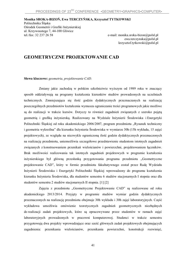 RD PROCEEDINGS OF 23 CONFERENCE ▪GEOMETRY▪GRAPHICS▪COMPUTER▪ Monika SROKA-BIZOŃ, Ewa TERCZYŃSKA, Krzysztof TYTKOWSKI Politechnika Śląska Ośrodek Geometrii i Grafiki Inżynierskiej ul. Krzywoustego 7, 44-100 Gliwice tel./fax: 32 237 26 58 e-mail: [email protected] [email protected] [email protected] GEOMETRYCZNE PROJEKTOWANIE CAD Słowa kluczowe: geometria, projektowanie CAD. Zmiany jakie zachodzą w polskim szkolnictwie wyższym od 1989 roku w znaczący sposób oddziaływają na programy kształcenia kierunków studiów prowadzonych na uczelniach technicznych. Zmniejszająca się ilość godzin dydaktycznych przeznaczanych na realizację poszczególnych przedmiotów kształcenia wymusza ograniczanie treści programowych jakie możliwe są do realizacji w trakcie kursów. Dotyczy to również zagadnień związanych z szeroko pojętą geometrią i grafiką inżynierską. Realizowany na Wydziale Inżynierii Środowiska i Energetyki Politechniki Śląskiej od roku akademickiego 2006/2007, program przedmiotu „Rysunek techniczny i geometria wykreślna” dla kierunku Inżynieria Środowiska w wymiarze 30h (15h wykładu, 15 zajęć projektowych), ze względu na niezwykle ograniczoną ilość godzin dydaktycznych przeznaczonych na realizację przedmiotu, uniemożliwia szczegółowe przedstawienie studentom istotnych zagadnień związanych z konstruowaniem przenikań wielościanów i powierzchni, projektowaniem łączników. Brak możliwości realizowania tak istotnych zagadnień projektowych w programie kształcenia inżynierskiego był główną przesłanką przygotowania programu przedmiotu „Geometryczne projektowanie CAD”, który w formie przedmiotu fakultatywnego został przez Radę Wydziału Inżynierii Środowiska i Energetyki Politechniki Śląskiej wprowadzony do programu kształcenia kierunku Inżynieria Środowiska, dla studentów semestru 6 studiów stacjonarnych I stopnia oraz dla studentów semestru 2 studiów stacjonarnych II stopnia. [1] [2] Zajęcia z przedmiotu „Geometryczne Projektowanie CAD” są realizowane od roku akademickiego 2013/2014. Przyjęty w programie studiów wymiar godzin dydaktycznych przeznaczonych na realizację przedmiotu obejmuje 30h wykładu i 30h zajęć laboratoryjnych. Część wykładowa umożliwia omówienie teoretycznych zagadnień geometrycznych niezbędnych do realizacji zadań projektowych, które są opracowywane przez studentów w ramach zajęć laboratoryjnych prowadzonych w pracowni komputerowej. Studenci w trakcie semestru przygotowują dwa projekty wprowadzające oraz sześć głównych zadań projektowych obejmujących zagadnienia: przenikania wielościanów, przenikania 41 powierzchni, konstrukcji rozwinięć, RD PROCEEDINGS OF 23 optymalizacji przyjmowanych CONFERENCE ▪GEOMETRY▪GRAPHICS▪COMPUTER▪ rozwiązań projektowych z uwzględnieniem poprawności zastosowanych rozwiązań geometrycznych. [rys. 1, 2] Zindywidualizowane zadania projektowe opracowywane są przez studentów w programie AutoCAD. Rys. 1 Założenia do projektu obejmującego zagadnienia przenikania wielościanów Rys. 2 Praca studencka – praca projektowa obejmująca zagadnienia przenikania powierzchni – założenia wstępne do projektu i widok przyjętego rozwiązania Literatura: [1] Polański S.: Zastosowanie rozwinięć powierzchni w technice, PWN, Warszawa 1970 [2] Tytkowski K.T.:Available Pipe Connectors Versus Their Geometrical Correctness. The Journal Biuletyn of Polish Society for Geometry and Engineering Graphics, vol. 25, 2013 42