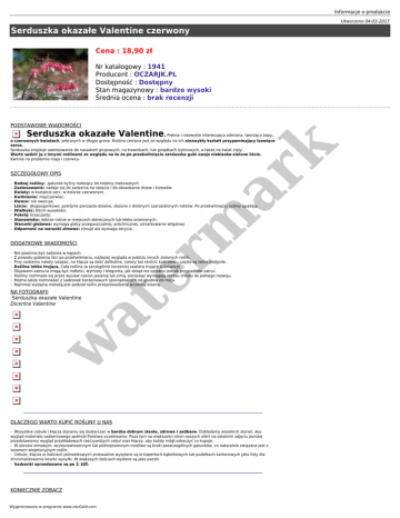 Informacje o produkcie Utworzono 04-03-2017 Serduszka okazałe Valentine czerwony Cena : 18,90 zł Nr katalogowy : 1941 Producent : OCZARJK.PL Dostępność : Dostępny Stan magazynowy : bardzo wysoki Średnia ocena : brak recenzji PODSTAWOWE WIADOMOŚCI Serduszka okazałe Valentine. Piękna i niezwykle interesująca odmiana, tworząca kępy, SZCZEGÓŁOWY OPIS - Rodzaj rośliny: gatunek byliny należący do rodziny makowatych. Zastosowanie: nadaje się do sadzenia na rabacie i do obsadzania drzew i krzewów. Kwiaty: w kształcie serc, w kolorze czerwonym. Kwitnienie: maj/czerwiec. Owoce: nie owocuje. Liście: długoogonkowe, potrójnie pierzasto-dzielne, złożone z drobnych szarozielonych listków. Po przekwitnięciu rośliny opadają. Wielkość: 60cm wysokości. Pokrój: krzaczasty. Stanowisko: dobrze rośnie w miejscach słonecznych lub lekko ocienionych. Warunki glebowe: wymaga gleby przepuszczalnej, próchnicznej, umiarkowanie wilgotnej. Odporność na warunki zimowe: zimuje ale wymaga okrycia. DODATKOWE WIADOMOŚCI - er m ar k o czerwonych kwiatach, zebranych w długie grona. Roślina ceniona jest ze względu na ich niezwykły kształt przypominający łzawiące serce. Serduszka znajduje zastosowanie do nasadzeń grupowych, na trawnikach, lub grządkach bylinowych, a także na kwiat cięty. Warto sadzić ją z innymi roślinami ze względu na to że po przekwitnięciu serduszka gubi swoje niebiesko-zielone liście. Kwitnie na przełomie maja i czerwca. Nie powinna być sadzona w kępach. Z powodu gubienia liści po przekwitnięciu, najlepiej wygląda w pobliżu innych zielonych roślin. Przy sadzeniu należy uważać, na kłącza są dość delikatne, należy też skrócić końcówki , często są lekko podgniłe. Roślina lekko trująca. Cała roślina (a szczególnie korzenie) zawiera trujące substancje. Objawami zatrucia mogą być mdłości, wymioty i biegunka, jak dotąd nie opisano jednak przypadków zatruć. Rośliny rozmnaża się przez wysiew nasion jesienią lub zimą, ponieważ wymagają okresu chłodu do pełnego rozwoju. Można także rozmnażać z sadzonek korzeniowych sporządzanych od grudnia do maja. Najmniej wydajną metodą jest podział roślin przeprowadzany wczesną wiosną. w at NA FOTOGRAFII Serduszka okazałe Valentine Dicentra Valentine DLACZEGO WARTO KUPIĆ ROŚLINY U NAS - Wszystkie cebule i kłącza staramy się dostarczać w bardzo dobrym stanie, zdrowe i zadbane. Dokładamy wszelkich starań, aby wygląd materiału sadzeniowego spełniał Państwa oczekiwania. Poza tym na większości stron naszych ofert na ostatnim zdjęciu poniżej przedstawiamy wygląd przykładowych rzeczywistych cebul oraz kłączy, aby każdy mógł zobaczyć co kupuje. - W okresie zimowym, wczesnowiosennym lub późnojesiennym możliwe są braki poszczególnych gatunków, co naturalnie związane jest z sezonem wegetacyjnym roślin. - Cebule, kłącza w ilościach jednostkowych przeważnie wysyłane są w kopertach bąbelkowych lub pudełkach kartonowych jako listy dla zminimalizowania kosztu wysyłki. W większych ilościach wysłane są jako paczki. - Sadzonki sprzedawane są po 1 szt. KONIECZNIE ZOBACZ Wygenerowano w programie www.oscGold.com er m ar k at w