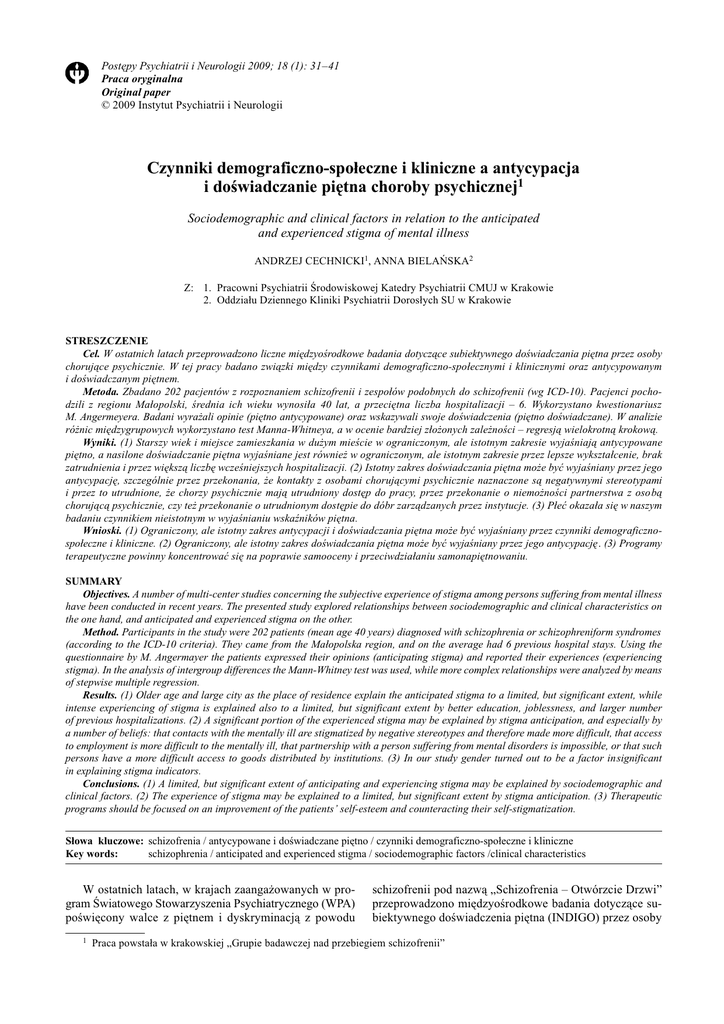 Postêpy Psychiatrii i Neurologii 2009; 18 (1): 3141 Praca oryginalna Original paper © 2009 Instytut Psychiatrii i Neurologii Czynniki demograficzno-spo³eczne i kliniczne a antycypacja i dowiadczanie piêtna choroby psychicznej1 Sociodemographic and clinical factors in relation to the anticipated and experienced stigma of mental illness ANDRZEJ CECHNICKI1, ANNA BIELAÑSKA2 Z: 1. Pracowni Psychiatrii rodowiskowej Katedry Psychiatrii CMUJ w Krakowie 2. Oddzia³u Dziennego Kliniki Psychiatrii Doros³ych SU w Krakowie STRESZCZENIE Cel. W ostatnich latach przeprowadzono liczne miêdzyorodkowe badania dotycz¹ce subiektywnego dowiadczania piêtna przez osoby choruj¹ce psychicznie. W tej pracy badano zwi¹zki miêdzy czynnikami demograficzno-spo³ecznymi i klinicznymi oraz antycypowanym i dowiadczanym piêtnem. Metoda. Zbadano 202 pacjentów z rozpoznaniem schizofrenii i zespo³ów podobnych do schizofrenii (wg ICD-10). Pacjenci pochodzili z regionu Ma³opolski, rednia ich wieku wynosi³a 40 lat, a przeciêtna liczba hospitalizacji 6. Wykorzystano kwestionariusz M. Angermeyera. Badani wyra¿ali opinie (piêtno antycypowane) oraz wskazywali swoje dowiadczenia (piêtno dowiadczane). W analizie ró¿nic miêdzygrupowych wykorzystano test Manna-Whitneya, a w ocenie bardziej z³o¿onych zale¿noci regresj¹ wielokrotn¹ krokow¹. Wyniki. (1) Starszy wiek i miejsce zamieszkania w du¿ym miecie w ograniczonym, ale istotnym zakresie wyjaniaj¹ antycypowane piêtno, a nasilone dowiadczanie piêtna wyjaniane jest równie¿ w ograniczonym, ale istotnym zakresie przez lepsze wykszta³cenie, brak zatrudnienia i przez wiêksz¹ liczbê wczeniejszych hospitalizacji. (2) Istotny zakres dowiadczania piêtna mo¿e byæ wyjaniany przez jego antycypacjê, szczególnie przez przekonania, ¿e kontakty z osobami choruj¹cymi psychicznie naznaczone s¹ negatywnymi stereotypami i przez to utrudnione, ¿e chorzy psychicznie maj¹ utrudniony dostêp do pracy, przez przekonanie o niemo¿noci partnerstwa z osob¹ choruj¹c¹ psychicznie, czy te¿ przekonanie o utrudnionym dostêpie do dóbr zarz¹dzanych przez instytucje. (3) P³eæ okaza³a siê w naszym badaniu czynnikiem nieistotnym w wyjanianiu wskaników piêtna. Wnioski. (1) Ograniczony, ale istotny zakres antycypacji i dowiadczania piêtna mo¿e byæ wyjaniany przez czynniki demograficznospo³eczne i kliniczne. (2) Ograniczony, ale istotny zakres dowiadczania piêtna mo¿e byæ wyjaniany przez jego antycypacjê. (3) Programy terapeutyczne powinny koncentrowaæ siê na poprawie samooceny i przeciwdzia³aniu samonapiêtnowaniu. SUMMARY Objectives. A number of multi-center studies concerning the subjective experience of stigma among persons suffering from mental illness have been conducted in recent years. The presented study explored relationships between sociodemographic and clinical characteristics on the one hand, and anticipated and experienced stigma on the other. Method. Participants in the study were 202 patients (mean age 40 years) diagnosed with schizophrenia or schizophreniform syndromes (according to the ICD-10 criteria). They came from the Ma³opolska region, and on the average had 6 previous hospital stays. Using the questionnaire by M. Angermayer the patients expressed their opinions (anticipating stigma) and reported their experiences (experiencing stigma). In the analysis of intergroup differences the Mann-Whitney test was used, while more complex relationships were analyzed by means of stepwise multiple regression. Results. (1) Older age and large city as the place of residence explain the anticipated stigma to a limited, but significant extent, while intense experiencing of stigma is explained also to a limited, but significant extent by better education, joblessness, and larger number of previous hospitalizations. (2) A significant portion of the experienced stigma may be explained by stigma anticipation, and especially by a number of beliefs: that contacts with the mentally ill are stigmatized by negative stereotypes and therefore made more difficult, that access to employment is more difficult to the mentally ill, that partnership with a person suffering from mental disorders is impossible, or that such persons have a more difficult access to goods distributed by institutions. (3) In our study gender turned out to be a factor insignificant in explaining stigma indicators. Conclusions. (1) A limited, but significant extent of anticipating and experiencing stigma may be explained by sociodemographic and clinical factors. (2) The experience of stigma may be explained to a limited, but significant extent by stigma anticipation. (3) Therapeutic programs should be focused on an improvement of the patients self-esteem and counteracting their self-stigmatization. S³owa kluczowe: schizofrenia / antycypowane i dowiadczane piêtno / czynniki demograficzno-spo³eczne i kliniczne Key words: schizophrenia / anticipated and experienced stigma / sociodemographic factors /clinical characteristics W ostatnich latach, w krajach zaanga¿owanych w program wiatowego Stowarzyszenia Psychiatrycznego (WPA) powiêcony walce z piêtnem i dyskryminacj¹ z powodu 1 schizofrenii pod nazw¹ Schizofrenia Otwórzcie Drzwi przeprowadzono miêdzyorodkowe badania dotycz¹ce subiektywnego dowiadczenia piêtna (INDIGO) przez osoby Praca powsta³a w krakowskiej Grupie badawczej nad przebiegiem schizofrenii 32 choruj¹ce psychicznie w Europie (w tym Polsce), Ameryce Pó³nocnej i Po³udniowej [1]. Badaniem objêto grupê 736 osób. Poszukiwano odpowiedzi na pytania o poziom dyskryminacji w ró¿nych krajach, o obszary najbardziej dotkniête piêtnem i o zwi¹zki miêdzy poszczególnymi czynnikami demograficznymi, klinicznymi a antycypowanym i dowiadczanym piêtnem. Niezale¿nie od ró¿nic kulturowych, wyniki wskazuj¹ na stosunkowo wysoki poziom dowiadczanego piêtna i dyskryminacji. Stwierdzono, ¿e w dwóch kluczowych obszarach dyskryminacji, jakimi s¹ praca i stosunki intymne, 