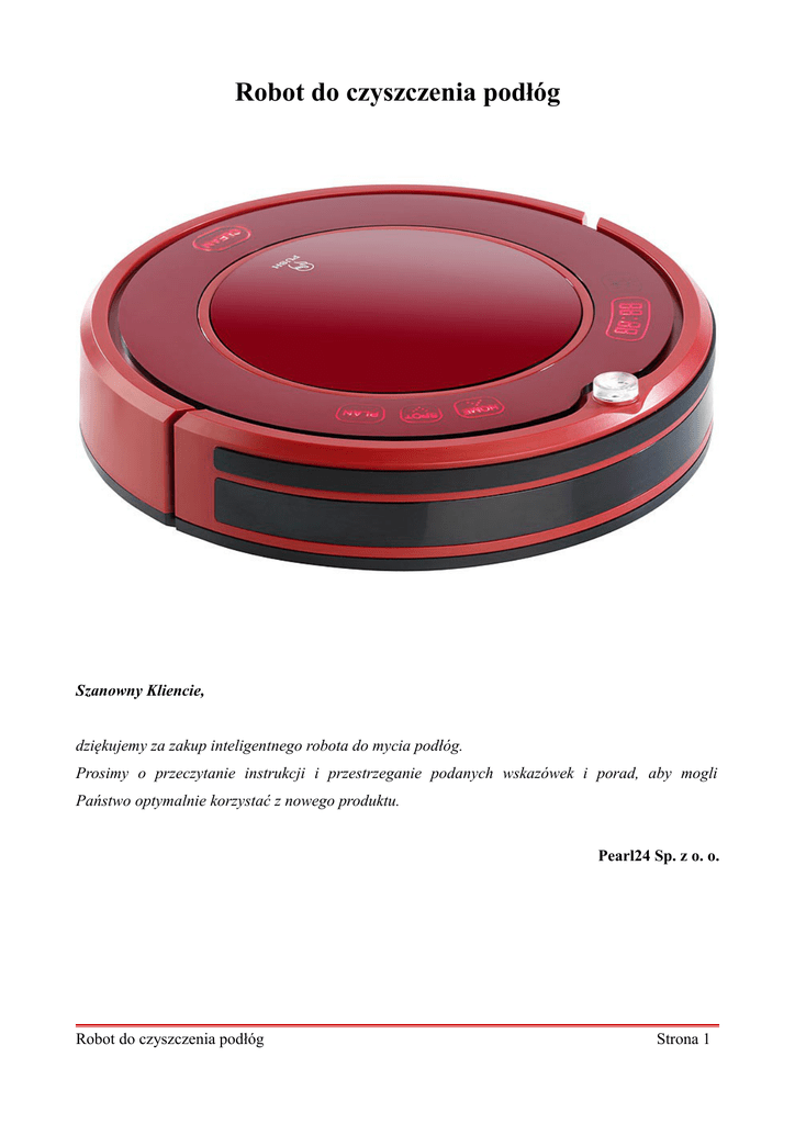 Robot do czyszczenia podłóg Szanowny Kliencie, dziękujemy za zakup inteligentnego robota do mycia podłóg. Prosimy o przeczytanie instrukcji i przestrzeganie podanych wskazówek i porad, aby mogli Państwo optymalnie korzystać z nowego produktu. Pearl24 Sp. z o. o. Robot do czyszczenia podłóg Strona 1 Zawartość zestawu: • Robot • Stacja ładowania • Pilot zdalnego sterowania • Szczotka (do czyszczenia pojemnika na kurz) • 2 szczotki do czyszczenia • Filtr HEPA • Ściereczka do kurzu • Zasilacz • Instrukcja obsługi. WAŻNE INFORMACJE Bezpieczeństwo • Niniejsza instrukcja ma na celu zapoznanie Państwa z zasadami prawidłowego korzystania z produktu. Zaleca się przechowywanie instrukcji w łatwo dostępnym miejscu, aby w razie potrzeby mogli Państwo zweryfikować informacje. • Wszelkie modyfikacje produktu obniżają poziom jego bezpieczeństwa. UWAGA! Istnieje ryzyko obrażeń! • Nie należy rozkładać ani naprawiać urządzenia samodzielnie! • Zaleca się ostrożne obchodzenie się z produktem. Produkt może ulec uszkodzeniu w wyniku uderzenia, wstrząsów lub upadku nawet z niewielkiej wysokości. • Produkt należy trzymać z dala od wilgoci i wysokiej temperatury. • Nie należy zanurzać urządzenia w wodzie oraz innych płynach. • Zaleca się sprawdzanie urządzenia przed każdym użyciem. Jeżeli urządzenie, przewód lub wtyczka mają widoczne uszkodzenia, urządzenie nie może być zostać użyte. Nie należy używać urządzenia, jeśli działa nieprawidłowo lub zostało upuszczone. • Należy wyłączyć urządzenie, gdy nie jest w użyciu. • Urządzenia należy używać tylko w zamkniętych pomieszczeniach. • Urządzenie nie pokonuje przeszkód wyższych niż 10 mm. • Nie należy używać urządzenia w mokrych lub wilgotnych środowiskach, tj. łazienka i pralnia. Robot do czyszczenia podłóg Strona 2 • W celu uniknięcia wypadków, przed użyciem urządzenia, sprawdź czy nie ma w obszarze czyszczenia żadnych przedmiotów (takich jak ubrania, papiery, kable, linki lub kruche przedmioty). Zasłony i firanki powinny znajdować się w odpowiedniej odległości od podłogi tak, aby urządzenie nie miało z nimi kontaktu. • Nie należy siadać na urządzeniu, ani stawiać na nim żadnych przedmiotów. • Nie należy używać urządzenia do sprzątania papierosów, gorącego popiołu lub łatwopalnych cieczy (np. benzyny). • Należy używać tylko oryginalnych części (zasilacz i akumulator), aby naładować urządzenie. • Nie należy ładować urządzenia, gdy przewód ładowania lub wtyczka są uszkodzone. • Przed przystąpieniem do czyszczenia urządzenia, należy je wyłączyć, odłączyć przewód zasilający od gniazdka elektrycznego i wyjąć akumulator. • Przed wymianą lub wyjęciem akumulatora należy odłączyć przewód zasilający od gniazdka elektrycznego. • To urządzenie nie jest przeznaczone do użytku przez osoby (w tym dzieci) z ograniczeniami sensorycznymi czy umysłowymi, lub z brakiem doświadczenia i / lub wiedzy, chyba że są one nadzorowane przez osobę odpowiedzialną za ich bezpieczeństwo lub otrzymały instrukcje jak korzystać z urządzenia. Dzieci powinny być nadzorowane, aby nie bawiły się urządzeniem. • Wszelkie prawa do wprowadzania zmian technicznych oraz eliminacji błędów są zastrzeżone. Ważne wskazówki dotyczące utylizacji Urządzenia elektrycznego nie zalicza się do odpadów gospodarstwa domowego. W celu właściwej utylizacji urządzenia należy skontaktować się z organizacją odpowiedzialną za zbiórkę elektroodpadów w wybranej miejscowości. Robot do czyszczenia podłóg Strona 3 Ważne wskazówki dotyczące baterii i ich utylizacji Baterii nie zalicza się do odpadów gospodarstwa domowego. Jako konsumenci są Państwo zobowiązani do właściwej utylizacji zużytych baterii. Zużyte baterie należy wyrzucić do przeznaczonego do tego celu pojemnika lub zwrócić do sklepu, w którym są sprzedawane. • Akumulatory mają niższe napięcie wyjściowe niż baterie. Powoduje to, że niektóre urządzenia do działania potrzebują baterii, a nie akumulatora. • Baterie należy przechowywać w miejscu niedostępnym dla dzieci. • Baterie, z których wylewa się ciesz są niebezpieczne. Należy ich dotykać tylko w odpowiednich rękawiczkach. • Nie wolno otwierać baterii i wrzucać ich do ognia. • Zaleca się wyjmowanie baterii z urządzenia, jeśli pozostaje nieużywane przez dłuższy czas. • Zwykłe baterie nie mogą być ładowane. UWAGA! Istnieje ryzyko wybuchu! • Należy używać zawsze razem baterii tego samego typu i wymieniać wszystkie baterie w urządzeniu w tym samym czasie! Deklaracja zgodności PEARL.GmbH oświadcza, że produkt NC-5725 jest zgodny z dyrektywą dotyczącą bezpieczeństwa produktów 2001/95/EG, dyrektywą EMV 2004/108/EG i dyrektywą RoHS 2011/65/EU. Robot do czyszczenia podłóg Strona 4 SZCZEGÓŁY PRODUKTU Robot 1. Wyświetlacz LED 2. Odbiornik sygnału podczerwieni 3. Zderzak 4. Obudowa z wyświetlaczem i przyciskami 5. Przyciski 6. Obudowa komory pojemnika na kurz 7. Przycisk ON/OFF 1. Prawe koło 2. Prawa szczotka do czyszczenia 3. Wlot powietrza 4. Komora akumulatora 5. Przednie koło 6. Styki ładowania 7. Lewa szczotka do czyszczenia 8. Obudowa 9. Lampa UV 10. Lewe koło 11. Złącze zasilania 12. Osłona baterii guzikowych 1. Pokrywa komory pojemnika na kurz 2. Pojemnik na kurz 3. Przycisk ON/OFF Robot do czyszczenia podłóg Strona 5 1. Filtr główny 2. Uchwyt filtra HEPA 3. Filtr HEPA 4. Pojemnik na kurz Stacja ładowania 1. Okienko transmisji dla sygnału podczerwieni 2. Styki ładowania 3. Złącze zasilania 4. Pokrywa 5. Generator sygnału podczerwieni 6. Wskaźnik pracy Pilot zdalnego sterowania 1. Przycisk ON/OFF 2. Przyciski kierunkowe 3. Przycisk programowania przycisk SPOT 4. Przycisk HOME 5. Przycisk MODE (tryb) Wyświetlacz i przyciski 1 Wyświetlacz 2 Przycisk UV 3 4 Pokazuje w formie liczb