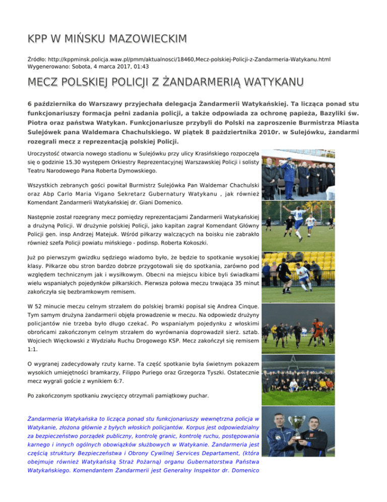 KPP W MIŃSKU MAZOWIECKIM Źródło: http://kppminsk.policja.waw.pl/pmm/aktualnosci/18460,Mecz-polskiej-Policji-z-Zandarmeria-Watykanu.html Wygenerowano: Sobota, 4 marca 2017, 01:43 MECZ POLSKIEJ POLICJI Z ŻANDARMERIĄ WATYKANU 6 października do Warszawy przyjechała delegacja Żandarmerii Watykańskiej. Ta licząca ponad stu funkcjonariuszy formacja pełni zadania policji, a także odpowiada za ochronę papieża, Bazyliki św. Piotra oraz państwa Watykan. Funkcjonariusze przybyli do Polski na zaproszenie Burmistrza Miasta Sulejówek pana Waldemara Chachulskiego. W piątek 8 pażdziertnika 2010r. w Sulejówku, żandarmi rozegrali mecz z reprezentacją polskiej Policji. Uroczystość otwarcia nowego stadionu w Sulejówku przy ulicy Krasińskiego rozpoczęła się o godzinie 15.30 występem Orkiestry Reprezentacyjnej Warszawskiej Policji i solisty Teatru Narodowego Pana Roberta Dymowskiego. Wszystkich zebranych gości powitał Burmistrz Sulejówka Pan Waldemar Chachulski oraz Abp Carlo Maria Vigano Sekretarz Gubernatury Watykanu , jak również Komendant Żandarmerii Watykańskiej dr. Giani Domenico. Następnie został rozegrany mecz pomiędzy reprezentacjami Żandarmerii Watykańskiej a drużyną Policji. W drużynie polskiej Policji, jako kapitan zagrał Komendant Główny Policji gen. insp Andrzej Matejuk. Wśród piłkarzy walczących na boisku nie zabrakło również szefa Policji powiatu mińskiego - podinsp. Roberta Kokoszki. Już po pierwszym gwizdku sędziego wiadomo było, że będzie to spotkanie wysokiej klasy. Piłkarze obu stron bardzo dobrze przygotowali się do spotkania, zarówno pod względem technicznym jak i wysiłkowym. Obecni na miejscu kibice byli świadkami wielu wspaniałych pojedynków piłkarskich. Pierwsza połowa meczu trwająca 35 minut zakończyła się bezbramkowym remisem. W 52 minucie meczu celnym strzałem do polskiej bramki popisał się Andrea Cinque. Tym samym drużyna żandarmerii objęła prowadzenie w meczu. Na odpowiedz drużyny policjantów nie trzeba było długo czekać. Po wspaniałym pojedynku z włoskimi obrońcami zakończonym celnym strzałem do wyrównania doprowadził sierż. sztab. Wojciech Więckowski z Wydziału Ruchu Drogowego KSP. Mecz zakończył się remisem 1:1. O wygranej zadecydowały rzuty karne. Ta część spotkanie była świetnym pokazem wysokich umiejętności bramkarzy, Filippo Puriego oraz Grzegorza Tyszki. Ostatecznie mecz wygrali goście z wynikiem 6:7. Po zakończonym spotkaniu zwycięzcy otrzymali pamiątkowy puchar. Żandarmeria Watykańska to licząca ponad stu funkcjonariuszy wewnętrzna policja w Watykanie, złożona głównie z byłych włoskich policjantów. Korpus jest odpowiedzialny za bezpieczeństwo porządek publiczny, kontrolę granic, kontrolę ruchu, postępowania karnego i innych ogólnych obowiązków służbowych w Watykanie. Żandarmeria jest częścią struktury Bezpieczeństwa i Obrony Cywilnej Services Departament, (która obejmuje również Watykańską Straż Pożarną) organu Gubernatorstwa Państwa Watykańskiego. Komendantem Żandarmerii jest Generalny Inspektor dr. Domenico Giani, który na stanowisku tym zastąpił Camillo Cibin. Żandarmem może zostać osoba, która jest w wieku od 20 do 25 lat posiada obywatelstwo włoskie i przeszła specjalistyczne szkolenie. ab/rm/rj foto:KSP Ocena: 0/5 (0) Tweetnij