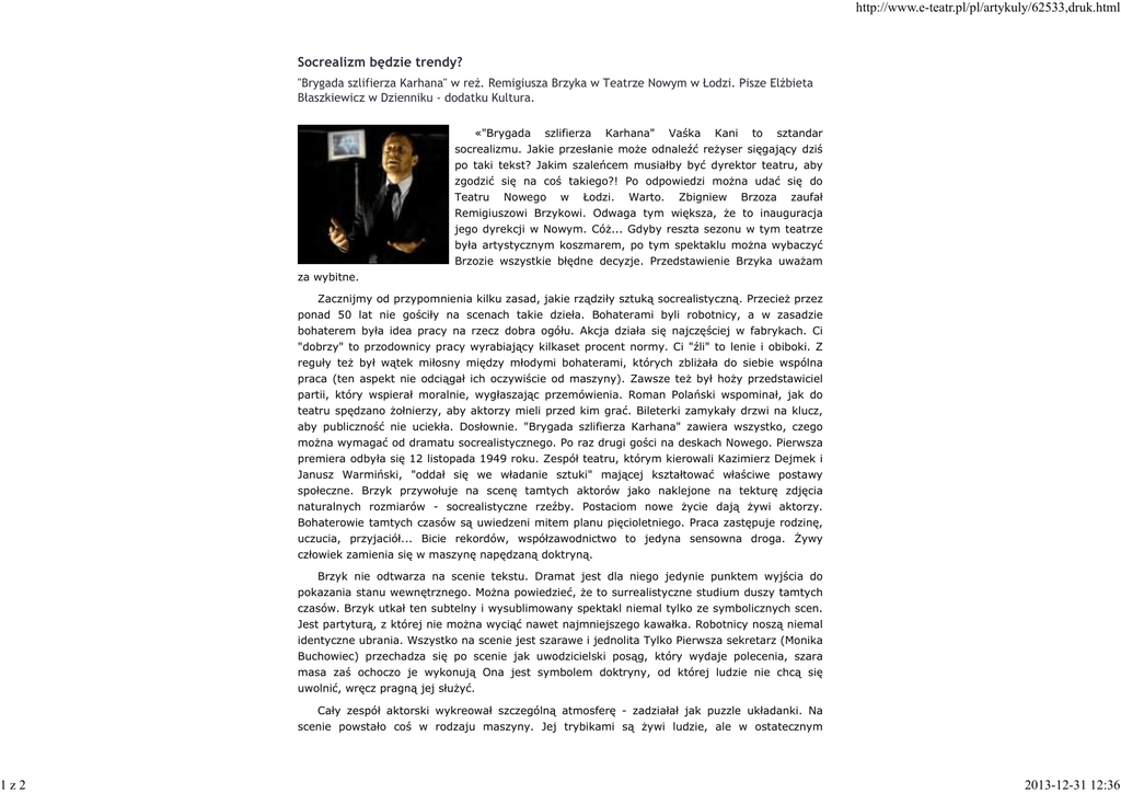http://www.e-teatr.pl/pl/artykuly/62533,druk.html Socrealizm będzie trendy? "Brygada szlifierza Karhana" w reż. Remigiusza Brzyka w Teatrze Nowym w Łodzi. Pisze Elżbieta Błaszkiewicz w Dzienniku - dodatku Kultura. «"Brygada szlifierza Karhana" Vaśka Kani to sztandar socrealizmu. Jakie przesłanie może odnaleźć reżyser sięgający dziś po taki tekst? Jakim szaleńcem musiałby być dyrektor teatru, aby zgodzić się na coś takiego?! Po odpowiedzi można udać się do Teatru Nowego w Łodzi. Warto. Zbigniew Brzoza zaufał Remigiuszowi Brzykowi. Odwaga tym większa, że to inauguracja jego dyrekcji w Nowym. Cóż... Gdyby reszta sezonu w tym teatrze była artystycznym koszmarem, po tym spektaklu można wybaczyć Brzozie wszystkie błędne decyzje. Przedstawienie Brzyka uważam za wybitne. Zacznijmy od przypomnienia kilku zasad, jakie rządziły sztuką socrealistyczną. Przecież przez ponad 50 lat nie gościły na scenach takie dzieła. Bohaterami byli robotnicy, a w zasadzie bohaterem była idea pracy na rzecz dobra ogółu. Akcja działa się najczęściej w fabrykach. Ci "dobrzy" to przodownicy pracy wyrabiający kilkaset procent normy. Ci "źli" to lenie i obiboki. Z reguły też był wątek miłosny między młodymi bohaterami, których zbliżała do siebie wspólna praca (ten aspekt nie odciągał ich oczywiście od maszyny). Zawsze też był hoży przedstawiciel partii, który wspierał moralnie, wygłaszając przemówienia. Roman Polański wspominał, jak do teatru spędzano żołnierzy, aby aktorzy mieli przed kim grać. Bileterki zamykały drzwi na klucz, aby publiczność nie uciekła. Dosłownie. "Brygada szlifierza Karhana" zawiera wszystko, czego można wymagać od dramatu socrealistycznego. Po raz drugi gości na deskach Nowego. Pierwsza premiera odbyła się 12 listopada 1949 roku. Zespół teatru, którym kierowali Kazimierz Dejmek i Janusz Warmiński, "oddał się we władanie sztuki" mającej kształtować właściwe postawy społeczne. Brzyk przywołuje na scenę tamtych aktorów jako naklejone na tekturę zdjęcia naturalnych rozmiarów - socrealistyczne rzeźby. Postaciom nowe życie dają żywi aktorzy. Bohaterowie tamtych czasów są uwiedzeni mitem planu pięcioletniego. Praca zastępuje rodzinę, uczucia, przyjaciół... Bicie rekordów, współzawodnictwo to jedyna sensowna droga. Żywy człowiek zamienia się w maszynę napędzaną doktryną. Brzyk nie odtwarza na scenie tekstu. Dramat jest dla niego jedynie punktem wyjścia do pokazania stanu wewnętrznego. Można powiedzieć, że to surrealistyczne studium duszy tamtych czasów. Brzyk utkał ten subtelny i wysublimowany spektakl niemal tylko ze symbolicznych scen. Jest partyturą, z której nie można wyciąć nawet najmniejszego kawałka. Robotnicy noszą niemal identyczne ubrania. Wszystko na scenie jest szarawe i jednolita Tylko Pierwsza sekretarz (Monika Buchowiec) przechadza się po scenie jak uwodzicielski posąg, który wydaje polecenia, szara masa zaś ochoczo je wykonują Ona jest symbolem doktryny, od której ludzie nie chcą się uwolnić, wręcz pragną jej służyć. Cały zespół aktorski wykreował szczególną atmosferę - zadziałał jak puzzle układanki. Na scenie powstało coś w rodzaju maszyny. Jej trybikami są żywi ludzie, ale w ostatecznym 1z2 2013-12-31 12:36 http://www.e-teatr.pl/pl/artykuly/62533,druk.html rozrachunku nie mają znaczenia.» "Socrealizm będzie trendy?" Elżbieta Błaszkiewicz Dziennik nr 272 online - dodatek Kultura 21-11-2008 e-teatr.pl - wortal teatru polskiego © Instytut Teatralny im. Zbigniewa Raszewskiego 2z2 2013-12-31 12:36