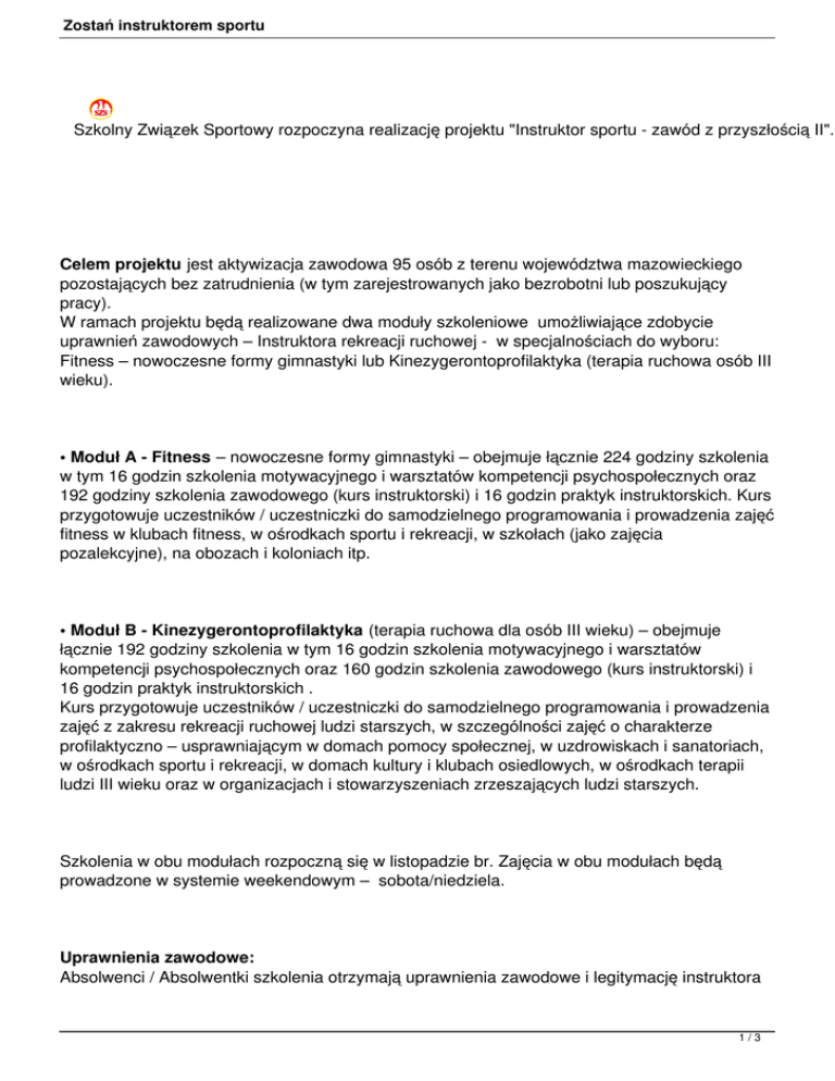 Zostań instruktorem sportu Szkolny Związek Sportowy rozpoczyna realizację projektu "Instruktor sportu - zawód z przyszłością II". Celem projektu jest aktywizacja zawodowa 95 osób z terenu województwa mazowieckiego pozostających bez zatrudnienia (w tym zarejestrowanych jako bezrobotni lub poszukujący pracy). W ramach projektu będą realizowane dwa moduły szkoleniowe umożliwiające zdobycie uprawnień zawodowych – Instruktora rekreacji ruchowej - w specjalnościach do wyboru: Fitness – nowoczesne formy gimnastyki lub Kinezygerontoprofilaktyka (terapia ruchowa osób III wieku). • Moduł A - Fitness – nowoczesne formy gimnastyki – obejmuje łącznie 224 godziny szkolenia w tym 16 godzin szkolenia motywacyjnego i warsztatów kompetencji psychospołecznych oraz 192 godziny szkolenia zawodowego (kurs instruktorski) i 16 godzin praktyk instruktorskich. Kurs przygotowuje uczestników / uczestniczki do samodzielnego programowania i prowadzenia zajęć fitness w klubach fitness, w ośrodkach sportu i rekreacji, w szkołach (jako zajęcia pozalekcyjne), na obozach i koloniach itp. • Moduł B - Kinezygerontoprofilaktyka (terapia ruchowa dla osób III wieku) – obejmuje łącznie 192 godziny szkolenia w tym 16 godzin szkolenia motywacyjnego i warsztatów kompetencji psychospołecznych oraz 160 godzin szkolenia zawodowego (kurs instruktorski) i 16 godzin praktyk instruktorskich . Kurs przygotowuje uczestników / uczestniczki do samodzielnego programowania i prowadzenia zajęć z zakresu rekreacji ruchowej ludzi starszych, w szczególności zajęć o charakterze profilaktyczno – usprawniającym w domach pomocy społecznej, w uzdrowiskach i sanatoriach, w ośrodkach sportu i rekreacji, w domach kultury i klubach osiedlowych, w ośrodkach terapii ludzi III wieku oraz w organizacjach i stowarzyszeniach zrzeszających ludzi starszych. Szkolenia w obu modułach rozpoczną się w listopadzie br. Zajęcia w obu modułach będą prowadzone w systemie weekendowym – sobota/niedziela. Uprawnienia zawodowe: Absolwenci / Absolwentki szkolenia otrzymają uprawnienia zawodowe i legitymację instruktora 1/3 Zostań instruktorem sportu rekreacji ruchowej w specjalności (odpowiednio) – Fitness – nowoczesne formy gimnastyki lub Kinezygerontoprofilaktyka – zgodnie z przepisami Rozporządzenia Ministra Edukacji Narodowej z dnia 27 czerwca 2001 roku w sprawie kwalifikacji, stopni i tytułów zawodowych w dziedzinie kultury fizycznej oraz szczegółowych zasad i trybu ich uzyskiwania (Dz. U. Nr 71 z 2001 z późniejszymi zmianami). UDZIAŁ W PROJEKCIE JEST BEZPŁATNY. Dodatkowo uczestnicy projektu otrzymają bezpłatnie: • materiały szkoleniowe • możliwość zakwaterowania w hotelu • wyżywienie (obiady w miejscu szkolenia, dla osób korzystających z zakwaterowania dodatkowo kolacja i śniadanie w hotelu) • refundację kosztów dojazdu na szkolenie (Warszawa) • możliwość zapewnienia opieki nad dzieckiem lub osobą zależną • stypendium szkoleniowe za każdą godzinę obecności na zajęciach. Kto może być uczestnikiem / uczestniczką szkolenia? Projekt „Instruktor sportu – zawód z przyszłością II” skierowany jest do osób spełniających łącznie następujące kryteria: - w wieku 18 -59 lat w przypadku kobiet oraz 18 – 64 lata w przypadku mężczyzn - pozostających bez zatrudnienia (w tym osób zarejestrowanych w urzędach pracy jako bezrobotne lub poszukujące pracy) jak również osób nieaktywnych zawodowo (w tym osób uczących się lub studiujących w trybie wieczorowym lub zaocznym) - z terenu województwa mazowieckiego - zdolnych i gotowych do podjęcia zatrudnienia w co najmniej połowie wymiaru czasu pracy. Dodatkowe wymagania – zgodnie z w/w przepisami Rozporządzenia Ministra Edukacji Narodowej z dnia 27 czerwca 2001 roku – uczestnikami / uczestniczkami kursu instruktora rekreacji ruchowej mogą być osoby posiadające wykształcenie co najmniej średnie (świadectwo ukończenia szkoły średniej). Wymagane jest ponadto zaświadczenie lekarskie o braku przeciwwskazań do udziału w kursie instruktorskim oraz dobra ogólna sprawność ruchowa (w przypadku specjalności fitness dodatkowo poczucie rytmu). 2/3 Zostań instruktorem sportu Do udziału w projekcie kwalifikowane będą w pierwszej kolejności : • kobiety • osoby w wieku 45 + • osoby zamieszkujące tereny wiejskie, gminy wiejsko – miejskie oraz miejscowości do 25 tys. mieszkańców. Więcej informacji na stronie Szkolnego Związku Sportowego Projekt „Instruktor sportu – zawód z przyszłością II" współfinansowany ze środków Unii Europejskiej w ramach Europejskiego Funduszu Społecznego. Instytucja Pośrednicząca II stopnia: Wojewódzki Urząd Pracy w Warszawie Realizator projektu: Szkolny Związek Sportowy Zarząd Główny Biuro projektu: ul. Mokotowska 24, 00-561 Warszawa tel. +48 22 848 91 17, fax +48 22 621 85 93, Koordynator Projektu 601 19 60 85 www.szs.pl [email protected] 3/3
