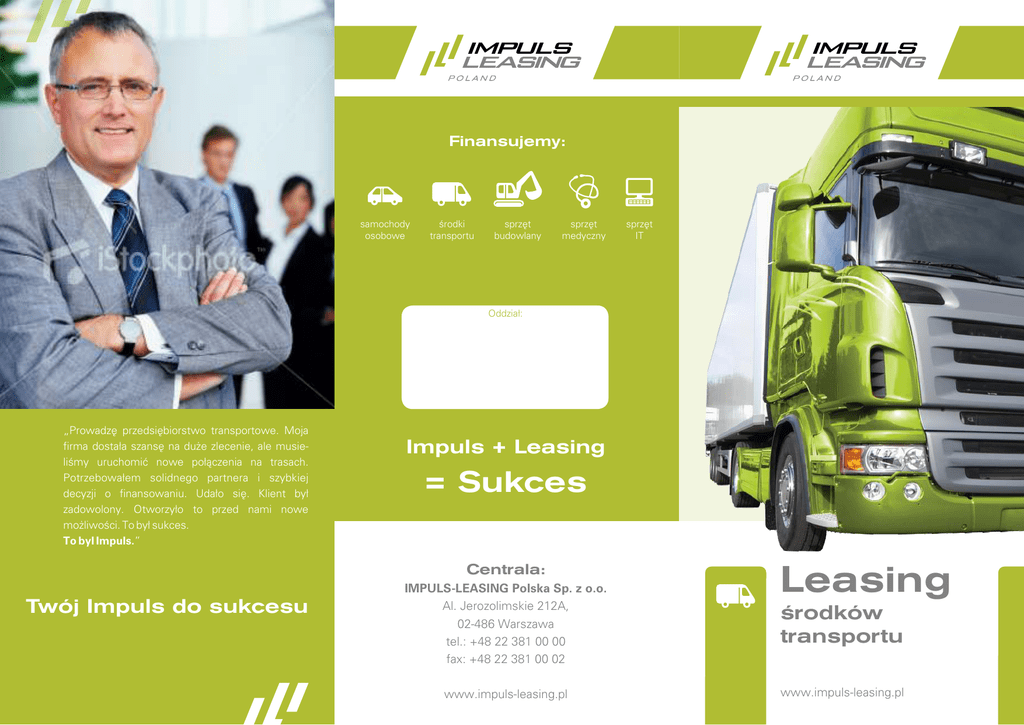 Finansujemy: samochody osobowe œrodki transportu sprzêt budowlany sprzêt medyczny sprzêt IT Oddzia³: „Prowadzê przedsiêbiorstwo transportowe. Moja firma dosta³a szansê na du¿e zlecenie, ale musieliœmy uruchomiæ nowe po³¹czenia na trasach. Potrzebowa³em solidnego partnera i szybkiej decyzji o finansowaniu. Uda³o siê. Klient by³ zadowolony. Otworzy³o to przed nami nowe mo¿liwoœci. To by³ sukces. To byl Impuls.” Impuls + Leasing = Sukces Centrala: Twój Impuls do sukcesu IMPULS-LEASING Polska Sp. z o.o. Al. Jerozolimskie 212A, 02-486 Warszawa tel.: +48 22 381 00 00 fax: +48 22 381 00 02 www.impuls-leasing.pl Leasing œrodków transportu www.impuls-leasing.pl O Nas IMPULS-LEASING Polska Sp. z o.o. wchodzi w sk³ad miêdzynarodowej grupy finansowej IMPULSLEASING International z siedzib¹ w Szwajcarii. Firmy leasingowe wchodz¹ce w sk³ad grupy oprócz Polski s¹ obecne równie¿ w innych krajach Europy Œrodkowo-Wschodniej takich jak S³owacja, Wêgry, Chorwacja, Rumunia. Naszym strategicznym partnerem jest grupa bankowa Raiffeisenlandesbank Oberösterreich (RLBOÖ), z któr¹ wspó³pracujemy w takich dziedzinach jak finansowanie dzia³alnoœci leasingowej, programy vendorowe oraz management know-how . Wiêcej informacji o naszym partnerze mo¿na uzyskaæ na stronie www.rlbooe.at. Nasza oferta Aby Twój biznes siê krêci³, potrzebne Ci s¹ i pojazdy i pieni¹dze. W takim razie u¿ywaj i tych pierwszych i tych drugich, a finansowanie zostaw nam! Zapewniamy przejrzyste zasady finansowania, osobê odpowiedzialn¹ za Twoj¹ sprawê na ka¿dym etapie zawierania i realizacji umowy. Finansujemy: samochody dostawcze i ciê¿arowe, przyczepy i naczepy, pojazdy specjalistyczne, autobusy, ci¹gniki siod³owe. Warunki umowy leasingu: finansowanie nawet do 100% wartoœci transakcji, leasing operacyjny i finansowy, okres umowy do 60 miesiêcy, waluta – PLN, EUR, CHF, raty leasingu – zmienne oparte na rynkowych stopach procentowych (WIBOR, EURIBOR, LIBOR), wartoœæ koñcowa w przypadku leasingu operacyjnego – ustalona w oparciu o przepisy podatkowe, poni¿ej wartoœci rynkowej przedmiotu, ubezpieczenie – oferujemy atrakcyjny pakiet ubezpieczeniowy, zabezpieczenie – w standardzie oparte na wekslu in blanco. Twoje Korzyœci W przypadku leasingu operacyjnego, Korzystaj¹cy do kosztów uzyskania przychodów zaliczy: wstêpn¹ op³atê leasingow¹, raty leasingowe, wydatki zwi¹zane z eksploatacj¹ pojazdu, koszty ubezpieczenia*, VAT – podatnik mo¿e odliczyæ 60% kwoty podatku od raty leasingowej lub innych p³atnoœci wynikaj¹cych z zawartej umowy, jednak ³¹czna kwota odliczeñ podatku w ca³ym okresie u¿ytkowania jednego samochodu nie mo¿e przekroczyæ kwoty 6000 z³. Decyduj¹c siê na leasing finansowy, Korzystaj¹cy do kosztów uzyskania przychodów zaliczy: czêœæ odsetkow¹ raty leasingowej, wydatki zwi¹zane z eksploatacj¹ pojazdu, koszty ubezpieczenia*, amortyzacjê pojazdu**, VAT*** – podatnik mo¿e odliczyæ 60% kwoty podatku od p³atnoœci wynikaj¹cych z zawartej umowy, jednak ³¹czna kwota odliczeñ podatku w ca³ym okresie u¿ytkowania jednego samochodu nie mo¿e przekroczyæ kwoty 6000 z³. * W przypadku samochodu osobowego do kosztów podatkowych nie zaliczamy tej czêœci sk³adki przypadaj¹cej proporcjonalnie do wartoœci auta przyjêtej na potrzeby ubezpieczenia ponad równowartoœæ 20 tys. euro. **Maksymalna kwota, która podlega amortyzacji, to odpowiednik w z³otych 20 tys. euro przeliczonych po œrednim kursie NBP z dnia przekazania samochodu do u¿ywania. Je¿eli samochód jest dro¿szy to nadwy¿ka nie stanowi kosztu prowadzenia dzia³alnoœci. *** W leasingu finansowym podatek VAT od ca³oœci transakcji jest p³atny z góry za ca³y okres trwania umowy leasingowej.