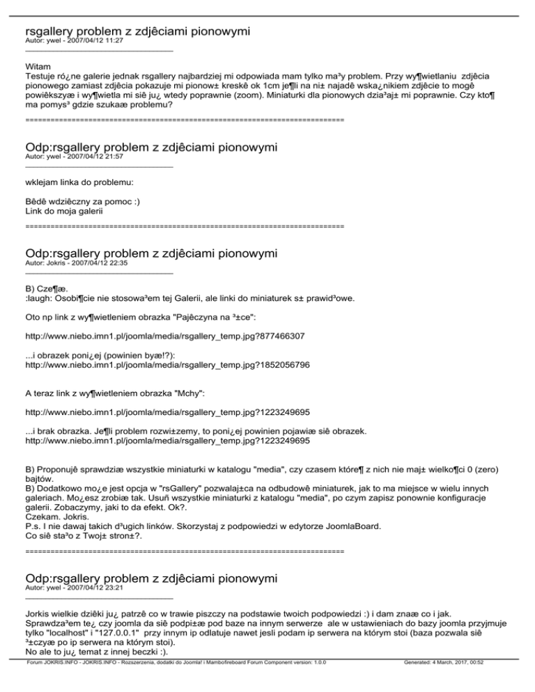 rsgallery problem z zdjêciami pionowymi Autor: ywel - 2007/04/12 11:27 _____________________________________ Witam Testuje ró¿ne galerie jednak rsgallery najbardziej mi odpowiada mam tylko ma³y problem. Przy wy¶wietlaniu zdjêcia pionowego zamiast zdjêcia pokazuje mi pionow± kreskê ok 1cm je¶li na ni± najadê wska¿nikiem zdjêcie to mogê powiêkszyæ i wy¶wietla mi siê ju¿ wtedy poprawnie (zoom). Miniaturki dla pionowych dzia³aj± mi poprawnie. Czy kto¶ ma pomys³ gdzie szukaæ problemu? ============================================================================ Odp:rsgallery problem z zdjêciami pionowymi Autor: ywel - 2007/04/12 21:57 _____________________________________ wklejam linka do problemu: Bêdê wdziêczny za pomoc :) Link do moja galerii ============================================================================ Odp:rsgallery problem z zdjêciami pionowymi Autor: Jokris - 2007/04/12 22:35 _____________________________________ B) Cze¶æ. :laugh: Osobi¶cie nie stosowa³em tej Galerii, ale linki do miniaturek s± prawid³owe. Oto np link z wy¶wietleniem obrazka "Pajêczyna na ³±ce": http://www.niebo.imn1.pl/joomla/media/rsgallery_temp.jpg?877466307 ...i obrazek poni¿ej (powinien byæ!?): http://www.niebo.imn1.pl/joomla/media/rsgallery_temp.jpg?1852056796 A teraz link z wy¶wietleniem obrazka "Mchy": http://www.niebo.imn1.pl/joomla/media/rsgallery_temp.jpg?1223249695 ...i brak obrazka. Je¶li problem rozwi±zemy, to poni¿ej powinien pojawiæ siê obrazek. http://www.niebo.imn1.pl/joomla/media/rsgallery_temp.jpg?1223249695 B) Proponujê sprawdziæ wszystkie miniaturki w katalogu "media", czy czasem które¶ z nich nie maj± wielko¶ci 0 (zero) bajtów. B) Dodatkowo mo¿e jest opcja w "rsGallery" pozwalaj±ca na odbudowê miniaturek, jak to ma miejsce w wielu innych galeriach. Mo¿esz zrobiæ tak. Usuñ wszystkie miniaturki z katalogu "media", po czym zapisz ponownie konfiguracje galerii. Zobaczymy, jaki to da efekt. Ok?. Czekam. Jokris. P.s. I nie dawaj takich d³ugich linków. Skorzystaj z podpowiedzi w edytorze JoomlaBoard. Co siê sta³o z Twoj± stron±?. ============================================================================ Odp:rsgallery problem z zdjêciami pionowymi Autor: ywel - 2007/04/12 23:21 _____________________________________ Jorkis wielkie dziêki ju¿ patrzê co w trawie piszczy na podstawie twoich podpowiedzi :) i dam znaæ co i jak. Sprawdza³em te¿ czy joomla da siê podpi±æ pod baze na innym serwerze ale w ustawieniach do bazy joomla przyjmuje tylko "localhost" i "127.0.0.1" przy innym ip odlatuje nawet jesli podam ip serwera na którym stoi (baza pozwala siê ³±czyæ po ip serwera na którym stoi). No ale to ju¿ temat z innej beczki :). Forum JOKRIS.INFO - JOKRIS.INFO - Rozszerzenia, dodatki do Joomla! i Mambofireboard Forum Component version: 1.0.0 Generated: 4 March, 2017, 00:52 ============================================================================ Odp:rsgallery problem z zdjêciami pionowymi Autor: ywel - 2007/04/13 10:37 _____________________________________ Jokris jeszcze raz bardzo dziêkujê :P . Oczywi¶cie b³±d banalny .... ehhh :whistle: . Co do galerii RsGallery jest to komponent który ³adnie prezentuje zdjêcia (efektownie), galeria bardzo ³atwa w obs³udze i intuicyjna idealna dla osób które chc± stronê ale nie bardzo znaja siê na obs³udze komputera. Jedyny minus RsGalley to, ¿e tworzy a¿ 3 kopie zdjêcia (w ró¿nych wielko¶ciach) dla osób które maja konta o niskiej pojemno¶ci a ch± mieæ duuu¿e galerie jest to rzecz do rozwa¿enia. ============================================================================ Odp:rsgallery problem z zdjêciami pionowymi Autor: arven - 2007/04/23 13:40 _____________________________________ Witam Zaistalowa³em t± galeriê równie¿ w swoim serwisie. Chcia³bym natomiast ustawiæ na stronie g³ównej wy¶witlanie zdjêæ z galerii (chyba losowych) podobnie jak w tym serwisie: http://www.mosir.sandomierz.pilicka.pl/ - z prawej strony na górze w menu NASZE OBIEKTY Proszê o wskazówki jak to zrobiæ? ============================================================================ Odp:rsgallery problem z zdjêciami pionowymi Autor: Jokris - 2007/04/23 14:41 _____________________________________ B) Cze¶æ arven.:laugh: B) Po pierwsze, to dziêki za super wpis do Ksiêgi Go¶ci, za co nale¿y Ci siê szacunek i respekt!. B) Co do tego linka, to chyba go¶ciowi stronê shakowali, albo sam popsu³, bo brakuje mu na serwerze pliku template_css.css. Nie wierzysz?. To kliknij w link powy¿ej. Gdyby go mia³, przegl±darka wy¶wietli³a by jego tre¶æ, tak jak np. mój CSS TUTAJ. :laugh: Co do galerii. Ten modu³, o którym piszesz, to jest modu³ do Zoom Gallery, a nie RsGallery. Musisz poszukaæ taki modu³ do RsGallery... ju¿ nie musisz. Znajdziesz go, w kilku wersjach na forge.joomla.org. Oczywi¶cie, pobierz najnowsz± wersjê modu³u. Co do t³umaczenia, to pewnie tam nie ma, ale mo¿esz sam przet³umaczyæ. B) Narka. Jokris. P.s. Trochê dziwne, bo mój Snap Shots widzi ten jego plik CSS, ale on widzi wszystko. Napisz mi Arven, czy ty mo¿esz czytaæ jego plik CSS. Ok?. Mo¿e ma z³e chmody, albo katalog zabezpieczony. Ps.Ps. Juz wiem. ¯le wpisa³em adres do jego pliku CSS. Powinien byæ http://www.mosir.sandomierz.pilicka.pl/templates/joomlafiles_blue_v2/css/template_css.css a nie: http://mosir.sandomierz.pilicka.pl/templates/joomlafiles_blue_v2/css/template_css.css Taki adres ma wpisany w podgl±dzie "index.php", wiêc prawdopodobnie ma z³± ¶ciê¿kê $mosConfig_live_site w "configuration.php". Ale to ju¿ jego problem. ============================================================================ Odp:rsgallery problem z zdjêciami pionowymi Autor: arven - 2007/04/23 16:27 _____________________________________ Aha. Dziêki za odpowied¼. Zaraz poeksperymentujê :) ============================================================================ Odp:rsgalle