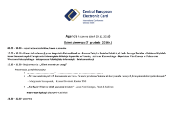 Agenda (stan na dzień 25.11.2016) Dzień pierwszy (7 grudnia 2016r.) 09.00 – 10.00 – rejestracja uczestników, kawa o poranku 10.00 – 10.10 - Otwarcie konferencji przez Krzysztofa Pietraszkiewicza - Prezesa Związku Banków Polskich, dr hab. Jerzego Boehlke - Dziekana Wydziału Nauk Ekonomicznych i Zarządzania Uniwersytetu Mikołaja Kopernika w Toruniu, Adriana Kurowskiego - Dyrektora Visa Europe w Polsce oraz Wiesława Paluszyńskiego - Wiceprezesa Polskiej Izby Informatyki i Telekomunikacji 10.10 – 11.30 - Sesja otwarcia : „Klient w centrum uwagi” Prezentacje, panel dyskusyjny: • „………………………….” - ……………………, ……………………….. • „Bez zrozumienia potrzeb konsumenta ani rusz. Co może przekonać klienta do korzystania z nowych form płatności bezgotówkowych? – Małgorzata Szczepanek, Konrad Siwiński, Kantar TNS • „FinTech: What we think you need to know” - Jean-Noel Georges, Frost & Sullivan moderator dyskusji: Sławomir Cieśliński 11.30 – 12.00 - przerwa 12.00- 13.30 - sesje specjalistyczne sala “Irys” sala “Róża” sala „Lilia” Sesja specjalistyczna: „Klient w centrum uwagi”, cz.I Sesja specjalistyczna: mobilne”, cz.I „Moralność finansowa Polaków. Potrzeba edukacji” – dr Krzysztof Grabowski, Konferencja Przedsiębiorstw Finansowych “Tablets and smartphones, the emerging payment terminals?” – Eric de Putter, Payment Redesign „…………..” – Tomasz Wejcman, Verifone „Na strunach emocji - trendy i rzeczywistość Customer Experience w branży finansowej w CEE” – Bartosz Wrzosek, Develor Polska „Płatności Sesja specjalistyczna: „ Program Paperless/Cashless w Polsce” cz.I “Outsourcing – playground for professionals” – Peter Smid, Roman Dzavoronok, Danube Pay „Visa Digital Solutions” – Maciej Maciejewski, Visa „Zwiększenie obrotu bezgotówkowego - od PROB do Paperless/Cashless Poland” Adam Tochmański, Narodowy Bank Polski „…………..” - ………………., ……… „…………..” - …………….., ………… sala „Frezja” Sesja specjalistyczna: „Rozwiązania samoobsługowe dla potrzeb rynku kartowego” „Bankomaty w Polsce podsumowanie minionego roku” – Marek Firkowicz „Rynek Wpłatomatów w Polsce i na świecie. Perspektywy rozwoju. Możliwości powstania krajowego systemu” – Krzysztof Trojak, BSS Poland Dyskusja z udziałem w/w prelegentów oraz zaproszonych gości. 13.30 – 14.30 – obiad 14.30 – 16.00 – sesje specjalistyczne sala “Irys” Sesja specjalistyczna: „Klient w centrum uwagi”, cz.II sala “Róża” Sesja specjalistyczna: „Płatności mobilne”, cz.II „Jak technologie mobilne zmieniają „Świat mobilnych aplikacji tradycyjne sektory usług” – Mateusz finansowych” – Albert Hupa, IRCenter Litewski, Uber Polska „Multifunkcyjne portfele cyfrowe case UBS, Raiffeisen, BGŻ BNP i innych banków współpracujących z sala „Lilia” Sesja specjalistyczna: „Program Paperless/Cashless w Polsce”, cz.II „Rola instytucji niekomercyjnych w rozwoju polskiego rynku płatności bezgotówkowych” – Robert Łaniewski, Fundacja Rozwoju Obrotu Bezgotówkowego „…………..” - …………….., sala „Frezja” Sesja specjalistyczna: „Nowe zagrożenia bezpieczeństwa transakcji” „Mobile, FinTech i RetailTech zmniejszają ryzyko transakcji” – Cezary Kosiński, Swan Payments „Segmentacja w instytucjach finansowych – czy tylko dochód i wiek mają znaczenie ?” – Wojciech Frabiński, Eurobank uPaid” – Krzysztof Drzyzga, uPaid Dyskusja z udziałem w/w prelegentów oraz zaproszonych gości. ………… Dyskusja z udziałem w/w prelegentów oraz zaproszonych gości. „Czego oczekują Akceptanci ? Potrzeby Merchantów a oferta instytucji płatniczych” – Anna Maj, Creativelink „Europejskie ramy certyfikacji bezpieczeństwa produktów teleinformatycznych” – dr inż. Elżbieta Andrukiewicz, ekspert Komitetu Technicznego nr 182 przy Polskim Komitecie Normalizacyjnym Dyskusja z udziałem w/w prelegentów oraz zaproszonych gości. Dyskusja o „user experience” z udziałem w/w prelegentów oraz zaproszonych gości. 16.00 – 16.15 – przerwa 16.15 – 17.15 sesje specjalistyczne sala “Irys” przygotowania do Polskiej Kartowej Gali sala “Róża” Sesja specjalistyczna: „Płatności mobilne”, cz.III “Certification in Mobile payment sector including OEM-Pay, HCE & BLE technology” - Nigel Reavley, Jean-Philippe Wolyniec, FIME Mobilne usługi i płatności - równy dostęp i wygoda konsumenta"Mateusz Walewski, PwC Polska Dyskusja z udziałem w/w prelegentów oraz zaproszonych gości. sala „Lilia” sala „Frezja” Sesja specjalistyczna „FinTech – Sesja specjalistyczna: „Socialpartner czy przeciwnik?” media a nowy kontekst funkcjonowania systemów Dyskusja z udziałem zaproszonych płatności” gości: Anna Maj - Creativlink, „Drogi Facebooku, znów problem Cezary Kosiński – Swan Payments z płatnością!”. Skomplikowane i proste, czyli obsługa klienta finansowego w mediach społecznościowych ” – Magdalena Tokaj, Instytut Monitorowania Mediów Dyskusja z udziałem w/w prelegentów oraz zaproszonych gości. 17.15 – 17.30 – przerwa 17.30 – 18.30 – sesje specjalistyczne sala “Irys” przygotowania do Polskiej Kartowej Gali sala “Róża” sala „Lilia” Sesja specjalistyczna: „Płatności mobilne”, cz.IV Sesja specjalistyczna: „Polska karta płatnicza” “Czy „wearables” mogą stać się popularne na rynku płatności mobilnych i innych usług dodanych?” – Krzysztof Fidura, Cardtek „…………..” - …………….., ………… Dyskusja z udziałem w/w prelegentów oraz zaproszonych gości. Dyskusja z udziałem w/w prelegentów oraz zaproszonych gości. sala„Frezja” Sesja specjalistyczna: Nowoczesne płatności i e-administracja dla osób niepełnosprawnych” „