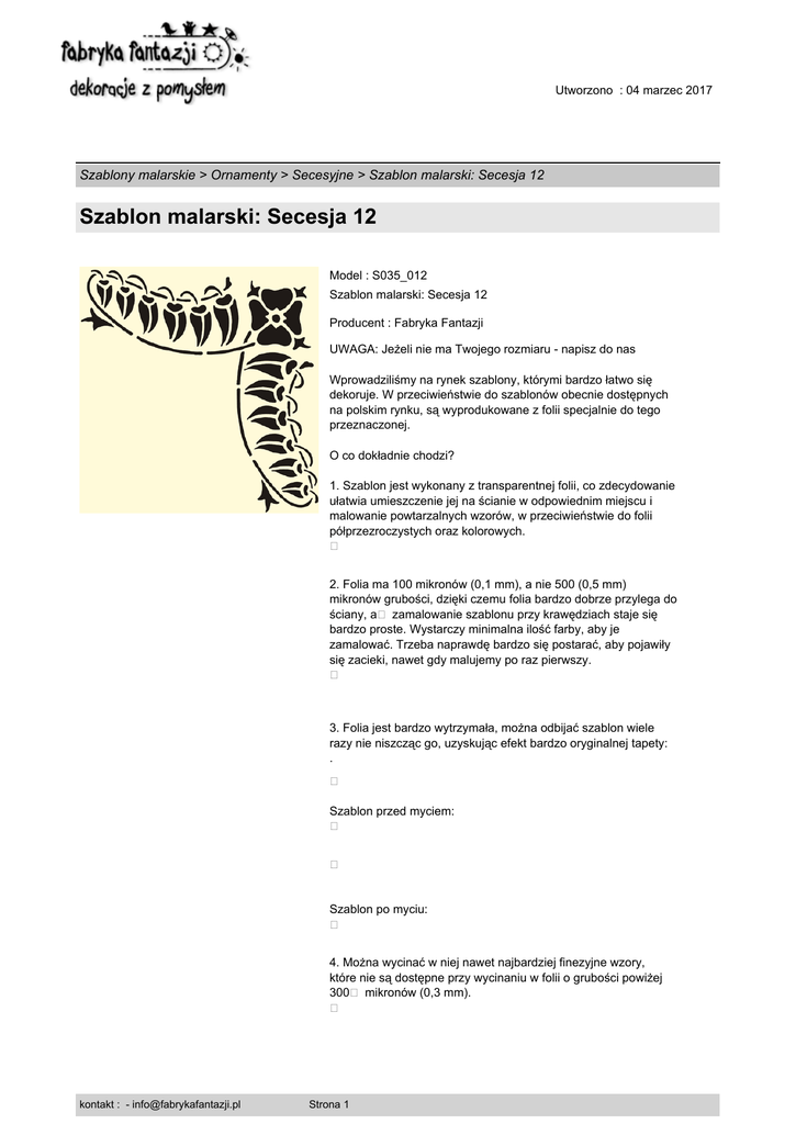 Utworzono : 04 marzec 2017 Szablony malarskie > Ornamenty > Secesyjne > Szablon malarski: Secesja 12 Szablon malarski: Secesja 12 Model : S035_012 Szablon malarski: Secesja 12 Producent : Fabryka Fantazji UWAGA: Jeżeli nie ma Twojego rozmiaru - napisz do nas Wprowadziliśmy na rynek szablony, którymi bardzo łatwo się dekoruje. W przeciwieństwie do szablonów obecnie dostępnych na polskim rynku, są wyprodukowane z folii specjalnie do tego przeznaczonej. O co dokładnie chodzi? 1. Szablon jest wykonany z transparentnej folii, co zdecydowanie ułatwia umieszczenie jej na ścianie w odpowiednim miejscu i malowanie powtarzalnych wzorów, w przeciwieństwie do folii półprzezroczystych oraz kolorowych. � 2. Folia ma 100 mikronów (0,1 mm), a nie 500 (0,5 mm) mikronów grubości, dzięki czemu folia bardzo dobrze przylega do ściany, a� zamalowanie szablonu przy krawędziach staje się bardzo proste. Wystarczy minimalna ilość farby, aby je zamalować. Trzeba naprawdę bardzo się postarać, aby pojawiły się zacieki, nawet gdy malujemy po raz pierwszy. � 3. Folia jest bardzo wytrzymała, można odbijać szablon wiele razy nie niszcząc go, uzyskując efekt bardzo oryginalnej tapety: . � Szablon przed myciem: � � Szablon po myciu: � 4. Można wycinać w niej nawet najbardziej finezyjne wzory, które nie są dostępne przy wycinaniu w folii o grubości powiżej 300� mikronów (0,3 mm). � kontakt : - [email protected] Strona 1 Utworzono : 04 marzec 2017 Szablony malarskie > Ornamenty > Secesyjne > Szablon malarski: Secesja 12 Szablon malarski: Secesja 12 5. Folia nie zapamiętuje kształtu opakowania w którym jest wysyłana, a później przechowywana, dzięki czemu szablon idealnie przylega do ściany i żadne jego elementy nie odstają. 6. Folia, jest bardzo lekka, dlatego łatwo sie maluje, gdyż nie musisz jej trzymać, nawet malując sufit.� Do mocowania folii na ścianie służy specjalny klej w spray'u (który nie zostawia żadnych śladów). Po skończonym malowaniu wystarczy delikatnie zdjąć szablon ze ściany i gotowe! Szablony wykonane z grubej folii są ciężkie i nie utrzymają się na kleju. Wraz z szablonem dodatkowo otrzymasz dokładną instrukcję malowania do danego wzoru oraz jego przykładowe wersje kolorystyczne. Dodatkowo na naszej stronie znajdziesz obszerne poradniki, które poprawadzą Cię za rękę i krok po kroku dowiesz się, co trzeba zrobić, aby Twój malowany projekt był udany. Szukaj pod hasłami: � "Jak malować?"������� oraz������� "Malowane Projekty" A co jeżeli mam pomysł na własny szablon? - Jest możliwe wykonanie szablonu na podstawie Twojego pomysłu.� A resztę pozostaw nam ;) Wykonujemy szablony na zamówienie dla artystów, dekoratorów wnętrz, architektów. Tu czytaj o wizualizacjach i wzorach dopasowanych do Ciebie. W celu przyklejenia szablonu do ściany, należy użyć proponowanego przez nas kleju do repozycjonowania, sprawdzonego przez artystów i plastyków. Dzięki niemu, każdy najdrobniejszy element szablonu zostanie dokładnie przytwierdzony, a ryzyko podcieknięcia farby nie wystąpi. Kupując szablon firmy Fabryka Fantazji masz 100% gwarancję jakości sprzedawanych szablonów, farb, pędzli i wszystkich innych akcesoriów. Jeżeli masz zastrzeżenia do naszych produktów, pamiętaj, że masz prawo do zwrotu w ciągu 10 dni od dostarczenia produktu do Ciebie. Nic nie ryzykujesz. � kontakt : - [email protected] Strona 2 Utworzono : 04 marzec 2017 Szablony malarskie > Ornamenty > Secesyjne > Szablon malarski: Secesja 12 Szablon malarski: Secesja 12 Cena : 32,26 zł Brutto ( 26,23 zł Netto) Dostępne opcje Szablon malarski: Secesja 12 : Rozmiar szablonu 38 x 38 cm. Dostępność: Produkt dostępny w naszym sklepie od 08 luty 2009 kontakt : - [email protected] Strona 3