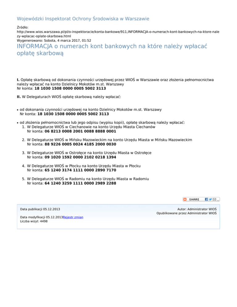 Wojewódzki Inspektorat Ochrony Środowiska w Warszawie Źródło: http://www.wios.warszawa.pl/pl/o-inspektoracie/konta-bankowe/911,INFORMACJA-o-numerach-kont-bankowych-na-ktore-nale zy-wplacac-oplate-skarbowa.html Wygenerowano: Sobota, 4 marca 2017, 01:52 INFORMACJA o numerach kont bankowych na które należy wpłacać opłatę skarbową I. Opłatę skarbową od dokonania czynności urzędowej przez WIOŚ w Warszawie oraz złożenia pełnomocnictwa należy wpłacać na konto Dzielnicy Mokotów m.st. Warszawy Nr konta: 18 1030 1508 0000 0005 5002 3113 II. W Delegaturach WIOŚ opłatę skarbową należy wpłacać: ● ● od dokonania czynności urzędowej na konto Dzielnicy Mokotów m.st. Warszawy Nr konta: 18 1030 1508 0000 0005 5002 3113 od złożenia pełnomocnictwa lub jego odpisu (wypisu kopii), opłatę skarbową należy wpłacać: 1. W Delegaturze WIOŚ w Ciechanowie na konto Urzędu Miasta Ciechanów Nr konta: 06 8213 0008 2001 0088 8888 0001 2. W Delegaturze WIOŚ w Mińsku Mazowieckim na konto Urzędu Miasta w Mińsku Mazowieckim Nr konta: 88 9226 0005 0024 4185 2000 0030 3. W Delegaturze WIOŚ w Ostrołęce na konto Urzędu Miasta w Ostrołęce Nr konta: 09 1020 1592 0000 2102 0218 1394 4. W Delegaturze WIOŚ w Płocku na konto Urzędu Miasta w Płocku Nr konta: 65 1240 3174 1111 0000 2890 7170 5. W Delegaturze WIOŚ w Radomiu na konto Urzędu Miasta w Radomiu Nr konta: 64 1240 3259 1111 0000 2989 2288 Data publikacji 05.12.2013 Data modyfikacji 05.12.2013Rejestr zmian Liczba wizyt: 4498 Autor: Administrator WIOŚ Opublikowane przez Administrator WIOŚ
