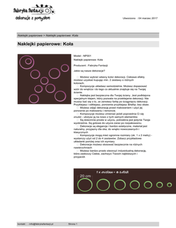 Utworzono : 04 marzec 2017 Naklejki papierowe > Naklejki papierowe: Koła Naklejki papierowe: Koła Model : NP001 Naklejki papierowe: Koła Producent : Fabryka Fantazji Jakie są nasze dekoracje? � Możesz wybrać własny kolor dekoracji. Ciekawe efekty możesz uzyskać kupując min. 2 zestawy o różnych kolorach, � Kompozycje układasz samodzielnie. Możesz dopasować wzór do wnętrza i do tego co aktualnie znajduje się na Twojej ścianie. � Naklejka jest bezpieczna dla Twojej ściany. Jest podklejona specjalnym klejem, który pozwala na przeklejanie dekoracji. Nie musisz bać się o to, ze zerwiesz farbę po ściągnięciu dekoracji. Przyklejasz i odklejasz, ponownie przyklejasz … bez obaw. � Możesz zdjąć dekorację przed malowaniem i użyć jej ponownie po malowaniu i remoncie. � Kompozycje możesz zmieniać jeżeli poprzednia Ci się znudzi - ułożysz ją na nowo z tych samych elementów. � Są dziecinnie proste w użyciu, potrzebna jest jedynie Twoja wyobraźnia. Są gotowe do użycia zaraz po rozpakowaniu. � Dekoracje są elegancje i bardzo estetyczne, materiał jest naturalny, przyjazny dla oka, do wnętrz nowoczesnych i klasycznych � Kompozycje mogą mieć ogromne rozmiary (ok. 1 x 2 metry) wystarczy użyć od 2 do 4 zestawów. Zobacz przykładowe układanki poniżej oraz ich wymiary � Dekoracje możesz stosować bezpiecznie na różnych nawierzchniach � Możesz bardzo prosto stworzyć indywidualną dekorację, która zaskoczy Ciebie, zachwyci Twoich najbliższych i przyjaciół. kontakt : - [email protected] Strona 1 Utworzono : 04 marzec 2017 Naklejki papierowe > Naklejki papierowe: Koła Naklejki papierowe: Koła kontakt : - [email protected] Strona 2 Utworzono : 04 marzec 2017 Naklejki papierowe > Naklejki papierowe: Koła Naklejki papierowe: Koła kontakt : - [email protected] Strona 3 Utworzono : 04 marzec 2017 Naklejki papierowe > Naklejki papierowe: Koła Naklejki papierowe: Koła kontakt : - [email protected] Strona 4 Utworzono : 04 marzec 2017 Naklejki papierowe > Naklejki papierowe: Koła Naklejki papierowe: Koła kontakt : - [email protected] Strona 5 Utworzono : 04 marzec 2017 Naklejki papierowe > Naklejki papierowe: Koła Naklejki papierowe: Koła kontakt : - [email protected] Strona 6 Utworzono : 04 marzec 2017 Naklejki papierowe > Naklejki papierowe: Koła Naklejki papierowe: Koła � � Cena : 29,24 zł Brutto ( 23,77 zł Netto) Dostępne opcje Naklejki papierowe: Koła : Kolor Acqua Marina, Adriatico, Arancio, Bianco, Biliardo, Caffe, Crema, Indigo, Nebia, Caffe, Nero, Oro, Pistacchio, Terra di Siena, Verduzzo, Vesuvio, Viola. Dostępność: Produkt dostępny w naszym sklepie od 11 listopad 2009 kontakt : - [email protected] Strona 7