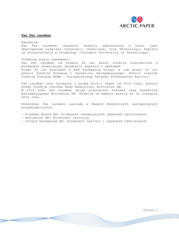 Pan Per Lundeen Edukacja: Pan Per Lundeen, obywatel Szwecji zamieszkały w Lund, jest absolwentem wydziału Inżynierii Chemicznej oraz Technologii Papieru na Uniwersytecie w Goteborgu (Chalmers University of Technology). Przebieg pracy zawodowej: Pan Per Lundeen od prawie 40 lat pełni funkcje kierownicze w przemyśle chemicznym, produkcji papieru i opakowań. Przez 20 lat pracował w A&R Packaging Group, w tym przez 12 lat pełnił funkcję Prezesa i Dyrektora Zarządzającego. Pełnił również funkcję Prezesa ECMA – Europejskiego Związku Producentów Kartonu. Pan Lundeen jest związany z grupą Arctic Paper od 2013 roku, pełnił wtedy funkcję członka Rady Nadzorczej Rottneros AB. W 2014 roku Pan Lundeen objął stanowisko Prezesa oraz Dyrektora Zarządzającego Rottneros AB. Funkcje te będzie pełnił do 31 sierpnia 2016 roku. Dodatkowo Pan Lundeen zasiada w Radach Nadzorczych następujących przedsiębiorstw: - Fiskeby Board AB: Producent odnawialnych opakowań kartonowych. - Rottneros AB: Producent celulozy. - Strand Packaging AB: Producent kartonu i opakowań tekturowych. Strona 1