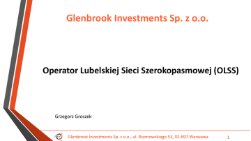 Glenbrook Investments Sp. z o.o. Operator Lubelskiej Sieci Szerokopasmowej (OLSS) Grzegorz Groszek Glenbrook Investments Sp. z o.o., ul. Rzymowskiego 53, 02-697 Warszawa 1 SIEĆ SZEROKOPASMOWA - NAJWAŻNIEJSZE INFORMACJE Województwo Lubelskie: 2908 km sieci 14 węzłów szkieletowych 298 węzłów dystrybucyjnych Glenbrook Investments Sp. z o.o., ul. Rzymowskiego 53, 02-697 Warszawa 2 CENTRUM ZARZĄDZANIA SIECIĄ (24/7/365) • • • • • monitorowanie infrastruktury pasywnej monitorowanie urządzeń aktywnych monitorowanie ruchu w sieci monitorowanie węzłów wymiany ruchu wsparcie telefoniczne dla klientów Glenbrook Investments Sp. z o.o., ul. Rzymowskiego 53, 02-697 Warszawa 3 CENTRUM ZARZĄDZANIA SIECIĄ (24/7/365) Monitoring szaf i kontenerów: • • • warunki środowiskowe: temperatura, wilgotność monitoring wizyjny wnętrz kontenerów nieautoryzowane otwarcie szaf i kontenerów Glenbrook Investments Sp. z o.o., ul. Rzymowskiego 53, 02-697 Warszawa 4 STRUKTURA ORGANIZACYJNA GLENBROOK INVESTMENTS SP. Z O.O. Zarząd Spółki [ZS] Prezes Zarządu Jerzy Jerkiewicz Doradca/Ekspert Grzegorz Hunicz Asystent Kierownika Projektu - Logistyka Robert Dąbrowski Specjalista ds. Dokumentacji Technicznej – Paszportyzacja Lubelskie/Świętorzyskie Dyrektor ds. Operacyjnych/ Prokurent Jacek Dziekoński Księgowość Taxus – Aneta Mierzwińska Dyrektor Techniczny (DT) CZS Lublin Dariusz Siedlecki Kierownik Działu Handlowego (KDH) Grzegorz Groszek Helpdesk – I linia wsparcia Michał Korulczyk Kierownik ds. klientów kluczowych Aneta WawszczakGuz Administratorzy Sieci - II linia wsparcia Koordynator Piotr Gorycki Inżynier wsparcia sprzedaży (IWS) Koordynator Biura Handlowego (KBH) CZS Lublin Zbigniew Gałecki Przedstawiciele Handlowi (PH) Jarosław Chudy Podwykonawca Projektant, wyceny, projekty budowlane, kolizje sieci Zbigniew Rybicki Zespół techniczny Sekcja Wykonawcza Pracownicy Techniczni Spółki Adam Dziekoński Janusz Kowaluk SDP Sekcja Dokumentacji Projektowej Zastępca Koordynatora Biura Handlowego - Sekcja Administracyjna Patrycja Soroczyńska SSU - Sekcja Sprzedaży Usług SZS - Sekcja Zarządzania Siecią Glenbrook Investments Sp. z o.o., ul. Rzymowskiego 53, 02-697 Warszawa 5 AKTYWNOŚĆ OPERATORA W SIECI WOJ. LUBELSKIEGO W zespole sprzedażowym zatrudniony jest kolejny specjalista ds. obsługi operatorów oraz sprzedaży do relacji z sektorem public Glenbrook Investments Sp. z o.o., ul. Rzymowskiego 53, 02-697 Warszawa 6 AKTYWNOŚĆ OPERATORA W SIECI WOJ. LUBELSKIEGO 58% Zawarto: 39 - umów ramowych 67 - umów szczegółowych 19% 13% Kolokacja Transmisja Danych Eternet Dostęp do sieci Internet 6% 4% Dierżawa Kanalizacji Kablowej Dzierżawa Ciemnego Włókna Glenbrook Investments Sp. z o.o., ul. Rzymowskiego 53, 02-697 Warszawa 7 AKTYWNOŚĆ OPERATORA W SIECI WOJ. LUBELSKIEGO • Styk dwóch sieci • Jednolita technologia – pełna przenośność usług • Dwa cenniki – dwa rodzaje umów • Zgoda właścicieli sieci na sprzedaż transmisji interwojewódzkiej Glenbrook Investments Sp. z o.o., ul. Rzymowskiego 53, 02-697 Warszawa 8 DALSZE DZIAŁANIA Glenbrook – zainicjował cykliczne spotkania operatorów RSS: • Różne modele • Różne decyzje notyfikacyjne • Jednolite stanowisko w sprawie podatków, kosztów funkcjonowania oraz wsparcia operatorów Glenbrook Investments Sp. z o.o., ul. Rzymowskiego 53, 02-697 Warszawa 9 DALSZE DZIAŁANIA Glenbrook rekomenduje: • Ujednolicenie cenników • Interkonekty wojewódzkie • Wykorzystanie dostępu do węzłów (operatorów) krajowych i zagranicznych • Dostęp do kontentu • Wspólne stanowisko w relacjach z MC oraz UKE Glenbrook Investments Sp. z o.o., ul. Rzymowskiego 53, 02-697 Warszawa 10 ZAPRASZAMY DO WSPÓŁPRACY Glenbrook Investments Sp. z o.o. ul. Dobrzańskiego 3 20-262 Lublin tel.: 81 470 72 73 e-mail: [email protected] www.olss.pl Glenbrook Investments Sp. z o.o., ul. Rzymowskiego 53, 02-697 Warszawa 11 Dziękuję za uwagę Grzegorz Groszek Glenbrook Investments Sp. z o.o., ul. Rzymowskiego 53, 02-697 Warszawa 12