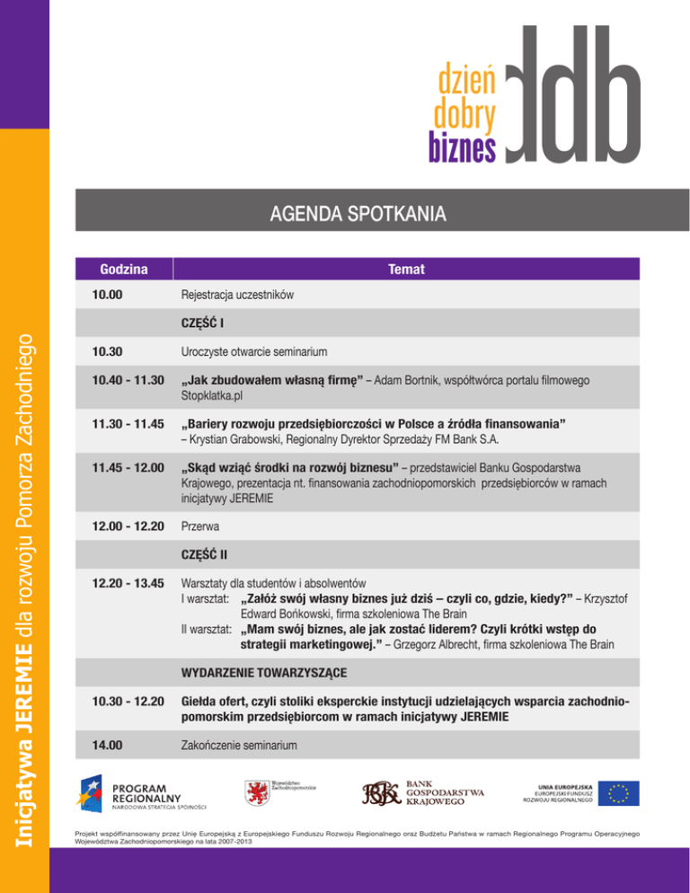 Agenda spotkania Godzina 10.00 Temat Rejestracja uczestników Inicjatywa JEREMIE dla rozwoju Pomorza Zachodniego CZĘŚĆ I 10.30 Uroczyste otwarcie seminarium 10.40 - 11.30 „Jak zbudowałem własną firmę” – Adam Bortnik, współtwórca portalu filmowego Stopklatka.pl 11.30 - 11.45 „Bariery rozwoju przedsiębiorczości w Polsce a źródła finansowania” – Krystian Grabowski, Regionalny Dyrektor Sprzedaży FM Bank S.A. 11.45 - 12.00 „Skąd wziąć środki na rozwój biznesu” – przedstawiciel Banku Gospodarstwa Krajowego, prezentacja nt. finansowania zachodniopomorskich przedsiębiorców w ramach inicjatywy JEREMIE 12.00 - 12.20 Przerwa CZĘŚĆ II 12.20 - 13.45 Warsztaty dla studentów i absolwentów I warsztat: „ Załóż swój własny biznes już dziś – czyli co, gdzie, kiedy?” – Krzysztof Edward Bońkowski, firma szkoleniowa The Brain II warsztat: „ Mam swój biznes, ale jak zostać liderem? Czyli krótki wstęp do strategii marketingowej.” – Grzegorz Albrecht, firma szkoleniowa The Brain WYDARZENIE TOWARZYSZĄCE 10.30 - 12.20 Giełda ofert, czyli stoliki eksperckie instytucji udzielających wsparcia zachodniopomorskim przedsiębiorcom w ramach inicjatywy JEREMIE 14.00 Zakończenie seminarium Projekt współfinansowany przez Unię Europejską z Europejskiego Funduszu Rozwoju Regionalnego oraz Budżetu Państwa w ramach Regionalnego Programu Operacyjnego Województwa Zachodniopomorskiego na lata 2007-2013