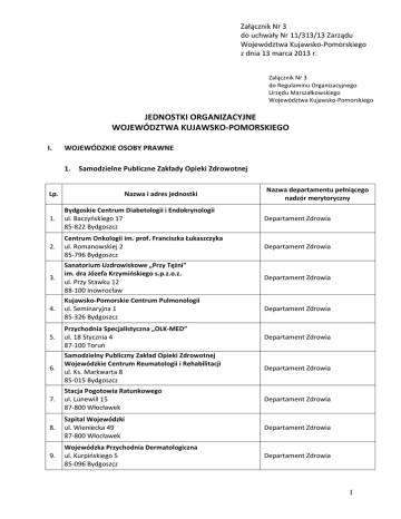 Załącznik Nr 3 do uchwały Nr 11/313/13 Zarządu Województwa Kujawsko-Pomorskiego z dnia 13 marca 2013 r. Załącznik Nr 3 do Regulaminu Organizacyjnego Urzędu Marszałkowskiego Województwa Kujawsko-Pomorskiego JEDNOSTKI ORGANIZACYJNE WOJEWÓDZTWA KUJAWSKO-POMORSKIEGO I. WOJEWÓDZKIE OSOBY PRAWNE 1. Lp. 1. 2. 3. 4. 5. 6. Samodzielne Publiczne Zakłady Opieki Zdrowotnej Nazwa i adres jednostki Bydgoskie Centrum Diabetologii i Endokrynologii ul. Baczyńskiego 17 85-822 Bydgoszcz Centrum Onkologii im. prof. Franciszka Łukaszczyka ul. Romanowskiej 2 85-796 Bydgoszcz Sanatorium Uzdrowiskowe „Przy Tężni” im. dra Józefa Krzymińskiego s.p.z.o.z. ul. Przy Stawku 12 88-100 Inowrocław Kujawsko-Pomorskie Centrum Pulmonologii ul. Seminaryjna 1 85-326 Bydgoszcz Przychodnia Specjalistyczna „OLK-MED” ul. 18 Stycznia 4 87-100 Toruń Samodzielny Publiczny Zakład Opieki Zdrowotnej Wojewódzkie Centrum Reumatologii i Rehabilitacji ul. Ks. Markwarta 8 85-015 Bydgoszcz Nazwa departamentu pełniącego nadzór merytoryczny Departament Zdrowia Departament Zdrowia Departament Zdrowia Departament Zdrowia Departament Zdrowia Departament Zdrowia 7. Stacja Pogotowia Ratunkowego ul. Lunewill 15 87-800 Włocławek Departament Zdrowia 8. Szpital Wojewódzki ul. Wieniecka 49 87-800 Włocławek Departament Zdrowia 9. Wojewódzka Przychodnia Dermatologiczna ul. Kurpińskiego 5 85-096 Bydgoszcz Departament Zdrowia 1 Wojewódzka Przychodnia Sportowo-Lekarska 10. ul. Rejtana 1 85-032 Bydgoszcz Departament Zdrowia Wojewódzka Przychodnia Stomatologiczna 11. ul. Zapolskiej 18 85-149 Bydgoszcz Departament Zdrowia Wojewódzka Przychodnia Zdrowia Psychicznego 12. ul. Sułkowskiego 58a 85-634 Bydgoszcz Departament Zdrowia Wojewódzka Stacja Pogotowia Ratunkowego 13. ul. Produkcyjna 13 85-790 Bydgoszcz Departament Zdrowia Wojewódzki Ośrodek Medycyny Pracy 14. ul. Karłowicza 26 85-092 Bydgoszcz Departament Zdrowia Wojewódzki Ośrodek Medycyny Pracy 15. ul. M. Skłodowskiej-Curie 61-67 87-100 Toruń Departament Zdrowia Wojewódzki Ośrodek Medycyny Pracy 16. ul. Prymasa Wyszyńskiego 21 87-800 Włocławek Departament Zdrowia Wojewódzki Ośrodek Terapii Uzależnień i Współuzależnienia 17. ul. Szosa Bydgoska 1 87-100 Toruń Wojewódzki Szpital dla Nerwowo i Psychicznie Chorych im. dra Józefa Bednarza 18. ul. Sądowa 18 86-100 Świecie Wojewódzki Szpital Dziecięcy im. J. Brudzińskiego 19. ul. Chodkiewicza 44 85-667 Bydgoszcz Departament Zdrowia Departament Zdrowia Departament Zdrowia Wojewódzki Szpital Obserwacyjno-Zakaźny im. T. Browicza 20. ul. Św. Floriana 12 85-030 Bydgoszcz Departament Zdrowia Wojewódzki Szpital Zespolony im. L. Rydygiera 21. ul. Św. Józefa 53/59 87-100 Toruń Departament Zdrowia 2 2. Lp. 1. 2. 3. 4. 5. 6. 7. 8. 9. 10. 11. 12. 13. 14. Samorządowe Instytucje Kultury Nazwa i adres jednostki Filharmonia Pomorska im. Ignacego Jana Paderewskiego ul. Andrzeja Szwalbego 6 85-080 Bydgoszcz Galeria i Ośrodek Plastycznej Twórczości Dziecka Rynek Nowomiejski 17 87-100 Toruń Galeria Sztuki „Wozownia” ul. Rabiańska 20 87-100 Toruń Muzeum Archeologiczne Biskupin 17 88-410 Gąsawa Muzeum Etnograficzne im. prof. Marii Znamierowskiej-Prüfferowej Wały gen. Sikorskiego 19 87-100 Toruń Muzeum Ziemi Kujawskiej i Dobrzyńskiej ul. Słowackiego 1a 87-800 Włocławek Opera „NOVA” ul. Marszałka Focha 5 85-070 Bydgoszcz Ośrodek Chopinowski Szafarnia 87-404 Radomin Pałac Lubostroń w Lubostroniu 89-210 Łabiszyn Teatr im. Wilama Horzycy Plac Teatralny 1 87-100 Toruń Wojewódzka Biblioteka Publiczna i Książnica Kopernikańska ul. Słowackiego 8 87-100 Toruń Wojewódzka i Miejska Biblioteka Publiczna im. dr Witolda Bełzy ul. Długa 39 85-034 Bydgoszcz Wojewódzki Ośrodek Animacji Kultury ul. Szpitalna 8 87-100 Toruń Wojewódzki Ośrodek Kultury i Sztuki „Stara Ochronka” Plac Kościeleckich 6 85-033 Bydgoszcz Nazwa departamentu pełniącego nadzór merytoryczny Departament Kultury i Dziedzictwa Narodowego Departament Kultury i Dziedzictwa Narodowego Departament Kultury i Dziedzictwa Narodowego Departament Kultury i Dziedzictwa Narodowego Departament Kultury i Dziedzictwa Narodowego Departament Kultury i Dziedzictwa Narodowego Departament Kultury i Dziedzictwa Narodowego Departament Kultury i Dziedzictwa Narodowego Departament Kultury i Dziedzictwa Narodowego Departament Kultury i Dziedzictwa Narodowego Departament Kultury i Dziedzictwa Narodowego Departament Kultury i Dziedzictwa Narodowego Departament Kultury i Dziedzictwa Narodowego Departament Kultury i Dziedzictwa Narodowego 3 3. Lp. Wojewódzkie Samorządowe Osoby Prawne Nazwa i adres jednostki Nazwa departamentu pełniącego nadzór merytoryczny 1. Wojewódzki Ośrodek Ruchu Drogowego ul. Kardynała Stefana Wyszyńskiego 54 85-620 Bydgoszcz Departament Infrastruktury Drogowej 2. Wojewódzki Ośrodek Ruchu Drogowego ul. Polna 107/111 87-100 Toruń Departament Infrastruktury Drogowej 3. Wojewódzki Ośrodek Ruchu Drogowego ul. Zielna 2/4 87-800 Włocławek Departament Infrastruktury Drogowej 4. Kujawsko-Pomorski Ośrodek Doradztwa Rolniczego Minikowo k. Nakła nad Notecią 89-122 Minikowo Departament Rolnictwa II. WOJEWÓDZKIE SAMORZĄDOWE JEDNOSTKI ORGANIZACYJNE Jednostki Budżetowe Lp. Nazwa i adres jednostki Nazwa departamentu pełniącego nadzór merytoryczny 1. Biblioteka Pedagogiczna im. gen. bryg. prof. Elżbiety Zawackiej ul. Dąbrowskiego 4 87-100 Toruń Departament Edukacji i Sportu 2. Brodnicki Park Krajobrazowy Grzmięca 87-312 Pokrzydowo Departament Środowiska 3. Gostynińsko-Włocławski Park Krajobrazowy ul. Zamkowa 11 87-820 Kowal Departament Środowiska 4. Górznieńsko-Lidzbarski Park Krajobrazowy Czarny Bryńsk 1 87-320 Górzno Departament Środowiska 5. Krajeński Park Krajobrazowy ul. Pocztowa 2 89-410 Więcbork Departament Środowiska 6. Kujawsko-Pomorskie Biuro Planowania Przestrzennego i Regionalnego Bulwary im. Marszałka J. Piłsudskiego 5B 87-800 Włocławek Departament Planowania Regionalnego 