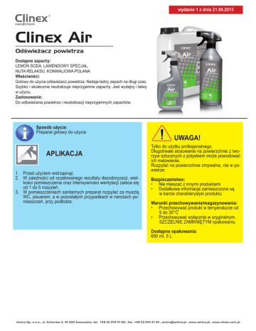 wydanie 1 z dnia 21.06.2013 Clinex Air Odświeżacz powietrza Dostępne zapachy: LEMON SODA, LAWENDOWY SPECJAŁ, NUTA RELAKSU, KONWALIOWA POLANA Właściwości: Gotowy do użycia odświeżacz powietrza. Nadaje ładny zapach na długi czas. Szybko i skutecznie neutralizuje nieprzyjemne zapachy. Jest wydajny i łatwy w użyciu. Zastosowanie: Do odświeżania powietrza i neutralizacji nieprzyjemnych zapachów. Sposób użycia: Preparat gotowy do użycia APLIKACJA 1. Przed użyciem wstrząsnąć. 2. W zależności od oczekiwanego rezultatu dezodoryzacji, wielkości pomieszczenia oraz intensywności wentylacji zaleca się od 1 do 5 rozpyleń. 3. W pomieszczeniach sanitarnych preparat rozpylać za muszlą WC, pisuarem, a w pozostałych przypadkach w narożach pomieszczeń, przy podłodze. UWAGA! Tylko do użytku profesjonalnego. Długotrwałe stosowanie na powierzchnie z tworzyw sztucznych z połyskiem może powodować ich matowienie. Rozpylać na powierzchnie zmywalne, nie w powietrze. Bezpieczeństwo: • Nie mieszać z innymi produktami • Dodatkowe informacje zamieszczone są w karcie charakterystyki produktu Warunki przechowywania/magazynowania: • Przechowywać produkt w temperaturze od 5 do 30°C • Przechowywać wyłącznie w oryginalnym, SZCZELNIE ZAMKNIĘTYM opakowaniu Dostępne opakowania: 650 ml, 5 L Amtra Sp. z o.o., ul. Schonów 3, 41-200 Sosnowiec, tel. +48 32 294 41 00 , fax +48 32 294 41 39 , [email protected] , www.amtra.pl , www.clinex.com.pl