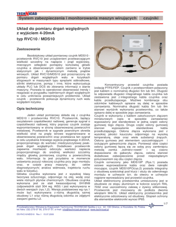 System zabezpieczenia i monitorowania maszyn wiruj cych czujniki Układ do pomiaru drga wzgl dnych z wyj ciem 4-20mA typ RVC10 / MDS10 Zastosowanie Bezdotykowy układ pomiarowy czujnik MDS10 przetwornik RVC10 jest urz dzeniem przetwarzaj cym wielko szczeliny na napi cie i pr d wyj ciowy, mierz cym odległo pomi dzy ko cówk główki czujnika a obserwowanym celem zarówno w trybie statycznym jak i dynamicznym metod pr dów wirowych. Układ RVC10/MDS10 jest przeznaczony do pomiaru drga wzgl dnych wału w łozyskach slizgowych w maszynach typu spr arki od rodkowe, siliniki elektryczne, pompy i inne, które wykorzystuja układy PLC lub DCS do zbierania informacji o stanie maszyny. Pozwala to operatorowi obserwowa trendy i reagowa w przypadku nadmiernych drga wzgl dnych w celu unikniecia powa niejszych problemów. Układ czujnik - przetwornik pokazuje dynamiczny ruch wału wzgl dem ło yska. Opis techniczny Jeden układ pomiarowy składa si z czujnika MDS10 i przetwornika RVC10. Przetwornik, b d cy oscylatorem cz stotliwo ci radiowej, generuje sygnał o cz stotliwo ci radiowej, który poprzez czujnik zostaje wypromieniowany w stron obserwowanej powierzchni metalowej. Przetwornik w sygnale powrotnym okre la wielko strat na pr dy wirowe wygenerowane w obserwowanej powierzchni oraz przetwarza ten sygnał w celu uzyskania liniowego wyj cia pr dowego 4-20mA, proporcjonalnego do warto ci miedzyszczytowej peakpeak drga wzgl dnych. Dodatkowo przetwornik zapewnia mozliwo odzczytu warto ci napiecia proporcjonalnego do sredniej wielko ci szczeliny mi dzy głowk pomiarow czujnika a powierzchni wału. Informacja ta jest przydatna w momencie ustawiania pozycji roboczej czujnika przy jego monta u oraz, w czasie pracy maszyny, do celów diagnostycznych( analiza widmowa, trajektoria ruchu wału w ło ysku). Główka czujnika wykonana jest z wysokiej klasy tworzywa sztucznego, odpornego na olej, wod oraz wiele ró nych płynów chemicznych. Obudowa czujnika wykonana jest ze stali kwasoodpornej 0H18N9 (odpowiednik stali 304 wg. AISI) i jest wykonywana w dwóch wersjach (rys.1,2). Wersja podstawowa wg rys.1 mo e by wykonywana z ró n długo i samej obudowy L1 oraz ró n długo ci odcinka ze zdj tymi zwojami gwintu L2. Koncentryczny przewód czujnika posiada izolacj PTFE/FEP. Czujnik z przetwornikiem połaczony jest kablem o nominalnej długo ci 5m lub 9m. Długo ta odpowiada długo ci integralnego kabla czujnika lub zestawiona jest z integralnego kabla czujnika oraz kabla przedłu ajacego. Mo liwe kombinacje obu odcinków kablowych opisane s dalej w sposobie zamawiania. Nominalna długo kabla 5m lub 9m stanowi wyró nik wykonania przetwornika, co tak e opisano dalej w sposobie jego zamawiania. Czujnik w wykonaniu z kablem zako czonym zł czem miniaturowym (opis w sposobie zamawiania) wyposa ony jest standardowo w jedn cz osłony gumowej tego zł cza. Druga cz osłony gumowej stanowi wyposa enie standardowe kabla przedłu aj cego. Osłona zł cza wykonana jest z wysokiej jako ci kauczuku odpornego na wysok temperatur , oleje oraz wiele substancji r cych. Osłona gumowa jest elementem uszczelniaj cym i izoluj cym galwanicznie zł cze. Poniewa obie cz ci osłony gumowej ł cz si ze sob przy zamkni ciu metod zamka „kołnierz-rowek” i s ciasno dopasowane do gabarytu zł cza, osłona stanowi dodatkowe zabezpieczenie przed niepo danym poluzowaniem si obu cz ci zł cza. Czujnik oznaczony jako MDS10P (Rys.1) posiada osiowe wyprowadzenie kabla oraz dwie nakr tki mocuj ce, czujnik MDS10PO(rys.2) posiada integralny z obudow sze ciok t pod klucz i słu y do odwrotnego monta u w uchwycie tzn. do otworu w uchwycie najpierw wprowadzany jest przewód czujnika. Układ elektroniczny przetwornika umieszczony jest w obudowie ze stopu aluminium w kolorze szarym RAL 7032 oraz uszczelniony zalew z ywicy silikonowej. Przetwornik jest mocowany do podło a dwoma wkr tami M4x16. Układ elektryczny przetwornika jest elektrycznie odizolowany od obudowy. Stopie ochrony dla elementów elektroniki wynosi IP65. 1/7 Przedsi biorstwo Wdra ania Diagnostyki Technicznej TECHNICAD Spółka z o.o. 44 -100 Gliwice, ul Kozielska 18, Polska tel./faks: (32) 279 07 56, 279 07 57, e-mail: [email protected], www.technicad.pl DS-RVC10/MDS10 Rev.1 15.07.2008 System zabezpieczenia i monitorowania maszyn wiruj cych Przetwornik zasilany jest napi ciem stałym 24VDC. Wyj cie przetwornika 4-20mA oraz napi ciowe (dost pne na listwie zaciskowej oraz na gnie dzie BNC) s glwanicznie odizolowane od napiecia zasilania . W przypadku przerwy lub zwarcia na kablu czujnika pr d wyjsciowy 4-20mA spada do warto ci poni ej 0,1mA. Połaczenie przetwornika RVC10 z układem PLC wymaga dwóch par przewodów, zapewniaj cych zasilanie oraz odbiór sygnału wyj ciowego 4-20mA. Do wykonania trasy kablowej pomi dzy przetwornikiem a wzmacniaczem pomiarowym wymagany jest kabel typu skr tka trzech ył w ekranie o przekroju 0,5 do 1mm2. Sygnał wyj ciowy 4-20mA mo e byc przesyłany maksymalnie na odległo c do 5km. Listwa zaciskowa umieszczona wewn trz obudowy przetwornika posiada siedem zacisków rubowych: yła kabla czujnika, ekran kabla czujnika, zasilanie 0V, zasilanie 24VDC, dwa zaciski pr du wyj ciowego oraz jeden zacisk napi cia szczeliny roboczej. Układ czujnik - przetwornik jest fabrycznie kalibrowany na nominalny zakres pomiarowy drga od 100 do 500µm p-p ( patrz Sposób zamawiania). Szczelina robocza czujnika od 0,5 do 2,5 mm odpowiada napi ciu wyj ciowemu na gniazdu BNC i na zacisku rubowym od 4 do 20VDC. Czujniki, kable przedłu aj ce i przetworniki s wzajemnie zamienialne dla tej samej długo ci kabla czujnika, kabla przedłu aj cego oraz sumarycznej długo ci kabla w odniesieniu do wykonania przetwornika. Bez indywidualnej kalibracji bł d liniowo ci (przy +22oC) układu pomiarowego przy wymianie dowolnego z tych trzech elementów mo e wzrosn do ±3%. Dane techniczne METROLOGICZNE Wielko mierzona: - drgania wzgl dne w µm jako warto mi dzyszczytowa ( peak - peak) przemies