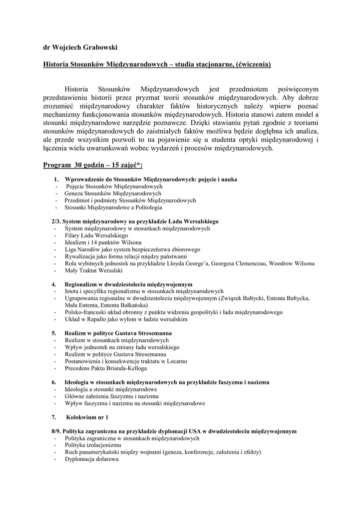 dr Wojciech Grabowski Historia Stosunków Międzynarodowych – studia stacjonarne, (ćwiczenia) Historia Stosunków Międzynarodowych jest przedmiotem poświęconym przedstawieniu historii przez pryzmat teorii stosunków międzynarodowych. Aby dobrze zrozumieć międzynarodowy charakter faktów historycznych należy wpierw poznać mechanizmy funkcjonowania stosunków międzynarodowych. Historia stanowi zatem model a stosunki międzynarodowe narzędzie poznawcze. Dzięki stawianiu pytań zgodnie z teoriami stosunków międzynarodowych do zaistniałych faktów możliwa będzie dogłębna ich analiza, ale przede wszystkim pozwoli to na pojawienie się u studenta optyki międzynarodowej i łączenia wielu uwarunkowań wobec wydarzeń i procesów międzynarodowych. Program 30 godzin – 15 zajęć*: 1. Wprowadzenie do Stosunków Międzynarodowych: pojęcie i nauka - Pojęcie Stosunków Międzynarodowych - Geneza Stosunków Międzynarodowych - Przedmiot i podmioty Stosunków Międzynarodowych - Stosunki Międzynarodowe a Politologia 2/3. System międzynarodowy na przykładzie Ładu Wersalskiego - System międzynarodowy w stosunkach międzynarodowych - Filary Ładu Wersalskiego - Idealizm i 14 punktów Wilsona - Liga Narodów jako system bezpieczeństwa zbiorowego - Rywalizacja jako forma relacji między państwami - Rola wybitnych jednostek na przykładzie Lloyda George’a, Georgesa Clemenceau, Woodrow Wilsona - Mały Traktat Wersalski 4. - Regionalizm w dwudziestoleciu międzywojennym Istota i specyfika regionalizmu w stosunkach międzynarodowych Ugrupowania regionalne w dwudziestoleciu międzywojennym (Związek Bałtycki, Ententa Bałtycka, Mała Ententa, Ententa Bałkańska) Polsko-francuski układ obronny z punktu widzenia geopolityki i ładu międzynarodowego Układ w Rapallo jako wyłom w ładzie wersalskim 5. - Realizm w polityce Gustava Stresemanna Realizm w stosunkach międzynarodowych Wpływ jednostek na zmiany ładu wersalskiego Realizm w polityce Gustava Stresemanna Postanowienia i konsekwencje traktatu w Locarno Precedens Paktu Brianda-Kelloga 6. - Ideologia w stosunkach międzynarodowych na przykładzie faszyzmu i nazizmu Ideologia a stosunki międzynarodowe Główne założenia faszyzmu i nazizmu Wpływ faszyzmu i nazizmu na stosunki międzynarodowe 7. Kolokwium nr 1 8/9. Polityka zagraniczna na przykładzie dyplomacji USA w dwudziestoleciu międzywojennym - Polityka zagraniczna w stosunkach międzynarodowych - Polityka izolacjonizmu - Ruch panamerykański między wojnami (geneza, konferencje, założenia i efekty) - Dyplomacja dolarowa - Dyplomacja kanonierek Teoria demokratycznego pokoju Polityka Dobrego Sąsiedztwa 10. - Konflikty zbrojne i budowanie państwa Konflikty zbrojne w stosunkach międzynarodowych Konflikty o Gran Chaco i Letycje oraz ich funkcje Budowanie państwa na przykładzie Kanady 11. - Geopolityka a Bliski Wschód Rudolf Kjellen Bliski Wschód w koncepcjach geopolitycznych Przestrzeń, realizm, asymetria i region na przykładzie Bliskiego Wschodu 12. - Terroryzm międzynarodowy na przykładzie konfliktu izraelsko-palestyńskiego Terroryzm w stosunkach międzynarodowych Terroryzm w konflikcie izraelsko-palestyńskim – działalność głównych ugrupowań Cechy wspólne państw muzułmańskich – podsumowanie 13. - Daleki Wschód i Azja Środkowa w okresie międzywojennym Relacje radziecko – japońskie Agresja japońska na Mandżurię i utworzenie Mandżuko Reakcja międzynarodowa na wojnę w Mandżurii Wojna chińsko-japońska (przyczyny i reakcja międzynarodowa) Afganistan i Indie w okresie międzywojennym 14. Kolokwium nr 2 Literatura: 1) Dobrzycki W., Historia Stosunków Międzynarodowych w czasach nowożytnych 1815-1945, Warszawa 1996, 2) Sierpowski S., Źródła do historii powszechnej okresu międzywojennego t.1, Poznań 1989 3) Dobrzycki W., System międzyamerykański, Warszawa 2002 4) (red) Bartnicki A., Zarys dziejów Afryki i Azji 1869-1996, Warszawa 1996 5) Bartnicki A. Traktat wersalski, Warszawa 1967 6) Bartnicki A., Konflikty kolonialne 1869 – 1939, Warszawa 1971 7) Bartnicki A., Egipt i Sudan w polityce Wielkiej Brytanii 1882-1936, Warszawa 1974 8) Bułhak H., Polska-Francja. Z dziejów sojuszu 1922-1939, Warszawa 1993 9) Ciałowicz J., Polsko-francuski sojusz wojskowy 1921-1939, Warszawa 1970 10) Wituch T., Tureckie przemiany. Dzieje Turcji 1878-1923, Warszawa 1980 11) Stępniewska-Holzer B., Holzer J. , Egipt – stulecie przemian, Warszawa 2006 12) Zdanowski J., Arabia Saudyjska, Warszawa 2004 13) Keddie N.R.,, Współczesny Iran, Źródła i konsekwencje rewolucji, Kraków 2007 14) Chojnowski A., Tomaszewski J., Izrael – historia państw świata w XX wieku, Warszawa 2001 15) (red) Wojciechowski M., Traktat Ryski po 75 latach , Toruń 1998 16) Zins H., Historia Afryki Wschodniej, Wrocław 1986 17) Kołodziejczyk. D, Turcja, Warszawa 2000 18) Dziekan M., Historia Iraku, Warszawa 2002 19) Ożarowski R., Ideologia na Bliskim Wschodzie, Gdańsk 2006 20) Dokumenty : - Pakt Ligi Narodów - Doktryna Estrady 1930 Pakt Brianda-Kellogga Deklaracja o niestosowaniu przemocy pomiędzy Niemcami a Polską 1934 Polsko-Radziecki Pakt o nieagresji 1932 Polityka dobrego sąsiedztwa (przemówienie Roosevelta) 1933 Pakt Saavedry-Lamasa 1933 Pakt Czterech Program ten stanowi przedmiot prawa autorskiego i podlega ochronie prawnej Copyright©Wojciech Grabowski. Wszystkie prawa zastrzeżone.