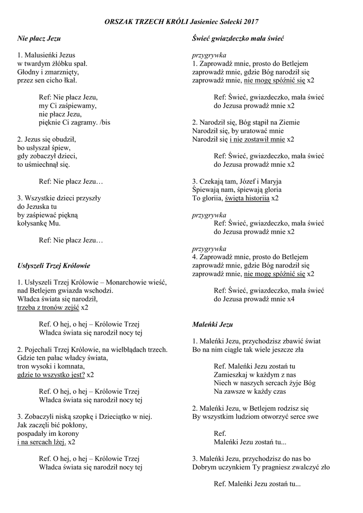 ORSZAK TRZECH KRÓLI Jasieniec Solecki 2017 Nie płacz Jezu Świeć gwiazdeczko mała świeć 1. Malusieńki Jezus w twardym żłóbku spał. Głodny i zmarznięty, przez sen cicho łkał. przygrywka 1. Zaprowadź mnie, prosto do Betlejem zaprowadź mnie, gdzie Bóg narodził się zaprowadź mnie, nie mogę spóźnić się x2 Ref: Nie płacz Jezu, my Ci zaśpiewamy, nie płacz Jezu, pięknie Ci zagramy. /bis 2. Jezus się obudził, bo usłyszał śpiew, gdy zobaczył dzieci, to uśmiechnął się. Ref: Nie płacz Jezu… 3. Wszystkie dzieci przyszły do Jezuska tu by zaśpiewać piękną kołysankę Mu. Ref: Świeć, gwiazdeczko, mała świeć do Jezusa prowadź mnie x2 2. Narodził się, Bóg stąpił na Ziemie Narodził się, by uratować mnie Narodził się i nie zostawił mnie x2 Ref: Świeć, gwiazdeczko, mała świeć do Jezusa prowadź mnie x2 3. Czekają tam, Józef i Maryja Śpiewają nam, śpiewają gloria To gloriia, święta historiia x2 przygrywka Ref: Świeć, gwiazdeczko, mała świeć do Jezusa prowadź mnie x2 Ref: Nie płacz Jezu… Usłyszeli Trzej Królowie 1. Usłyszeli Trzej Królowie – Monarchowie wieść, nad Betlejem gwiazda wschodzi. Władca świata się narodził, trzeba z tronów zejść x2 Ref. O hej, o hej – Królowie Trzej Władca świata się narodził nocy tej 2. Pojechali Trzej Królowie, na wielbłądach trzech. Gdzie ten pałac władcy świata, tron wysoki i komnata, gdzie to wszystko jest? x2 Ref. O hej, o hej – Królowie Trzej Władca świata się narodził nocy tej 3. Zobaczyli niską szopkę i Dzieciątko w niej. Jak zaczęli bić pokłony, pospadały im korony i na sercach lżej. x2 Ref. O hej, o hej – Królowie Trzej Władca świata się narodził nocy tej przygrywka 4. Zaprowadź mnie, prosto do Betlejem zaprowadź mnie, gdzie Bóg narodził się zaprowadź mnie, nie mogę spóźnić się x2 Ref: Świeć, gwiazdeczko, mała świeć do Jezusa prowadź mnie x4 Maleńki Jezu 1. Maleńki Jezu, przychodzisz zbawić świat Bo na nim ciągle tak wiele jeszcze zła Ref. Maleńki Jezu zostań tu Zamieszkaj w każdym z nas Niech w naszych sercach żyje Bóg Na zawsze w każdy czas 2. Maleńki Jezu, w Betlejem rodzisz się By wszystkim ludziom otworzyć serce swe Ref. Maleńki Jezu zostań tu... 3. Maleńki Jezu, przychodzisz do nas bo Dobrym uczynkiem Ty pragniesz zwalczyć zło Ref. Maleńki Jezu zostań tu... Skrzypi wóz 1. Skrzypi wóz, wielki mróz wielki mróz na ziemi. x2 Ref. Trzej królowie jadą złoto, mirrę kładą. Hej, kolęda, kolęda. x2 2. A komu takiemu Dzieciątku małemu. x2 Ref. Cóż to za Dzieciątko, musi być paniątko. Hej, kolęda, kolęda. x2 3. To Jezus maluśki, to Dzieciątko krasne. x2 Ref. Cichutkie, malutkie jak słoneczko jasne. Hej, kolęda, kolęda. x2 4. Pasterze na lirze, na skrzypeczkach grali. x2 Ref. Beztroscy do szopy prędko podążali. Hej, kolęda, kolęda. x2 5. Pójdę ja do Niego poproszę od Niego. x2 Ref. „Daj nam Boże Dziecię pokój na tym świecie” Hej, kolęda, kolęda. x2