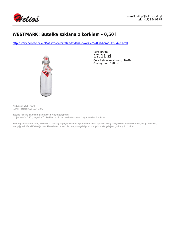 e-mail: [email protected] tel. : (17) 854 91 85 WESTMARK: Butelka szklana z korkiem - 0,50 l http://stary.helios-szklo.pl/westmark-butelka-szklana-z-korkiem--050-l-produkt-5420.html Cena brutto: 17.11 zł Cena katalogowa brutto: 19.00 zł Oszczędzasz: 1,89 zł Producent: WESTMARK Numer katalogowy: 6624 2270 Butelka szklana z korkiem patentowym / hermetycznym: - pojemność – 0,50 l, wysokość z korkiem – 26 cm, dno kwadratowe o wymiarach – 6 x 6 cm Produkty niemieckiej firmy WESTMARK, zostały zaprojektowane i opracowane przez wysokiej klasy specjalistów z adekwatnie wysoką niemiecką precyzją. WESTMARK oferuje szeroki wachlarz produktów pomysłowych i praktycznych, służących jako gadżety do kuchni.