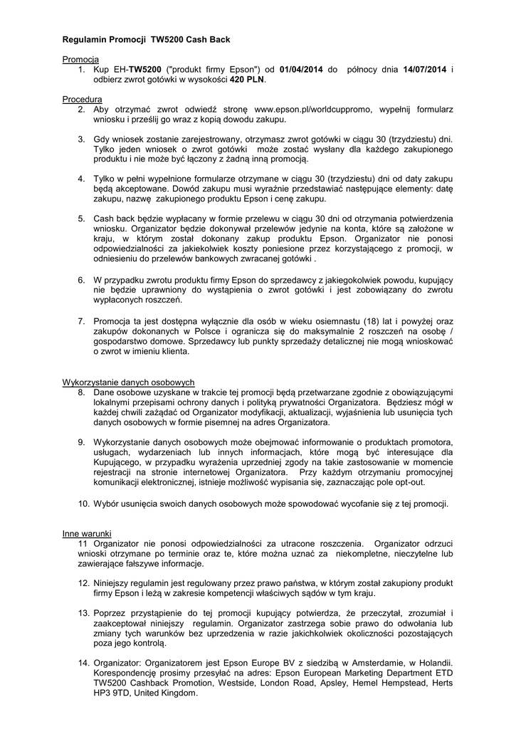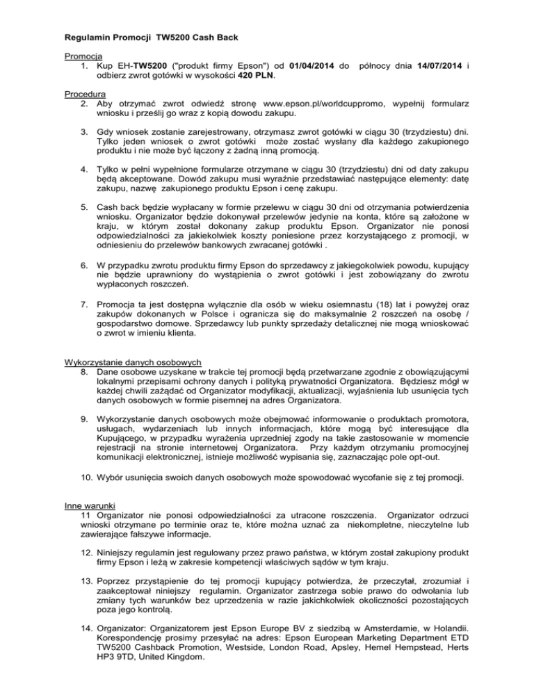 Regulamin Promocji TW5200 Cash Back Promocja 1. Kup EH