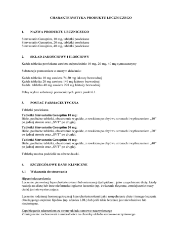 CHARAKTERYSTYKA PRODUKTU LECZNICZEGO 1. NAZWA PRODUKTU LECZNICZEGO Simvastatin Genoptim, 10 mg, tabletki powlekane Simvastatin Genoptim, 20 mg, tabletki powlekane Simvastatin Genoptim, 40 mg, tabletki powlekane 2. SKŁAD JAKOŚCIOWY I ILOŚCIOWY Każda tabletka powlekana zawiera odpowiednio 10 mg, 20 mg, 40 mg symwastatyny Substancje pomocnicze o znanym działaniu: Każda tabletka 10 mg zawiera 74,50 mg laktozy bezwodnej Każda tabletka 20 mg zawiera 149 mg laktozy bezwodnej Każda tabletka 40 mg zawiera 298 mg laktozy bezwodnej Pełny wykaz substancji pomocniczych, patrz punkt 6.1. 3. POSTAĆ FARMACEUTYCZNA Tabletki powlekane. Tabletki Simvastatin Genoptim 10 mg: Białe, podłużne tabletki, obustronnie wypukłe, z rowkiem po obydwu stronach i wytłoczeniem „10” po jednej stronie oraz „SVT” po drugiej. Tabletki Simvastatin Genoptim 20 mg: Białe, podłużne tabletki, obustronnie wypukłe, z rowkiem po obydwu stronach i wytłoczeniem „20” po jednej stronie oraz „SVT” po drugiej. Tabletki Simvastatin Genoptim 40 mg: Białe, podłużne tabletki, obustronnie wypukłe, z rowkiem po obydwu stronach i wytłoczeniem „40” po jednej stronie oraz „SVT” po drugiej. Tabletkę można podzielić na równe dawki. 4. SZCZEGÓŁOWE DANE KLINICZNE 4.1 Wskazania do stosowania Hipercholesterolemia Leczenie pierwotnej hipercholesterolemii lub mieszanej dyslipidemii, jako uzupełnienie diety, kiedy reakcja na dietę lub inne niefarmakologiczne leczenie (np. ćwiczenia fizyczne, zmniejszenie masy ciała) jest niewystarczająca. Leczenie rodzinnej homozygotycznej hipercholesterolemii jako uzupełnienie diety i innego leczenia obniżającego stężenie lipidów (np. afereza LDL) lub jeśli takie leczenie jest niewłaściwe lub niedostępne. Zapobieganie zdarzeniom ze strony układu sercowo-naczyniowego Zmniejszenie zachorowań i umieralności na choroby układu sercowo-naczyniowego u pacjentów z jawną miażdżycą naczyń serca lub cukrzycą, z prawidłowym lub podwyższonym stężeniem cholesterolu, jako leczenie wspomagające, mające na celu skorygowanie innych czynników ryzyka lub uzupełnienie innej terapii zapobiegającej chorobom serca (patrz punkt 5.1). 4.2 Dawkowanie i sposób podawania Zakres dawkowania to 5-80 mg podawane raz na dobę, doustnie, wieczorem. Jeśli jest to konieczne, dawkę należy korygować w odstępach co najmniej 4 tygodni do maksymalnie 80 mg podawanych raz na dobę, wieczorem. Dawka 80 mg na dobę jest zalecana tylko pacjentom z ciężką hipercholesterolemią i z dużym ryzykiem powikłań ze strony układu sercowo-naczyniowego, którzy nie osiągnęli celów leczenia przy pomocy niższych dawek oraz kiedy spodziewane korzyści leczenia przewyższają potencjalne ryzyko (patrz punkt 4.4 i 5.1). Hipercholesterolemia Pacjent powinien stosować standardową niskocholesterolową dietę, którą należy kontynuować podczas leczenia produktem leczniczym Simvastatin Genoptim. Zazwyczaj początkową dawką jest 10-20 mg na dobę, wieczorem. U pacjentów, u których konieczne jest znaczne obniżenie LDL-C (powyżej 45%), można rozpocząć od dawki 20-40 mg raz na dobę, podawanej wieczorem. Jeśli konieczna jest korekta dawki, należy ją przeprowadzić tak, jak opisano powyżej. Rodzinna homozygotyczna hipercholesterolemia W oparciu o wyniki kontrolowanych badań klinicznych, zalecane początkowe dawkowanie produktu leczniczego Simvastatin Genoptim to 40 mg raz na dobę, wieczorem W tej grupie pacjentów, Simvastatin Genoptim należy stosować jako lek uzupełniający inne metody leczenia zmniejszające stężenia lipidów (np. afereza LDL) lub jeśli takie leczenie jest niedostępne lub niewłaściwe. Zapobieganie zdarzeniom ze strony układu sercowo-naczyniowego Zalecaną dawką produktu leczniczego Simvastatin Genoptim u pacjentów z dużym ryzykiem wystąpienia zdarzeń wieńcowych (choroba wieńcowa, z hiperlipidemią lub bez) jest 20 do 40 mg na dobę, w pojedynczej dawce wieczorem. Leczenie może być rozpoczęte jednocześnie ze stosowaniem diety i ćwiczeniami fizycznymi. Jeśli konieczna jest korekta dawkowania, należy ją przeprowadzić tak, jak opisano powyżej. Jednoczesne stosowanie z innymi lekami zmniejszającymi stężenie lipidów Simvastatin Genoptim jest skuteczny w monoterapii lub w skojarzeniu z preparatami wiążącymi kwasy żółciowe. Preparat należy podawać albo nie mniej niż 2 godziny przed lub nie mniej niż 4 godziny po podaniu preparatów wiążących kwasy żółciowe. Pacjenci przyjmujący jednocześnie z produktem leczniczym Simvastatin Genoptim fibraty, inne niż gemfibrozyl (patrz punkt 4.3) lub fenofibrat nie powinni mogą stosować dobowej dawki produktu leczniczego Simvastatin Genoptim większej niż 10 mg na dobę. Pacjenci przyjmujący jednocześnie z produktem leczniczym Simvastatin Genoptim amiodaron, amlodypinę, werapamil lub diltiazem nie powinni stosować dawki produktu leczniczego Simvastatin Genoptim większej niż 20 mg na dobę (patrz punkty 4.4. i 4.5). Pacjenci z niewydolnością nerek Nie ma konieczności zmiany dawkowania u pacjentów z łagodną lub umiarkowaną niewydolnością nerek. U pacjentów z ciężką niewydolnością nerek (klirens kreatyniny < 30 ml/min) należy bardzo starannie rozważyć podawanie dawki większej niż 10 mg na dobę i jeśli jest to niezbędne, bardzo ostrożnie rozpocząć leczenie. Pacjenci w podeszłym wieku Nie ma potrzeby dostosowania dawkowania. 2 Dzieci i młodzież (w wieku 10-17 lat) Zwykle zalecana dawka początkowa dla dzieci i młodzieży (chłopców w fazie II i powyżej wg skali Tannera oraz dziewcząt, u których minął co najmniej jeden rok od pierwszej miesiączki, w wieku 10 17 lat) z heterozygotyczną hipercholesterolemią rodzinną wynosi 10 mg raz na dobę wieczorem. Przed rozpoczęciem leczenia symwastatyną u dzieci i młodzieży należy zastosować standardową dietę obniżającą poziom cholesterolu; dietę należy kontynuować w trakcie leczen