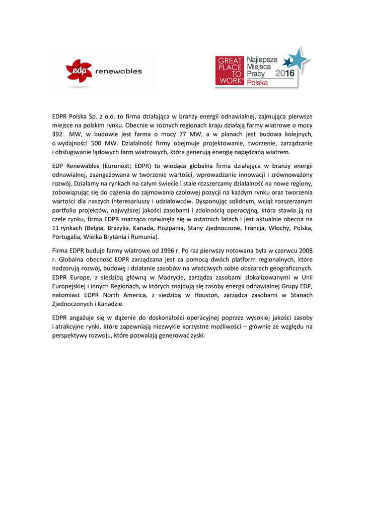 EDPR Polska Sp. z o.o. to firma działająca w branży energii odnawialnej, zajmująca pierwsze miejsce na polskim rynku. Obecnie w różnych regionach kraju działają farmy wiatrowe o mocy 392 MW, w budowie jest farma o mocy 77 MW, a w planach jest budowa kolejnych, o wydajności 500 MW. Działalność firmy obejmuje projektowanie, tworzenie, zarządzanie i obsługiwanie lądowych farm wiatrowych, które generują energię napędzaną wiatrem. EDP Renewables (Euronext: EDPR) to wiodąca globalna firma działająca w branży energii odnawialnej, zaangażowana w tworzenie wartości, wprowadzanie innowacji i zrównoważony rozwój. Działamy na rynkach na całym świecie i stale rozszerzamy działalność na nowe regiony, zobowiązując się do dążenia do zajmowania czołowej pozycji na każdym rynku oraz tworzenia wartości dla naszych interesariuszy i udziałowców. Dysponując solidnym, wciąż rozszerzanym portfolio projektów, najwyższej jakości zasobami i zdolnością operacyjną, która stawia ją na czele rynku, firma EDPR znacząco rozwinęła się w ostatnich latach i jest aktualnie obecna na 11 rynkach (Belgia, Brazylia, Kanada, Hiszpania, Stany Zjednoczone, Francja, Włochy, Polska, Portugalia, Wielka Brytania i Rumunia). Firma EDPR buduje farmy wiatrowe od 1996 r. Po raz pierwszy notowana była w czerwcu 2008 r. Globalna obecność EDPR zarządzana jest za pomocą dwóch platform regionalnych, które nadzorują rozwój, budowę i działanie zasobów na właściwych sobie obszarach geograficznych. EDPR Europe, z siedzibą główną w Madrycie, zarządza zasobami zlokalizowanymi w Unii Europejskiej i innych Regionach, w których znajdują się zasoby energii odnawialnej Grupy EDP, natomiast EDPR North America, z siedzibą w Houston, zarządza zasobami w Stanach Zjednoczonych i Kanadzie. EDPR angażuje się w dążenie do doskonałości operacyjnej poprzez wysokiej jakości zasoby i atrakcyjne rynki, które zapewniają niezwykle korzystne możliwości – głównie ze względu na perspektywy rozwoju, które pozwalają generować zyski. Lead Now to innowacyjny program rozwojowy dla nowych kierowników i kierownictwa średniego szczebla w EDPR. Jego celem jest przekazanie wartości zawartych w modelu przywództwa EDP oraz dostarczenie praktycznych informacji wspomagających zarządzanie ludźmi w Firmie. Program Lead Now wskazuje rolę, którą Kierownicy muszą przyjąć w zarządzaniu Zasobami Ludzkimi. W ramach codziennych zajęć Kierownik musi poznać bliżej swoich współpracowników i zrozumieć relację między nimi, ponieważ ma odgrywać w zespole główną rolę w zakresie zarządzania Zasobami Ludzkimi. Dlatego ważne jest, aby Kierownik przede wszystkim rozumiał i stosował model przywództwa EDP oraz poznał wszystkie narzędzia, które mogą mu pomóc w zarządzaniu zespołem. Firma EDPR jest przekonana, że przestrzeganie tych zaleceń i procedur pozwoli Kierownikom zachęcać i motywować zespoły oraz zatrzymywać w nich utalentowane osoby, co ma kluczowe znaczenie dla Organizacji. Przeprowadzenie programu Lead Now zajmuje dwa dni. Najpierw organizowana jest sesja z firmą zewnętrzną specjalizującą się w rozwoju umiejętności „miękkich”, podczas której uczestnicy odkrywają, jakim są typem kierownika, poznają profile członków zespołów i wreszcie, korzystając ze zdobytej wiedzy, przekształcają cechy dobrych kierowników w cechy przywódców. Następnie zespół ds. HR ogląda z kierownikami prezentację, która inspiruje ich i przypomina o roli we wszystkich wewnętrznych procesach HR. Lead Now kończy się opracowaniem Planu Działania zawierającego wnioski, który będzie realizowany od momentu zakończenia szkolenia. Realizację Planu będą śledzić Dyrektorzy pierwszej linii. Ponadto niektórzy uczestnicy mogą zostać wybrani do Programu Coachingowego, przedstawionego w zeszłym roku w ramach najlepszych praktyk, aby korzystali z dalszych możliwości rozwoju. Aplikacja EDPR HR! Czasy się zmieniają, a z nimi ludzie. Musimy dostosować się do nowych kanałów komunikacji; dlatego stworzyliśmy aplikację EDPR HR, która jest dostępna dla wszystkich naszych pracowników. Posiada ona różne sekcje: wydarzeń, do której dział HR może przesyłać wiadomości dotyczące planowanych wydarzeń, oraz dokumentów, zawierającą interesujące informacje, takie jak wydania miesięcznika HR, przydatne informacje dotyczące np. podróży, ubezpieczenia zdrowotnego czy ubezpieczenia na życie w Polsce. W ten sposób wszystkie polskie zespoły mogą łatwo uzyskać dostęp do informacji w sytuacji awaryjnej. Aby uczcić wprowadzenie aplikacji EDPR HR, przygotowaliśmy dla wszystkich pracowników mały prezent — firmowy bank energii dla smartf