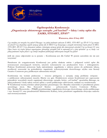 Ogólnopolska Konferencja „Organizacje zbiorowego zarządu „od kuchni” – fakty i mity opłat dla ZAIKS, STOART, ZPAV” Warszawa, dnia 15 luty 2011 Czy możliwa jest muzyka bez opłat? Dlaczego i na jakiej podstawie opłacam ZAIKS, STOART czy ZPAV? Czy można nie płacić? Czy dozwolony użytek wyłącza opłaty dla ZAIKS? Czy korzystając z muzyki internetowej trzeba płacić ZAIKS, STOART, ZPAV? Czy abonament radiowo- telewizyjny wyłącza opłaty dla stowarzyszeń artystów? Czy za licencje CC oraz Open Source też trzeba opłacać organizacjom zbiorowego zarządu? Jak to naprawdę jest z tymi opłatami- za co, kiedy i na jakiej podstawie trzeba płacić i czy istnieje możliwość publicznego odtwarzania muzyki bez opłat? Jeśli nie znasz odpowiedzi na te pytanie – Konferencja jest dla Ciebie! W prawie autorskim nic nie jest oczywiste! Pretekstem do zorganizowania Konferencji jest próba obalenia mitów i półprawd wokół opłat dla stowarzyszeń zrzeszających twórców, artystów wykonawców czy producentów fono- i wideogramów. Podczas Konferencji poruszone będą najważniejsze zagadnienia z zakresu prawa do pobierania inkasa, możliwość zrzeczenie się pośrednictwa organizacji, wykorzystywania dozwolonego użytku oraz licencji Creative Commons przy publicznym odtwarzania muzyki. Konferencja ma wymiar praktyczny – wszyscy prelegenci, z autopsji, znają problemy związane z publicznym odtwarzaniem muzyki, filmów czy gier. Dodatkowym atutem Konferencji jest zaproszenie prawników wszystkich trzech organizacji zbiorowego zarządu, którzy „od kuchni” opowiedzą dlaczego, na jakiej podstawie i kiedy należy wnosić opłaty z tytułu publicznego odtworzenie, nadania czy reemitowania. W Konferencji wezmą również udział prawnicy prezentujący tzw. liberalne stanowisko w przedmiocie prawa autorskiego (m.in. Mec. Krzysztof Siewicz - pełnomocnik Creative Commons Polska, Mec. Monika Brzozowska – PD&B) przedstawiający zagadnienia dotyczące dozwolonego użytku publicznego i tzw. licencji CC oraz przedstawiciel Ministerstwa Kultury, który przedstawi zagadnienia dotyczące nadzoru nad stowarzyszeniami. www.wirtualnakultura.pl 1 Warszawa, 15 luty 2011 r. Organizacje zbiorowego zarządu „od kuchni” – fakty i mity opłat dla stowarzyszeń artystów, autorów i producentów. Wszystko co chciałbyś wiedzieć a wstydzisz się zapytać 10.00 10.10 11.00 12.00 12.45 13.15 14.OO Organizacje zbiorowego zarządu – po co istnieją, kogo chronią, jak działają – wstęp do Konferencji Mec. Monika Brzozowska – adwokat, ekspert z zakresu prawa autorskiego, partner w kancelarii PD&B Jakich autorów i na jakiej podstawie chroni organizacja ZAIKS? W czasie prezentacji przedstawione zostaną zagadnienia dotyczące pól ekspolatacji, na jakich działa ZAIKS, tabel wynagrodzeń jakimi się posługuje, możliwości ewentualnego negocjowanie cen, problematyki związane z autorami, którzy nie są członkami ZAIKS ani nie powierzyli praw w zarząd – jaka jest podstawa do pobierania inkasa? Jakie podmioty są uprawnione do wpłacania inkasa dla ZAIKS i w jakich przypadkach? Podczas wykładu zostanie również wskazana problematyka artystów zagranicznych, których chroni ZAIKS Mec. Anna Biernacka – radca prawny Stowarzyszenia Autorów ZAIKS Artyści wykonawcy i ich ochrona na przykładzie organizacji STOART – kiedy i na jakiej podstawie prawnej pobierane zostają tantiemy? W czasie wykładu przedstawione zostaną zagadnienia dotyczące pól ekspolatacji, na jakich działa STOART, tabel wynagrodzeń jakimi się posługuje, możliwości ewentualnego negocjowanie cen, problematyki związane z autorami, którzy nie są członkami STOART ani nie powierzyli praw w zarząd – jaka jest podstawa do pobierania tantiem? Jakie podmioty są uprawnione do wpłacania inkasa dla STOART i w jakich przypadkach? Podczas prezentacji zostanie również przedstawiona problematyka artystów wykonawców zagranicznych oraz możliwości rozpowszechniania ich artystycznych wykonań i wizerunków. mec. Marcin Lassota, adwokat, obsługuje ZAW STOART Ministerstwo Kultury a Organizacje zbiorowego zarządu – problematyka dzieł osieroconych, organizacja właściwa, komisja prawa autorskiego, nadzór nad organizacjami Mec. Dominik Skoczek – Dyrektor Departamentu Własności Intelektualnej i Mediów Ministerstwa Kultury i Dziedzictwa Narodowego Lunch Fonogramy i videogramy – opłaty producenckie na podstawie Związku Producentów Audio- Video Problematyka opłat od działalności internetowej, kiedy i za co należy płacić, czym różnią się fonogramy od wideogramów mec. Krzysztof Czyżewski, adwokat, zajmuje się prawem własności intelektualnej od 10 lat Dozwolony użytek prywatny i publiczny – czyli czy prawo pozwala nie płacić organizacjom zbiorowego zarządu? Podczas wystąpienia poruszone zostaną zagadnienia dotyczące dozwolonego użytku publicznego, w szczególności kwestie związane z pobieraniem opłat z tytułu publicznego słuchania radia, oglądania telewizji jak również organizowania imprez niebiletowanych czy kulturalnych – czy wówczas również trzeba płacić? Podczas wystąpienia poruszone zostaną kwestie dotyczące DJ –ów, organizowania imprez komercyjnych w tym np. imprezy masowej – koncertów, pikników itp., a także problematyka muzycznych royality free Mec. Monika Brzozowska – ekspert z zakresu prawa autorskiego i prawa nowych technologii, www.wirtualnakultura.pl 2 partner w Kancelarii PD&B 14.45 15.30. 16.30 17.00 Konieczność pośrednictwa organizacji zbiorowego zarządu Umowy o produkcje reklam, filmów; problematyka filmów jako insertów do gazet – komu, dlaczego i na jakiej podstawie należy płacić – problematyka art. 70 prawa autorskiego. Droit de suite, przedruk fotografii reporterskich, publiczne nadawania i remitowanie a konieczność pośrednictwa OZZ W czasie prezentacji przedstawione zostaną również zagadnienie dotyczące