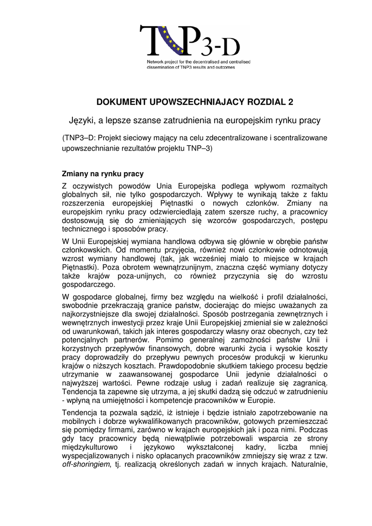 DOKUMENT UPOWSZECHNIAJACY ROZDIAL 2 Języki, a lepsze szanse zatrudnienia na europejskim rynku pracy (TNP3–D: Projekt sieciowy mający na celu zdecentralizowane i scentralizowane upowszechnianie rezultatów projektu TNP–3) Zmiany na rynku pracy Z oczywistych powodów Unia Europejska podlega wpływom rozmaitych globalnych sił, nie tylko gospodarczych. Wpływy te wynikają takŜe z faktu rozszerzenia europejskiej Piętnastki o nowych członków. Zmiany na europejskim rynku pracy odzwierciedlają zatem szersze ruchy, a pracownicy dostosowują się do zmieniających się wzorców gospodarczych, postępu technicznego i sposobów pracy. W Unii Europejskiej wymiana handlowa odbywa się głównie w obrębie państw członkowskich. Od momentu przyjęcia, równieŜ nowi członkowie odnotowują wzrost wymiany handlowej (tak, jak wcześniej miało to miejsce w krajach Piętnastki). Poza obrotem wewnątrzunijnym, znaczna część wymiany dotyczy takŜe krajów poza-unijnych, co równieŜ przyczynia się do wzrostu gospodarczego. W gospodarce globalnej, firmy bez względu na wielkość i profil działalności, swobodnie przekraczają granice państw, docierając do miejsc uwaŜanych za najkorzystniejsze dla swojej działalności. Sposób postrzegania zewnętrznych i wewnętrznych inwestycji przez kraje Unii Europejskiej zmieniał sie w zaleŜności od uwarunkowań, takich jak interes gospodarczy własny oraz obecnych, czy teŜ potencjalnych partnerów. Pomimo generalnej zamoŜności państw Unii i korzystnych przepływów finansowych, dobre warunki Ŝycia i wysokie koszty pracy doprowadziły do przepływu pewnych procesów produkcji w kierunku krajów o niŜszych kosztach. Prawdopodobnie skutkiem takiego procesu będzie utrzymanie w zaawansowanej gospodarce Unii jedynie działalności o najwyŜszej wartości. Pewne rodzaje usług i zadań realizuje się zagranicą. Tendencja ta zapewne się utrzyma, a jej skutki dadzą się odczuć w zatrudnieniu - wpłyną na umiejętności i kompetencje pracowników w Europie. Tendencja ta pozwala sądzić, iŜ istnieje i będzie istniało zapotrzebowanie na mobilnych i dobrze wykwalifikowanych pracowników, gotowych przemieszczać się pomiędzy firmami, zarówno w krajach europejskich jak i poza nimi. Podczas gdy tacy pracownicy będą niewątpliwie potrzebowali wsparcia ze strony międzykulturowo i językowo wykształconej kadry, liczba mniej wyspecjalizowanych i nisko opłacanych pracowników zmniejszy się wraz z tzw. off-shoringiem, tj. realizacją określonych zadań w innych krajach. Naturalnie, pewne zajęcia dla osób z niŜszymi kwalifikacjami na podstawowym poziomie będą nadal dostępne w niektórych sektorach usług. Obecne tendencje gospodarcze oznaczają mniejszą pewność zatrudnienia i bardziej elastyczne wzorce pracy, a zatem potrzebę stałego podwyŜszania kwalifikacji lub przechodzenia do zupełnie nowych dziedzin. Naturalnie, istnieją pewne róŜnice w poziomach zatrudnienia pomiędzy poszczególnymi krajami Unii Europejskiej, a nawet poszczególnymi regionami wchodzącymi w ich skład. Nowe państwa członkowskie, wraz z restrukturyzacją swojej gospodarki, doświadczyły stosunkowo wysokiego bezrobocia, obecnie jednak obserwują jego spadek. Europa juŜ teraz doświadcza migracji gospodarczej, spowodowanej wyŜszym poziomem wynagrodzeń, warunkami pracy lub potencjałem rozwojowym w poszczególnych krajach członkowskich. Exodus dotyczy dobrze wykwalifikowanych i wykształconych pracowników, którzy mieli trudności ze znalezieniem pracy we własnym kraju, zostali przyciągnięci przez wyŜsze wynagrodzenie lub lepsze moŜliwości pracy poza granicami kraju. Ponadto, dotyczy to równieŜ tych, którzy przemieszczają się w celu zdobycia mniej specjalistycznego zatrudnienia (np. w hotelarstwie, sprzedaŜy detalicznej, usługach). Przynosi to korzyści całej Unii, chociaŜ poszczególne kraje, czasami Ŝałują wkładu, który emigrujący obywatele mogliby wnieść do rozwijającej się gospodarki. Obecne wzory migracji w Europie wskazują na fakt, iŜ istnieje zapotrzebowanie na kompetencje językowe i międzykulturowe na poziomach od podstawowego do zaawansowanego. DuŜe przedsiębiorstwa i międzynarodowe korporacje stwarzają ogromne moŜliwości zatrudnienia w całej Europie, jednak małe i średnie firmy wciąŜ pozostają waŜnymi pracodawcami, zarówno w starych jak i nowych krajach członkowskich. W zaleŜności od zakresu działalności równieŜ one mogą być aktywnymi eksporterami i odgrywać waŜną rolę w podnoszeniu poziomu zatrudnienia i handlu. W celu utrzymania konkurencyjności w obliczu globalnej gospodarki naleŜy stale dbać o zwiększanie efektywności. Niektóre kraje wykazują w tym względzie bardzo korzystne statystyki. Z uwagi na współczesne trendy demograficzne, naleŜy jak najpełniej wykorzystać istniejące zasoby ludzkie. Zmieniające się potrzeby i pojawiające się nowe potrzeby Języki mają i będą miały coraz większe znaczenie dla realizacji róŜnych celów osób zatrudnionych na róŜnych poziomach gospodarki w Europie i poza nią. Choć obecnie obserwuje się podwyŜszoną świadomość znaczenia kompetencji językowych i międzykulturowych, trudno jest określić, które języki i jakie umiejętności wytworzą wartość dodaną. Ta kwestia stanowiła punkt wyjścia podprojektu 2. Grupa robocza tego podprojektu postawiła sobie za cel ustalenie, które umiejętności i kompetencje najprawdopodobniej poprawią szanse absolwentów na rynku pracy w Europie i poza nią. Grupa projektowa pragnęła zdobyć informacje oparte na niezbitych dowodach, czyli na dialogu ze światem pracy – głównie pracodawcami i absolwentami. Projekt w szczególności skupiał się na studentach i absolwentach studiów nie- językowych. NaleŜy pamiętać, Ŝe jeśli chodzi o kształcenie językowe, istniejące niegdyś wyraźne róŜnice pomiędzy studiami neofilologicznymi i innymi typami studiów szybko 