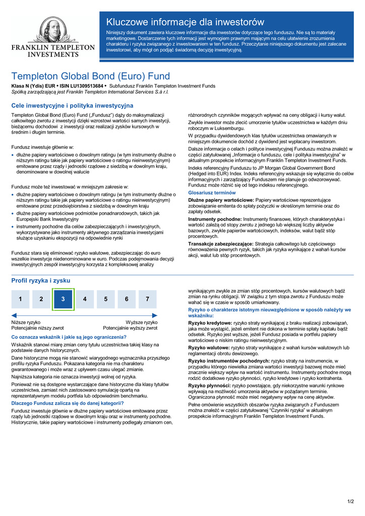 Kluczowe informacje dla inwestorów Niniejszy dokument zawiera kluczowe informacje dla inwestorów dotyczące tego funduszu. Nie są to materiały marketingowe. Dostarczenie tych informacji jest wymogiem prawnym mającym na celu ułatwienie zrozumienia charakteru i ryzyka związanego z inwestowaniem w ten fundusz. Przeczytanie niniejszego dokumentu jest zalecane inwestorowi, aby mógł on podjąć świadomą decyzję inwestycyjną. Templeton Global Bond (Euro) Fund Klasa N (Ydis) EUR • ISIN LU1309513684 • Subfundusz Franklin Templeton Investment Funds Spółką zarządzającą jest Franklin Templeton International Services S.à r.l. Cele inwestycyjne i polityka inwestycyjna Templeton Global Bond (Euro) Fund („Fundusz”) dąży do maksymalizacji całkowitego zwrotu z inwestycji dzięki wzrostowi wartości samych inwestycji, bieżącemu dochodowi z inwestycji oraz realizacji zysków kursowych w średnim i długim terminie. Fundusz inwestuje głównie w: · dłużne papiery wartościowe o dowolnym ratingu (w tym instrumenty dłużne o niższym ratingu takie jak papiery wartościowe o ratingu nieinwestycyjnym) emitowane przez rządy i jednostki rządowe z siedzibą w dowolnym kraju, denominowane w dowolnej walucie Fundusz może też inwestować w mniejszym zakresie w: · dłużne papiery wartościowe o dowolnym ratingu (w tym instrumenty dłużne o niższym ratingu takie jak papiery wartościowe o ratingu nieinwestycyjnym) emitowane przez przedsiębiorstwa z siedzibą w dowolnym kraju · dłużne papiery wartościowe podmiotów ponadnarodowych, takich jak Europejski Bank Inwestycyjny · instrumenty pochodne dla celów zabezpieczających i inwestycyjnych, wykorzystywane jako instrumenty aktywnego zarządzania inwestycjami służące uzyskaniu ekspozycji na odpowiednie rynki Fundusz stara się eliminować ryzyko walutowe, zabezpieczając do euro wszelkie inwestycje niedenominowane w euro. Podczas podejmowania decyzji inwestycyjnych zespół inwestycyjny korzysta z kompleksowej analizy różnorodnych czynników mogących wpływać na ceny obligacji i kursy walut. Zwykle inwestor może zlecić umorzenie tytułów uczestnictwa w każdym dniu roboczym w Luksemburgu. W przypadku dywidendowych klas tytułów uczestnictwa omawianych w niniejszym dokumencie dochód z dywidend jest wypłacany inwestorom. Dalsze informacje o celach i polityce inwestycyjnej Funduszu można znaleźć w części zatytułowanej „Informacje o funduszu, cele i polityka inwestycyjna” w aktualnym prospekcie informacyjnym Franklin Templeton Investment Funds. Indeks referencyjny Funduszu to JP Morgan Global Government Bond (Hedged into EUR) Index. Indeks referencyjny wskazuje się wyłącznie do celów informacyjnych i zarządzający Funduszem nie planuje go odwzorowywać. Fundusz może różnić się od tego indeksu referencyjnego. Glosariusz terminów Dłużne papiery wartościowe: Papiery wartościowe reprezentujące zobowiązanie emitenta do spłaty pożyczki w określonym terminie oraz do zapłaty odsetek. Instrumenty pochodne: Instrumenty finansowe, których charakterystyka i wartość zależą od stopy zwrotu z jednego lub większej liczby aktywów bazowych, zwykle papierów wartościowych, indeksów, walut bądź stóp procentowych. Transakcje zabezpieczające: Strategia całkowitego lub częściowego równoważenia pewnych ryzyk, takich jak ryzyka wynikające z wahań kursów akcji, walut lub stóp procentowych. Profil ryzyka i zysku 1 2 3 4 5 6 7 wynikającym zwykle ze zmian stóp procentowych, kursów walutowych bądź zmian na rynku obligacji. W związku z tym stopa zwrotu z Funduszu może wahać się w czasie w sposób umiarkowany. Ryzyko o charakterze istotnym nieuwzględnione w sposób należyty we wskaźniku: Niższe ryzyko Potencjalnie niższy zwrot Wyższe ryzyko Potencjalnie wyższy zwrot Co oznacza wskaźnik i jakie są jego ograniczenia? Wskaźnik stanowi miarę zmian ceny tytułu uczestnictwa takiej klasy na podstawie danych historycznych. Dane historyczne mogą nie stanowić wiarygodnego wyznacznika przyszłego profilu ryzyka Funduszu. Pokazana kategoria nie ma charakteru gwarantowanego i może wraz z upływem czasu ulegać zmianie. Ryzyko kredytowe: ryzyko straty wynikającej z braku realizacji zobowiązań, jaka może wystąpić, jeżeli emitent nie dokona w terminie spłaty kapitału bądź odsetek. Ryzyko jest wyższe, jeżeli Fundusz posiada w portfelu papiery wartościowe o niskim ratingu nieinwestycyjnym. Ryzyko walutowe: ryzyko straty wynikające z wahań kursów walutowych lub reglamentacji obrotu dewizowego. Najniższa kategoria nie oznacza inwestycji wolnej od ryzyka. Ryzyko instrumentów pochodnych: ryzyko straty na instrumencie, w przypadku którego niewielka zmiana wartości inwestycji bazowej może mieć znacznie większy wpływ na wartość instrumentu. Instrumenty pochodne mogą rodzić dodatkowe ryzyko płynności, ryzyko kredytowe i ryzyko kontrahenta. Ponieważ nie są dostępne wystarczające dane historyczne dla klasy tytułów uczestnictwa, zamiast nich zastosowano symulację opartą na reprezentatywnym modelu portfela lub odpowiednim benchmarku. Ryzyko płynności: ryzyko powstające, gdy niekorzystne warunki rynkowe wpływają na możliwość umorzenia aktywów w pożądanym terminie. Ograniczona płynność może mieć negatywny wpływ na cenę aktywów. Dlaczego Fundusz zalicza się do danej kategorii? Pełne omówienie wszystkich obszarów ryzyka związanych z Funduszem można znaleźć w części zatytułowanej “Czynniki ryzyka” w aktualnym prospekcie informacyjnym Franklin Templeton Investment Funds. Fundusz inwestuje głównie w dłużne papiery wartościowe emitowane przez rządy lub jednostki rządowe w dowolnym kraju oraz w instrumenty pochodne. Historycznie, takie papiery wartościowe i instrumenty podlegały zmianom cen, 1/2 Templeton Global Bond (Euro) Fund Opłaty Opłaty ponoszone przez inwestora służą pokryciu kosztów działalności Funduszu, w tym 
