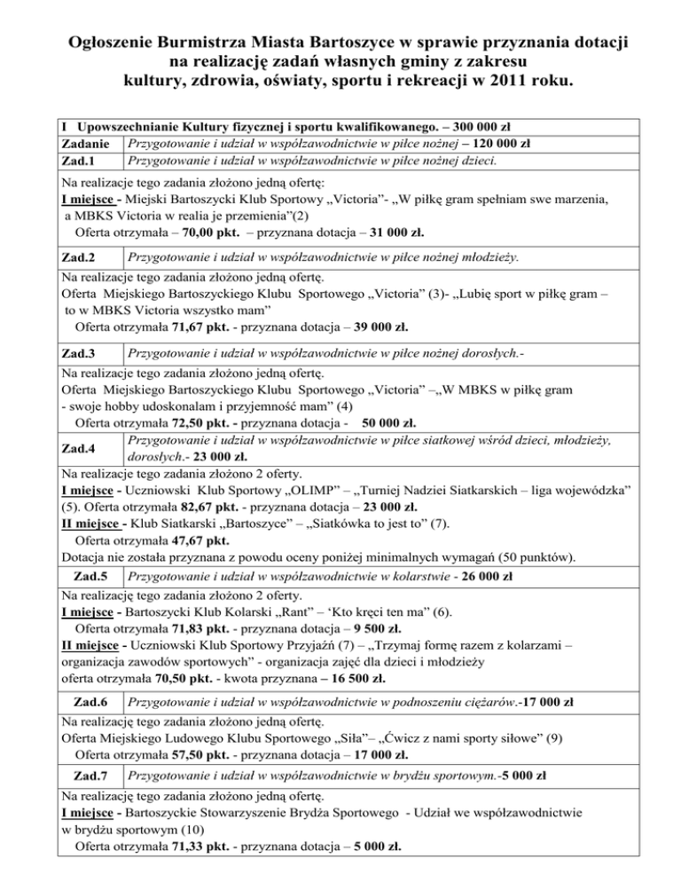Ogłoszenie Burmistrza Miasta Bartoszyce w sprawie przyznania dotacji na realizację zadań własnych gminy z zakresu kultury, zdrowia, oświaty, sportu i rekreacji w 2011 roku. I Upowszechnianie Kultury fizycznej i sportu kwalifikowanego. – 300 000 zł Zadanie Przygotowanie i udział w współzawodnictwie w piłce nożnej – 120 000 zł Przygotowanie i udział w współzawodnictwie w piłce nożnej dzieci. Zad.1 Na realizacje tego zadania złożono jedną ofertę: I miejsce - Miejski Bartoszycki Klub Sportowy „Victoria”- „W piłkę gram spełniam swe marzenia, a MBKS Victoria w realia je przemienia”(2) Oferta otrzymała – 70,00 pkt. – przyznana dotacja – 31 000 zł. Zad.2 Przygotowanie i udział w współzawodnictwie w piłce nożnej młodzieży. Na realizacje tego zadania złożono jedną ofertę. Oferta Miejskiego Bartoszyckiego Klubu Sportowego „Victoria” (3)- „Lubię sport w piłkę gram – to w MBKS Victoria wszystko mam” Oferta otrzymała 71,67 pkt. - przyznana dotacja – 39 000 zł. Zad.3 Przygotowanie i udział w współzawodnictwie w piłce nożnej dorosłych.- Na realizacje tego zadania złożono jedną ofertę. Oferta Miejskiego Bartoszyckiego Klubu Sportowego „Victoria” –„W MBKS w piłkę gram - swoje hobby udoskonalam i przyjemność mam” (4) Oferta otrzymała 72,50 pkt. - przyznana dotacja - 50 000 zł. Przygotowanie i udział w współzawodnictwie w piłce siatkowej wśród dzieci, młodzieży, Zad.4 dorosłych.- 23 000 zł. Na realizacje tego zadania złożono 2 oferty. I miejsce - Uczniowski Klub Sportowy „OLIMP” – „Turniej Nadziei Siatkarskich – liga wojewódzka” (5). Oferta otrzymała 82,67 pkt. - przyznana dotacja – 23 000 zł. II miejsce - Klub Siatkarski „Bartoszyce” – „Siatkówka to jest to” (7). Oferta otrzymała 47,67 pkt. Dotacja nie została przyznana z powodu oceny poniżej minimalnych wymagań (50 punktów). Zad.5 Przygotowanie i udział w współzawodnictwie w kolarstwie - 26 000 zł Na realizację tego zadania złożono 2 oferty. I miejsce - Bartoszycki Klub Kolarski „Rant” – ‘Kto kręci ten ma” (6). Oferta otrzymała 71,83 pkt. - przyznana dotacja – 9 500 zł. II miejsce - Uczniowski Klub Sportowy Przyjaźń (7) – „Trzymaj formę razem z kolarzami – organizacja zawodów sportowych” - organizacja zajęć dla dzieci i młodzieży oferta otrzymała 70,50 pkt. - kwota przyznana – 16 500 zł. Zad.6 Przygotowanie i udział w współzawodnictwie w podnoszeniu ciężarów.-17 000 zł Na realizację tego zadania złożono jedną ofertę. Oferta Miejskiego Ludowego Klubu Sportowego „Siła”– „Ćwicz z nami sporty siłowe” (9) Oferta otrzymała 57,50 pkt. - przyznana dotacja – 17 000 zł. Zad.7 Przygotowanie i udział w współzawodnictwie w brydżu sportowym.-5 000 zł Na realizację tego zadania złożono jedną ofertę. I miejsce - Bartoszyckie Stowarzyszenie Brydża Sportowego - Udział we współzawodnictwie w brydżu sportowym (10) Oferta otrzymała 71,33 pkt. - przyznana dotacja – 5 000 zł. Zad.8 Przygotowanie i udział w współzawodnictwie w lekkoatletyce (treningi, zawody)-20 000 zł Na realizację tego zadania złożono jedną ofertę. I miejsce - Uczniowski Klub Sportowy „Jedynka” - „Lekkoatletyka –wybieram zdrowie” (11) Oferta otrzymała 67,00 pkt. - przyznana dotacja – 20 000 zł. Zad.9 Przygotowanie i udział w współzawodnictwie w zawodach Ringo- 6 000 zł Na realizację tego zadania złożono jedną ofertę. I miejsce - Warmińsko-Mazurskie Towarzystwo Ringo– „Ringo polski sport dla wszystkich” (12) Oferta otrzymała 62,50 pkt. - przyznana dotacja – 5 000 zł. Zad.10 Organizacja zawodów sportowych.- 39 000 zł. Na realizację tego zadania złożono 11 ofert. I miejsce - Bartoszycki Klub Kyokushin Karate– „Ogólnopolski Turniej Karate Kyokushin” (13). Oferta otrzymała 78,00 pkt. - przyznana dotacja – 8 000 zł. II miejsce – Uczniowski Klub Sportowy „Olimp”- „VIII Wiosenny Turniej Piłki Siatkowej” (15). Oferta otrzymała 77,50 pkt. pkt. - przyznana dotacja – 1 170 zł. III miejsce - Bartoszycka Szkoła Teakwon-do - „II Mistrzostwa Bartoszyc w Teakwon-do ITF” (20). Oferta otrzymała 77,00 pkt. - przyznana dotacja – 1 200zł. IV miejsce – Stowarzyszenie Akademia Ruchu - „Eliminacje do Mistrzostw Polski Kickboxingu (19). Oferta otrzymała 76,67 pkt. pkt. - przyznana dotacja – 1 470 zł. V miejsce - Uczniowski Klub Sportowy Przyjaźń– „Trzymaj formę razem z kolarzami” - organizacja zajęć dla dzieci i młodzieży (17). Oferta otrzymała 67,50 pkt. pkt. - przyznana dotacja – 1 900 zł. VI miejsce – Warmińsko Mazurskie Towarzystwo „RINGO” – „Ringo sportowa promocja miasta” (22). Oferta otrzymała 65,00 pkt. pkt. - przyznana dotacja – 1 540 zł. VII miejsce - Klub Siatkarski „Bartoszyce” – „Turnieje siatkarskie” (21). Oferta otrzymała 63,33 pkt. - przyznana dotacja – 1 840zł. VIII miejsce - UKS „Jedynka” – „Bawmy się z mini piłką siatkową (16). Oferta otrzymała 61,33 pkt. - - 370 zł. Stowarzyszenie „Ożywić Łynę” – „Co ma płynąć nie zatonie” (14). Oferta nie kwalifikowana z powodu niezgodności niezgodność z zadaniem. Druga runda oceny Na realizację tego zadania komisja zakwalifikowała dwie oferty. I miejsce Stowarzyszenie Klub Motocyklowy „Wiraż” – „IV Runda PP w Mistrzostw Polski w Motocrossie (53). Oferta otrzymała 63,00 pkt. - przyznana dotacja – 15 000 zł. II miejsce – Stowarzyszenie Akademia Ruchu - „II Bartoszycki Nordic Walking” (18). Oferta otrzymała 55,17 pkt. - pkt. - przyznana dotacja – 550 zł. Zad.11 Przygotowanie i udział w sportowych imprezach strzeleckich.- 0 zł. Przygotowanie i udział w współzawodnictwie osób niepełnosprawnych. – 5 000 zł Zad.12 Na realizację tego zadania złożono jedną ofertę. I miejsce Oferta Stowarzyszenie Osób Niepełnosprawnych „SION”– „Niepełnosprawn