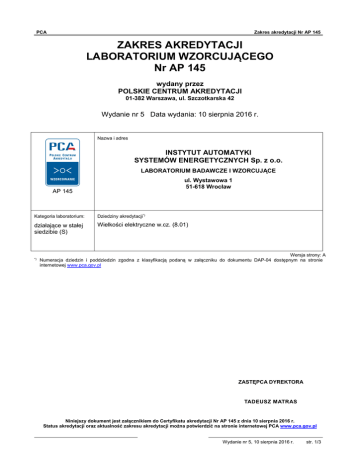 PCA Zakres akredytacji Nr AP 145 ZAKRES AKREDYTACJI LABORATORIUM WZORCUJĄCEGO Nr AP 145 wydany przez POLSKIE CENTRUM AKREDYTACJI 01-382 Warszawa, ul. Szczotkarska 42 Wydanie nr 5 Data wydania: 10 sierpnia 2016 r. Nazwa i adres INSTYTUT AUTOMATYKI SYSTEMÓW ENERGETYCZNYCH Sp. z o.o. LABORATORIUM BADAWCZE I WZORCUJĄCE ul. Wystawowa 1 51-618 Wrocław AP 145 Kategoria laboratorium: Dziedziny akredytacji*) działające w stałej siedzibie (S) Wielkości elektryczne w.cz. (8.01) *) Wersja strony: A Numeracja dziedzin i poddziedzin zgodna z klasyfikacją podaną w załączniku do dokumentu DAP-04 dostępnym na stronie internetowej www.pca.gov.pl ZASTĘPCA DYREKTORA TADEUSZ MATRAS Niniejszy dokument jest załącznikiem do Certyfikatu akredytacji Nr AP 145 z dnia 10 sierpnia 2016 r. Status akredytacji oraz aktualność zakresu akredytacji można potwierdzić na stronie internetowej PCA www.pca.gov.pl Wydanie nr 5, 10 sierpnia 2016 r. str. 1/3 PCA Zakres akredytacji Nr AP 145 Nazwa wielkości fizycznej i rodzaj obiektu wzorcowania 8 Wielkości elektryczne w.cz. 8.01 wielkości elektryczne w.cz. generatory wyładowań elektrostatycznych (ESD): - napięcie wyjściowe - wartość szczytowa prądu wyładowania - czas narastania prądu wyładowania - prąd wyładowania po 30 ns - prąd wyładowania po 60 ns generatory serii szybkich elektrycznych stanów przejściowych (EFT/B) wraz z układami sprzęgającymi: - wartość szczytowa napięcia - czas narastania impulsu - czas trwania impulsu - czas trwania serii impulsów - okres serii impulsów - częstotliwość impulsów w serii generatory przebiegu złożonego CWG wraz z układami sprzęgającymi: - wartość szczytowa napięcia obwodu otwartego - czas trwania czoła napięcia obwodu otwartego - czas trwania napięcia obwodu otwartego - wartość szczytowa prądu zwarciowego - czas trwania czoła prądu zwarciowego - czas trwania prądu zwarciowego - efektywna impedancja wyjściowa Zakres pomiarowy (2 ÷ 30) kV (5 ÷ 35) A (0,5 ÷ 1,5) ns (2 ÷ 21) A (1 ÷ 11) A Niepewność pomiaru CMC 3,0 6,0 8,0 8,0 8,0 Kat. Lab. Identyfikacja metody S LB-IT07 PN-EN 61000-4-2:2011 % % % % % LB-IT05 PN-EN 61000-4-4:2010 +A1:2010 (0,2 ÷ 4,8) kV (3 ÷ 7) ns (30 ÷ 200) ns (0,5 ÷ 20) ms (200 ÷ 400) ms (2 ÷ 120) kHz 6,0 5,5 4,0 4,0 4,0 4,0 % % % % % % LB-IT05A PN-EN 61000-4-4:2013 -05 LB-IT06 PN-EN 61000-4-5:2010 (0,2 ÷ 7) kV 5% (0,5 ÷ 20) µs 7% (10 ÷ 1000) µs 6% (5 ÷ 3800) A (1,5 ÷ 15) µs (15 ÷ 400) µs (1,5 ÷ 45) Ω 5 5 6 5 LB-IT06A PN-EN 61000-4-5:2014 -10 % % % % Wersja strony: B Niepewność pomiaru CMC stanowi niepewność rozszerzoną przy prawdopodobieństwie rozszerzenia ok. 95 %. Wartość wyrażona w procentach dotyczy procentowego udziału wartości wielkości mierzonej. Wydanie nr 5, 10 sierpnia 2016 r. str. 2/3 PCA Zakres akredytacji Nr AP 145 Wykaz zmian Zakresu Akredytacji Nr AP 145 Numer strony 2/3 Aktualna wersja strony B Zastępuje wersję strony A Data zmiany 01.09.2016 r. Zatwierdzam status zmian ZASTĘPCA DYREKTORA HOLOGRAM HOLOGRAM HOLOGRAM HOLOGRAM TADEUSZ MATRAS dnia: 01.09.2016 r. Wydanie nr 5, 10 sierpnia 2016 r. str. 3/3